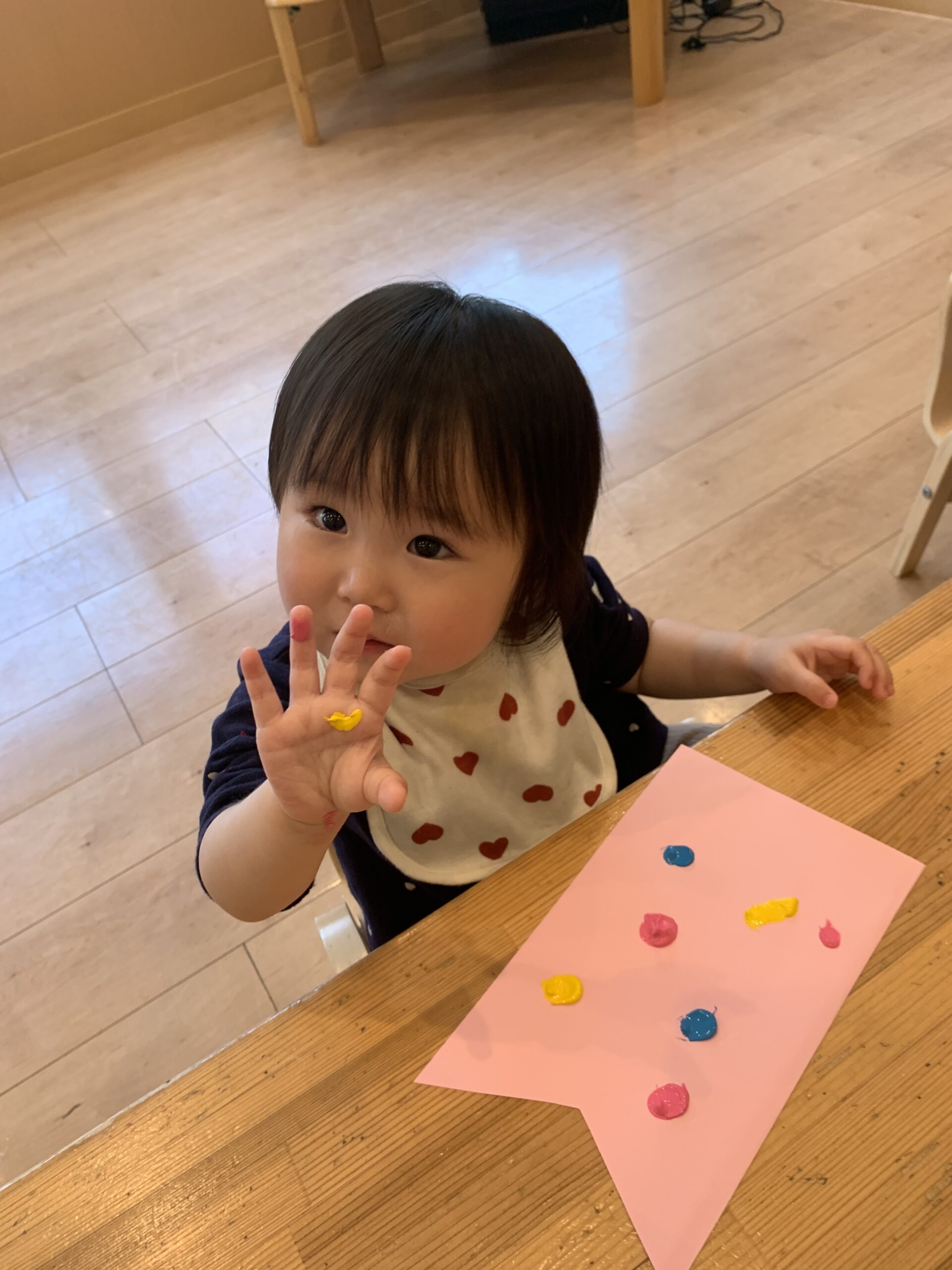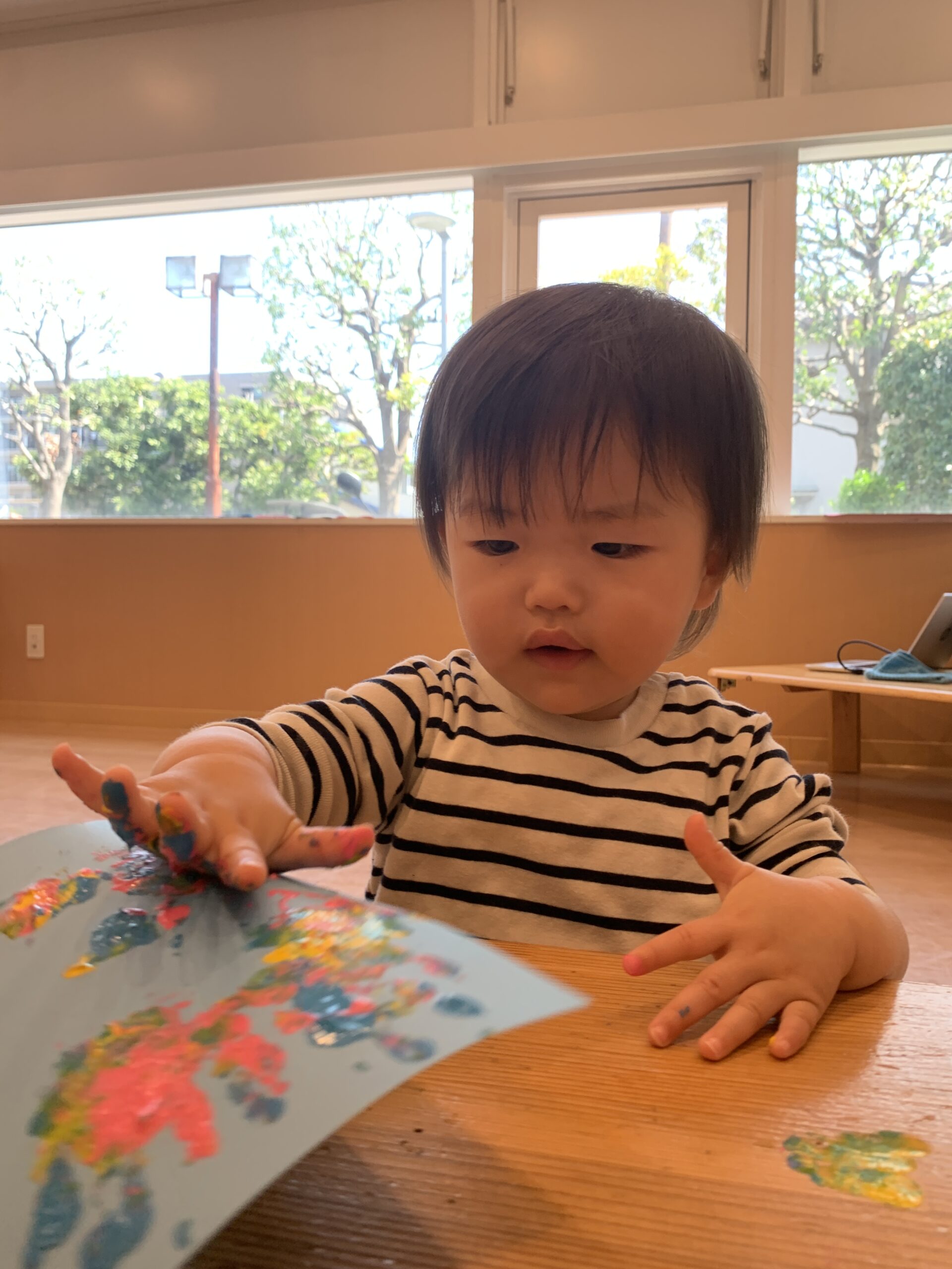 初めて絵の具に触れる子も多いと思います。初めての感触に「なんだこれ!?」と言った表情の子が多かったですが不思議そうな表情で見つめる子も♬