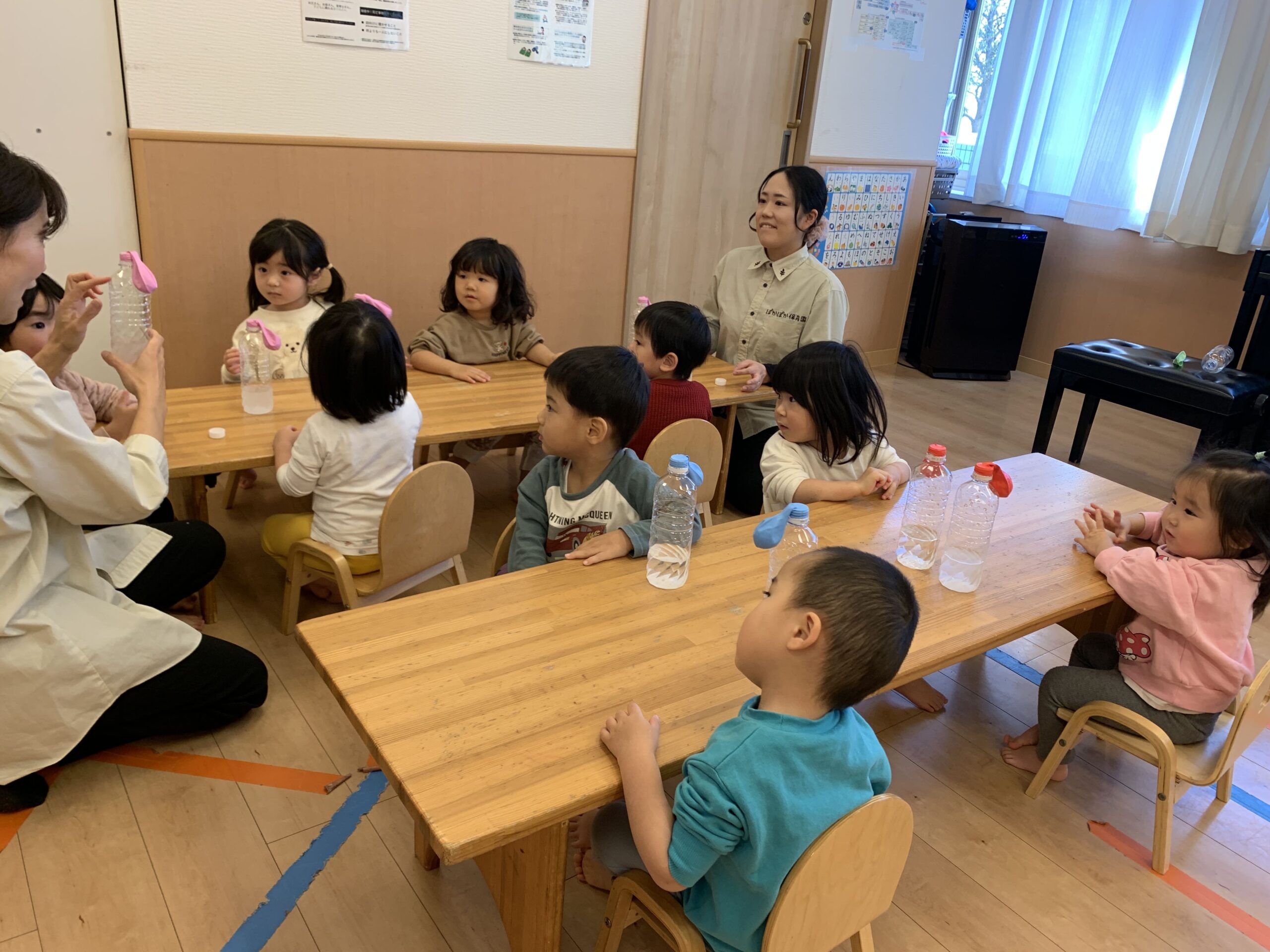 一方、虹組さん(2歳児クラス)は、サイエンス実験からスタートです!