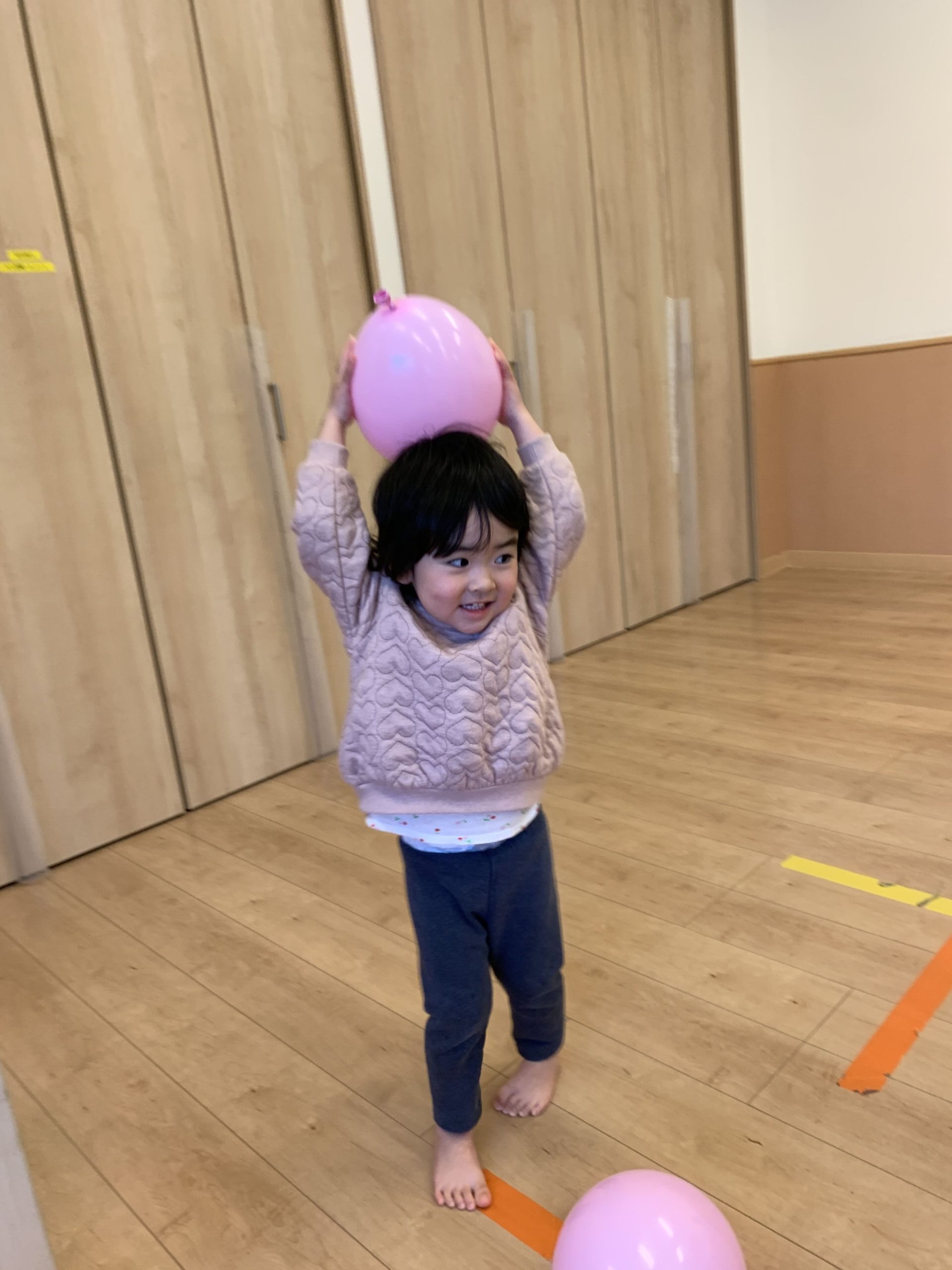 先生が「この風船を頭に乗せて歩けるかな?」と提案すると、