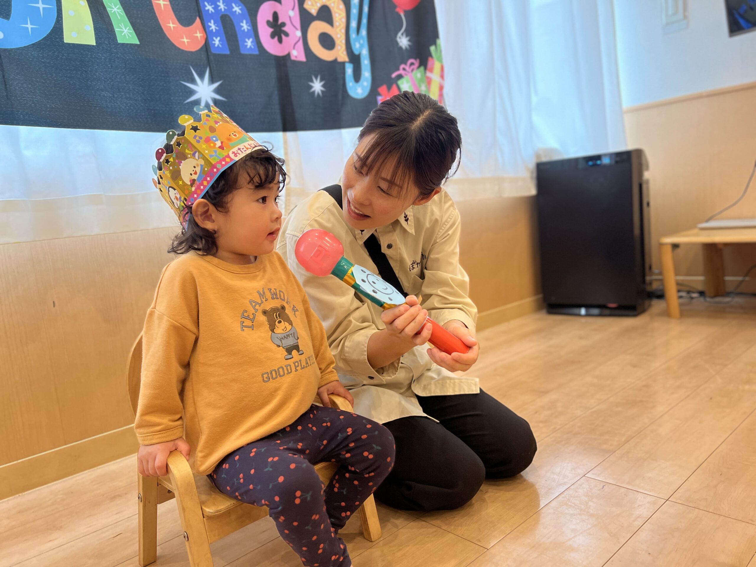 「おなまえはなんですか?」「なんさいになりましたか?」と先生からのインタビューに、ちょっぴり恥ずかしそうにしながらも「〇〇です!」「2さい!」と嬉しそうに答える姿に、見ている子どもたちも大喜び。「おめでとう〜!」の声が飛び交い、あたたかなお祝いの時間となりました。