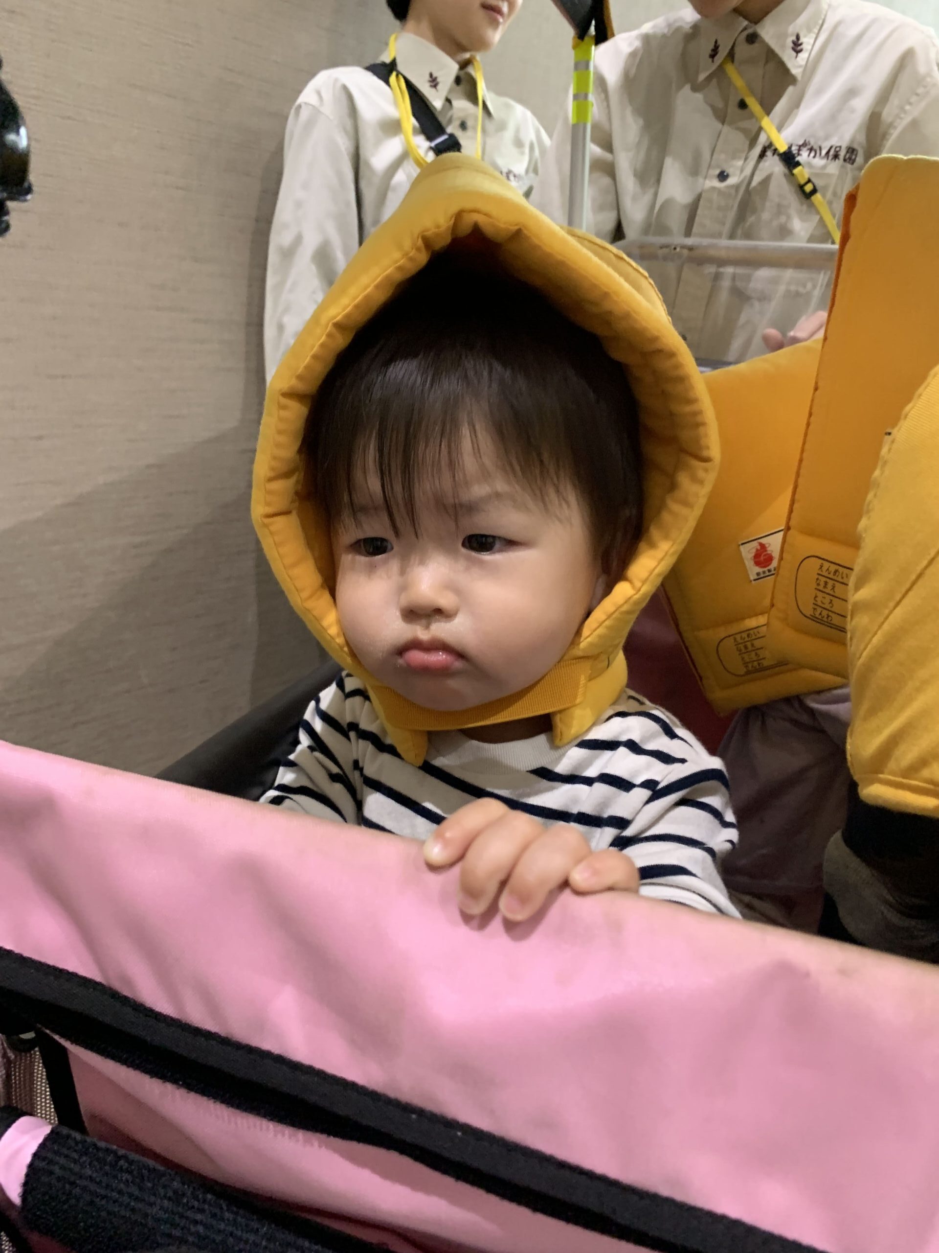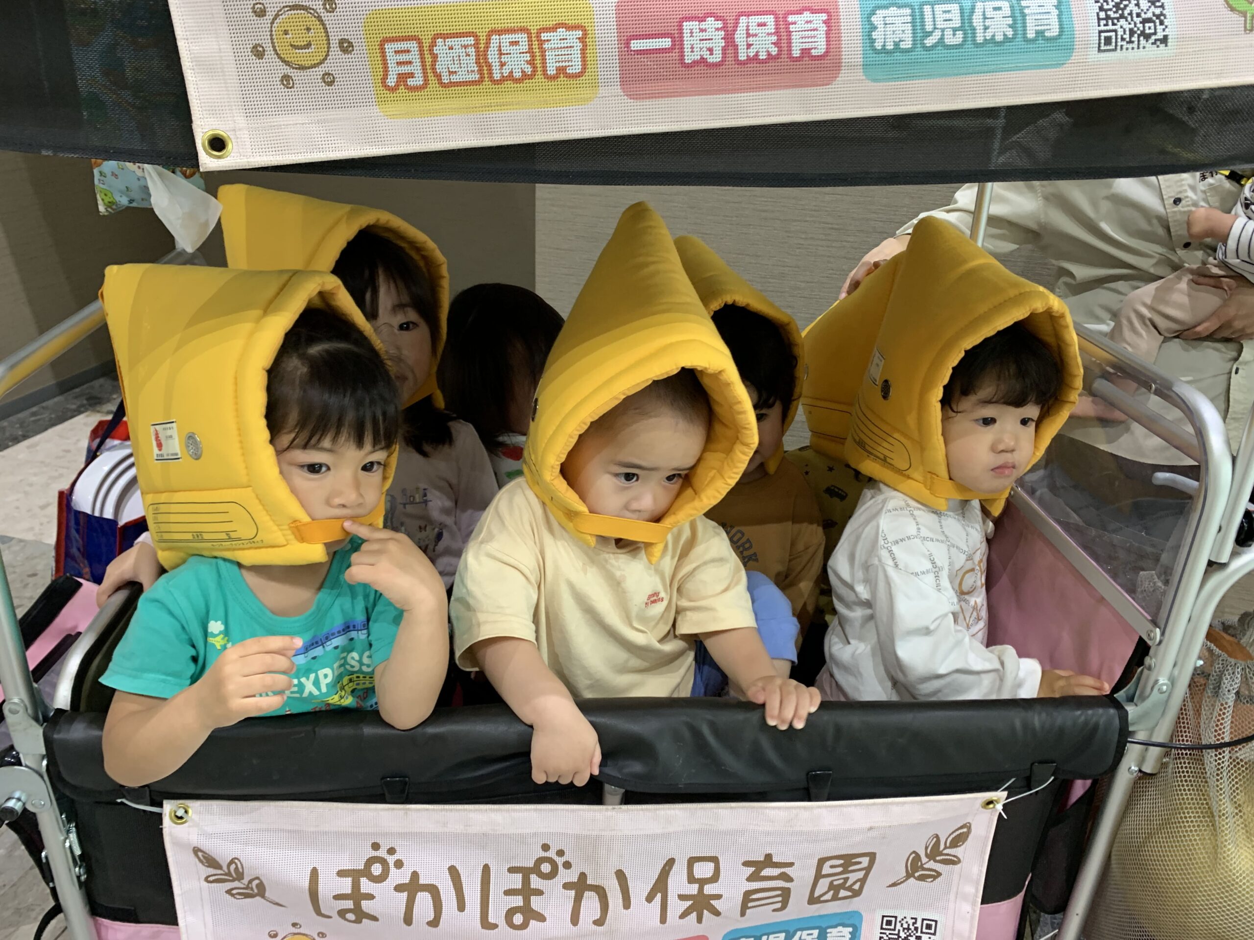お誕生日会のあとは、全クラスで避難訓練を実施。今回は地震からの火災を想定した訓練でした。急なサイレンの音に驚いて泣き出す子もいましたが、保育士が「先生の声をよく聞いてね、大丈夫だよ」とやさしく声をかけると、落ち着いて避難することができました!