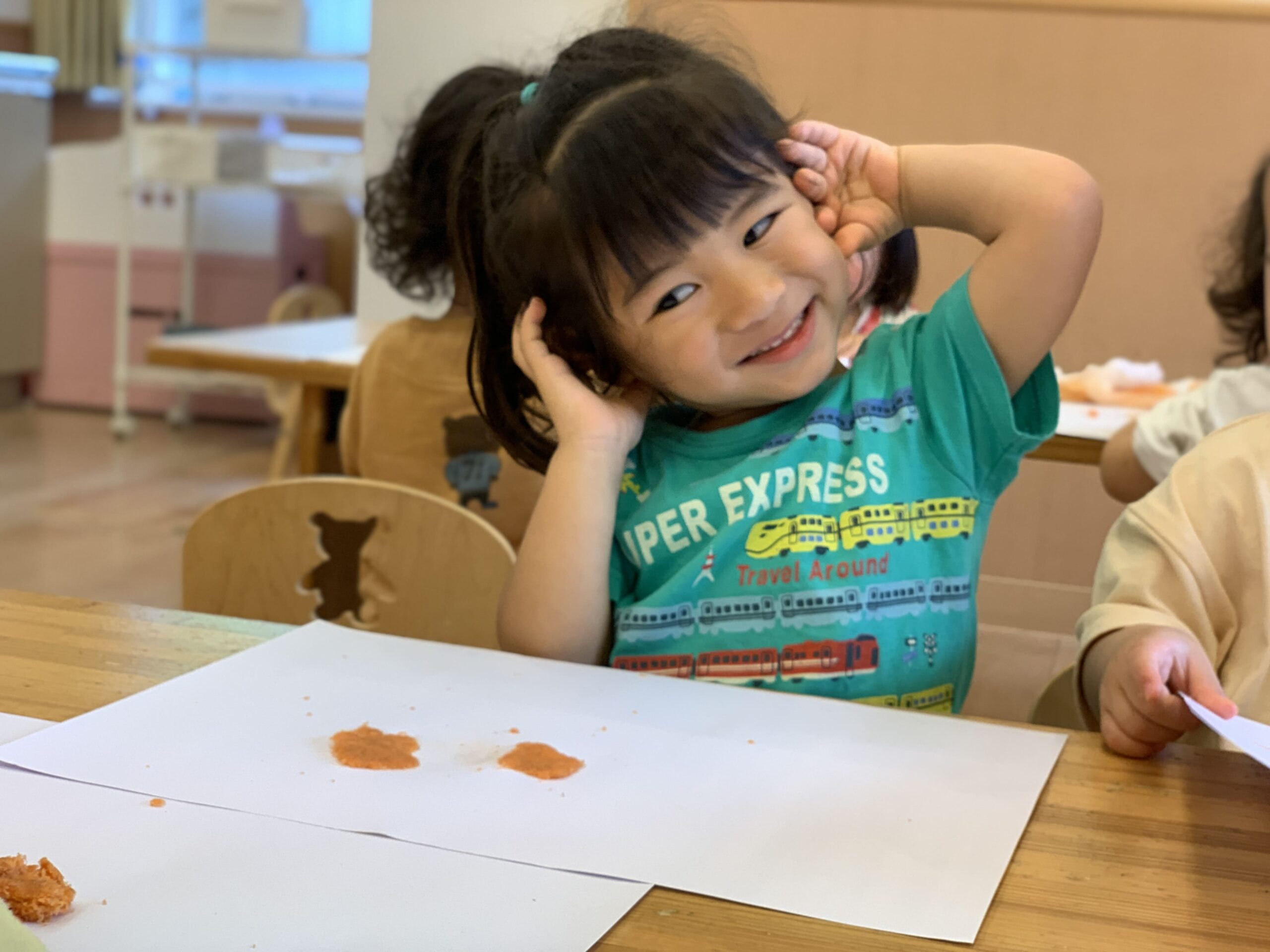 避難訓練のあとは、虹組さんがにんじんをテーマにしたサイエンス活動を行いました。「これ、にんじんだね!」と手に取ったり、「おろすとどうなるのかな?」と、すりおろし器でにんじんを削る様子を興味津々で見つめる子どもたち。