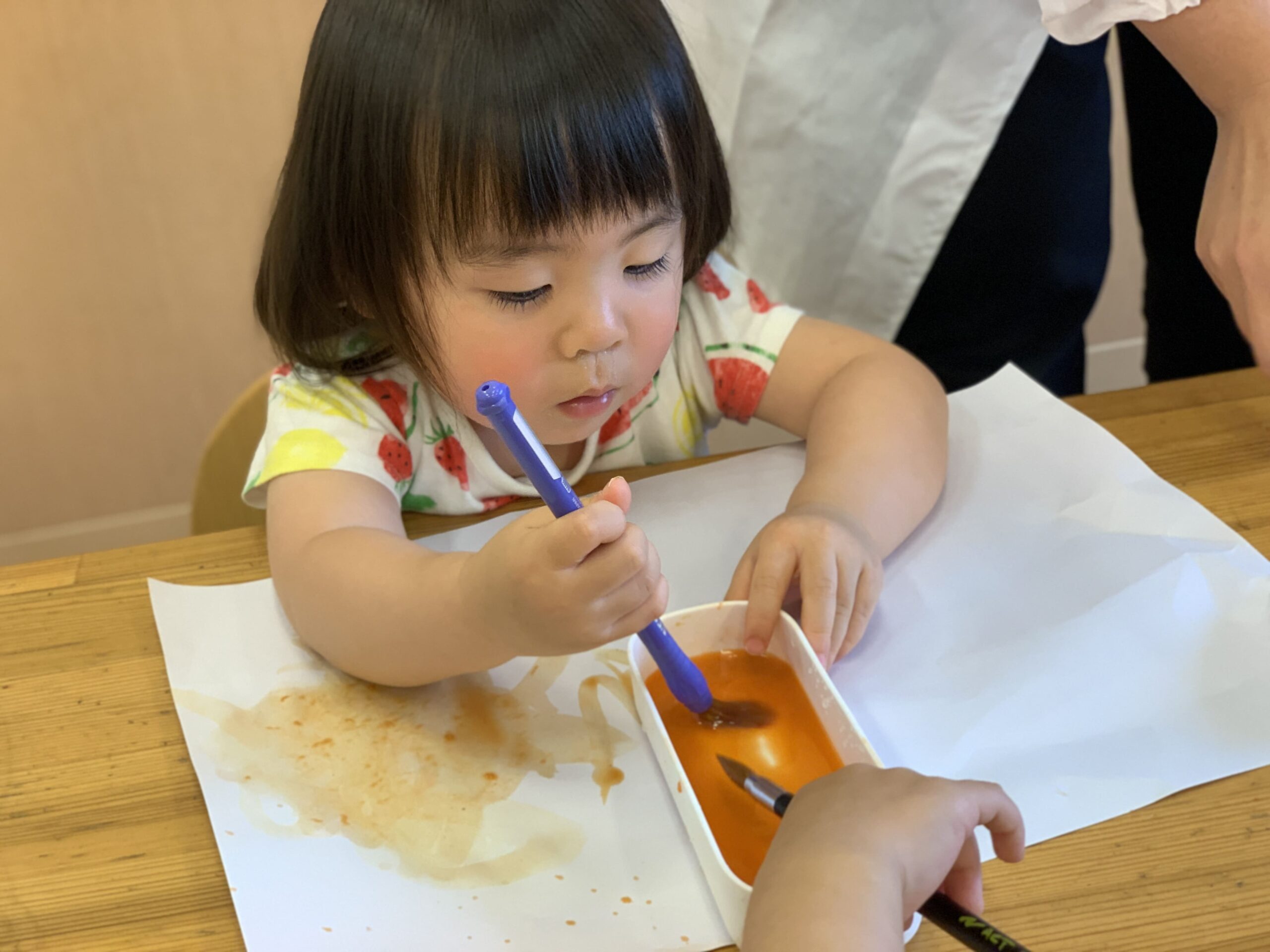 出てきたオレンジの汁や搾りかすを使って、紙にお絵かきしてみると、「かけたー!」「いいにおいがする〜」と大盛り上がり。「ジュースみたいな色だね!」と、思わず笑顔がこぼれていました。サイエンスを通して、素材の変化に触れたり、自分の手で確かめる体験が、子どもたちの五感や表現力をぐんと引き出してくれました。