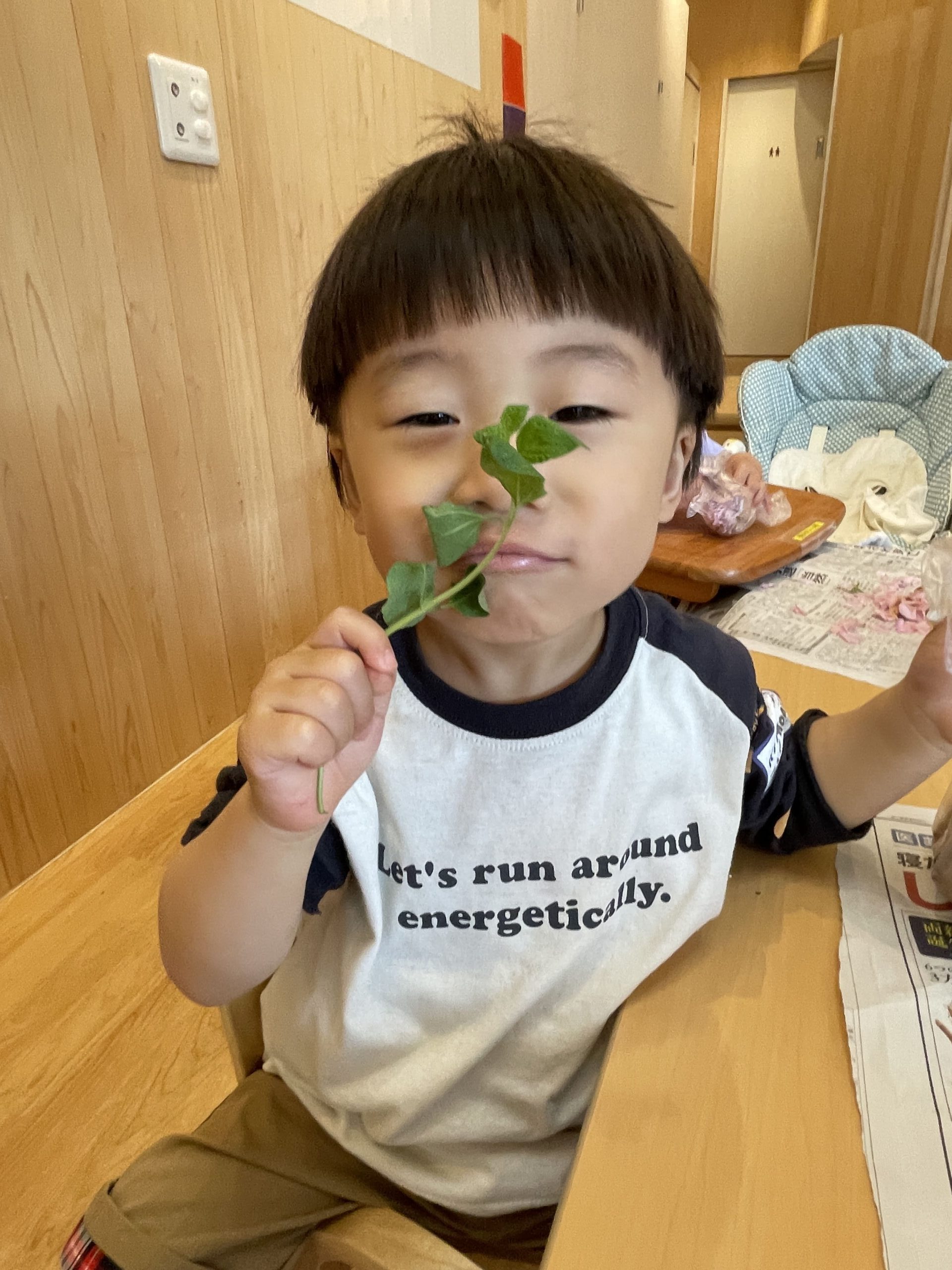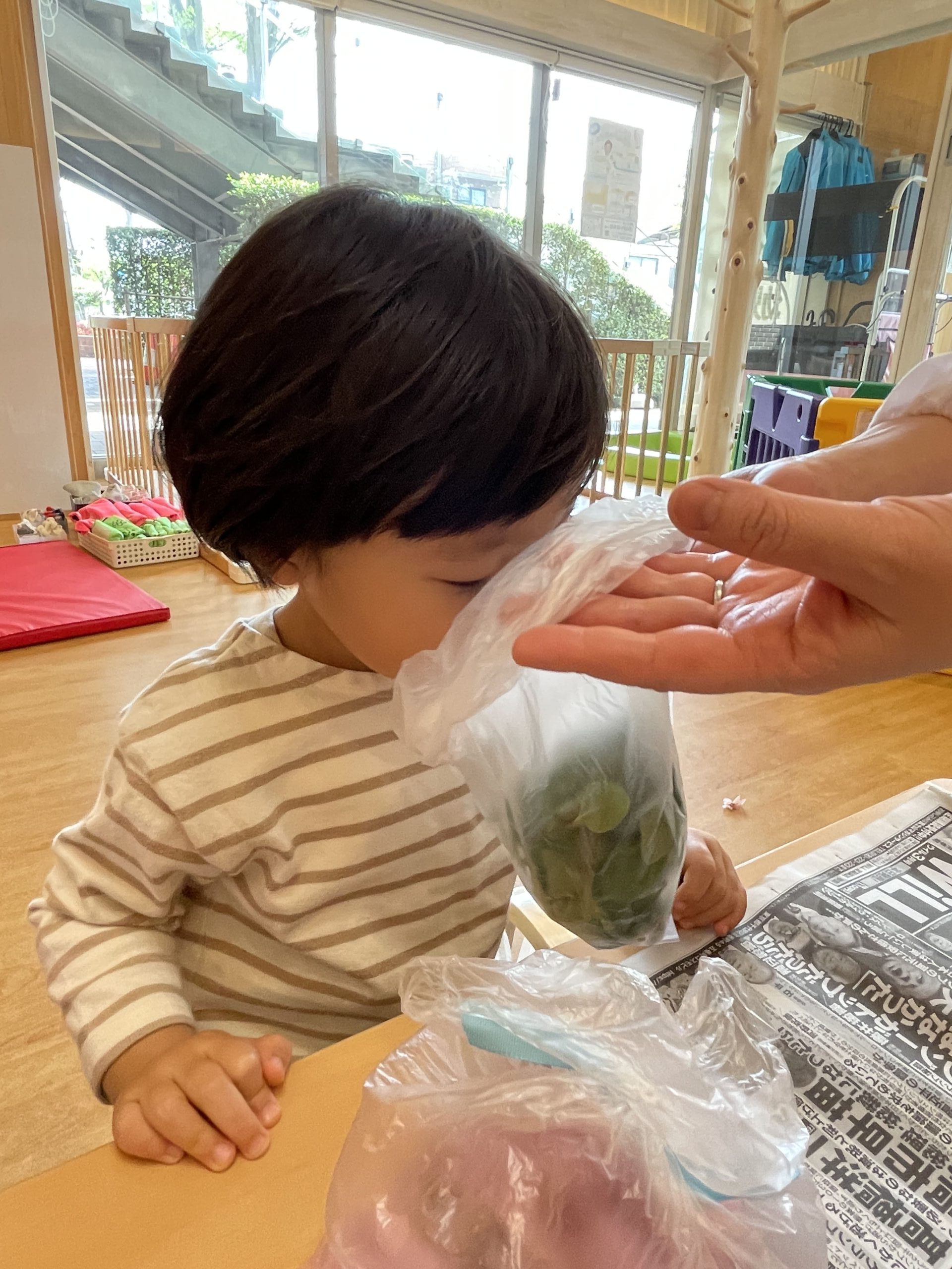 みんなが集めた葉っぱの次は先生が持ってきてくれたミントの葉っぱの匂いを嗅いでみます!どんな匂いかな??