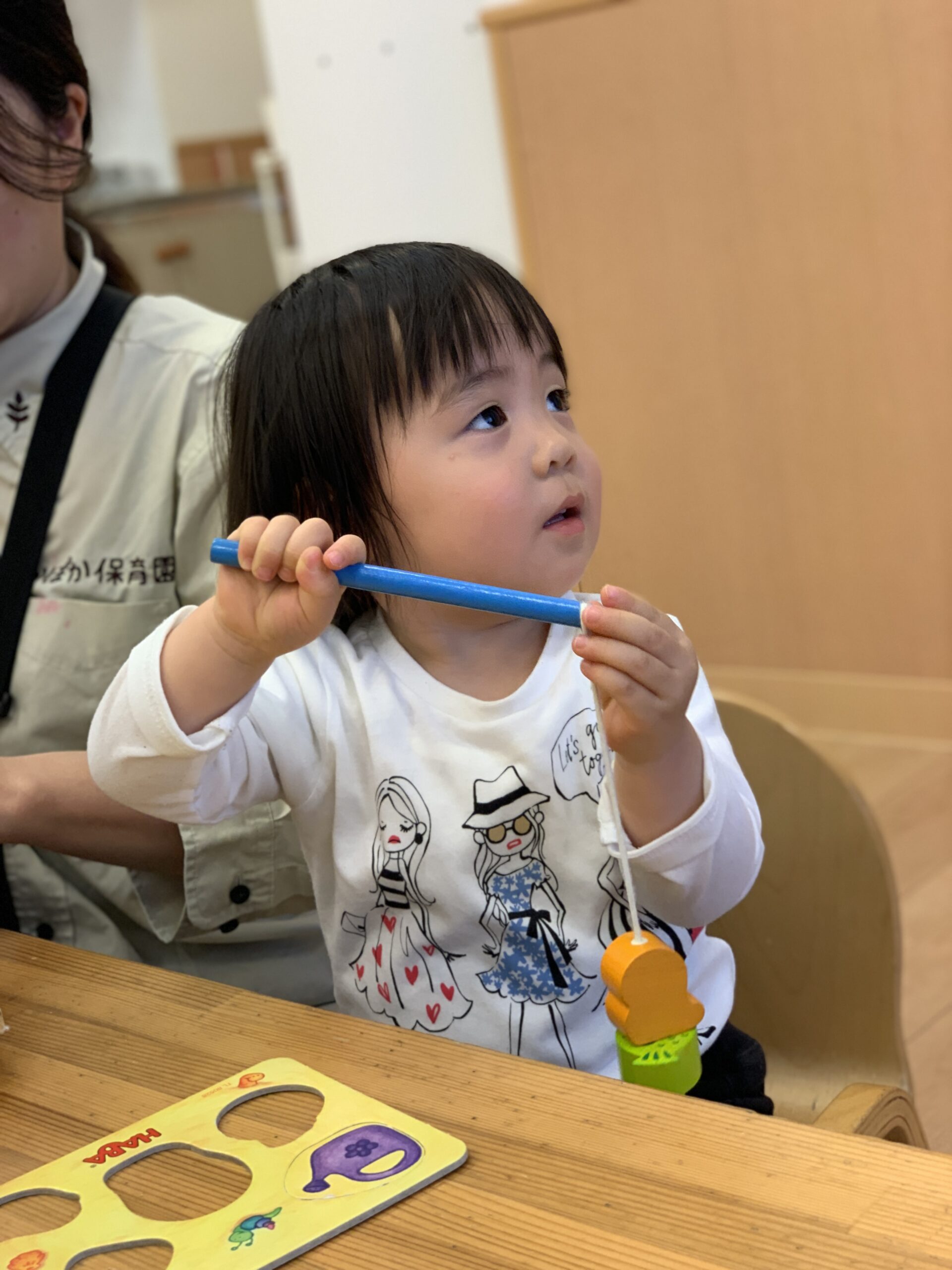 また、「フィッシング」というアナログゲームにも挑戦!磁石のついた釣り竿で魚を釣るシンプルな遊びですが、「やったー、つれた!」と目を輝かせる子どもたちの姿がとても印象的でした。お友だちと順番を守ったり、「どうぞ」と声をかけあったりする姿も見られ、遊びの中で自然に社会性も育まれています。