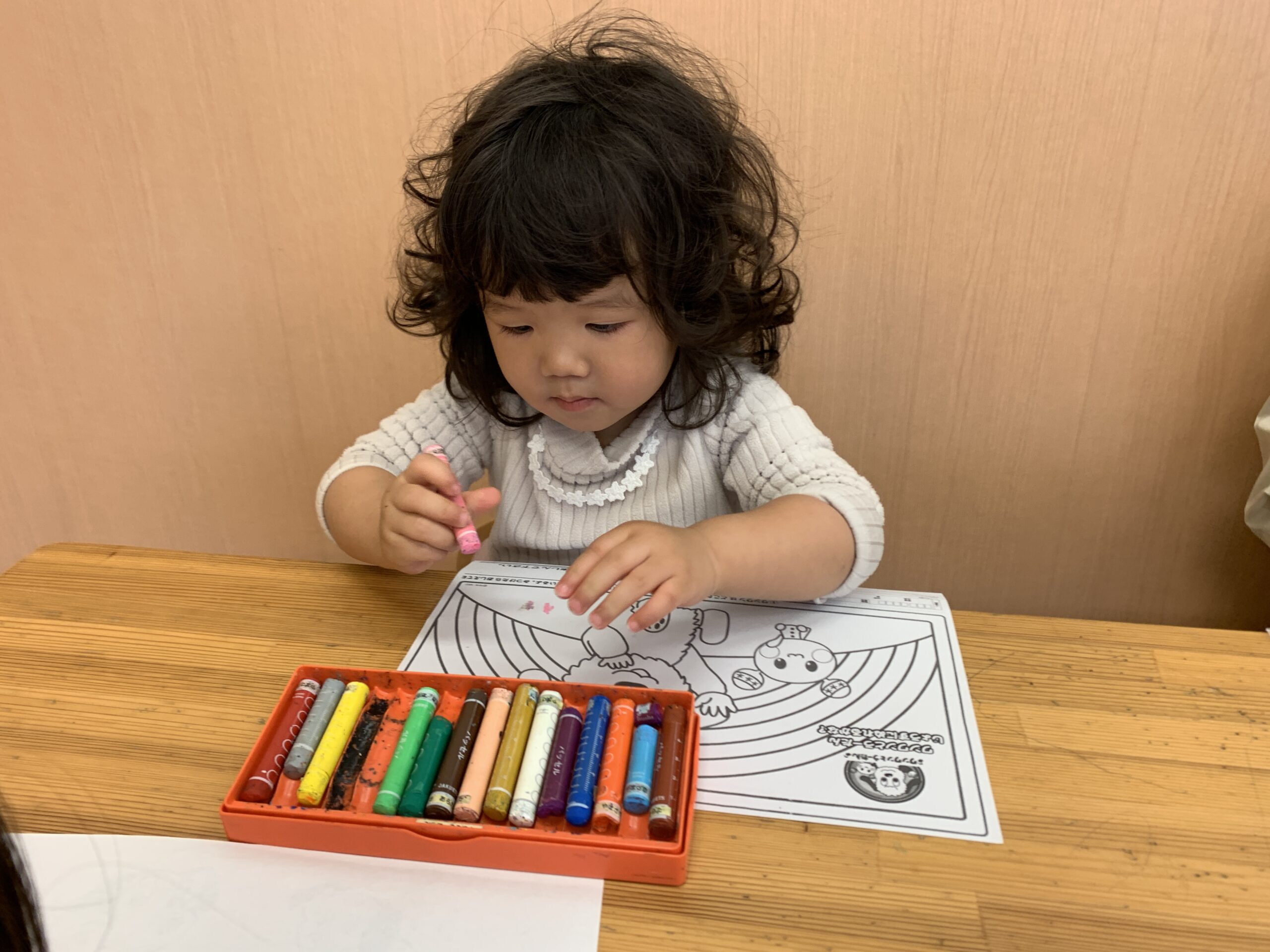 大きいお友だちは椅子に座っての活動。鉛筆で線をなぞるワークに挑戦したり、自由に塗り絵を楽しんだりしました。「せんせい、できたよ!」と嬉しそうに見せてくれる子もいて、一人ひとりの集中力や達成感が育っているのが伝わってきました。