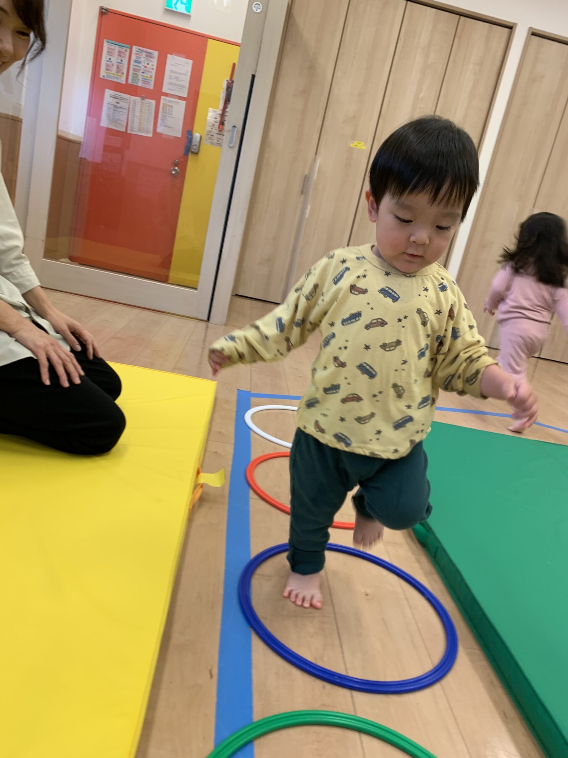 大きいお友だちは、お部屋での体育遊びにチャレンジ!トンネルをくぐったり、平均台のように橋を渡ったり、フープを使ってジャンプしたりと、体全体を使った運動に大はしゃぎでした。「せんせい、みててー!」と何度もチャレンジしては嬉しそうに笑っていました。
