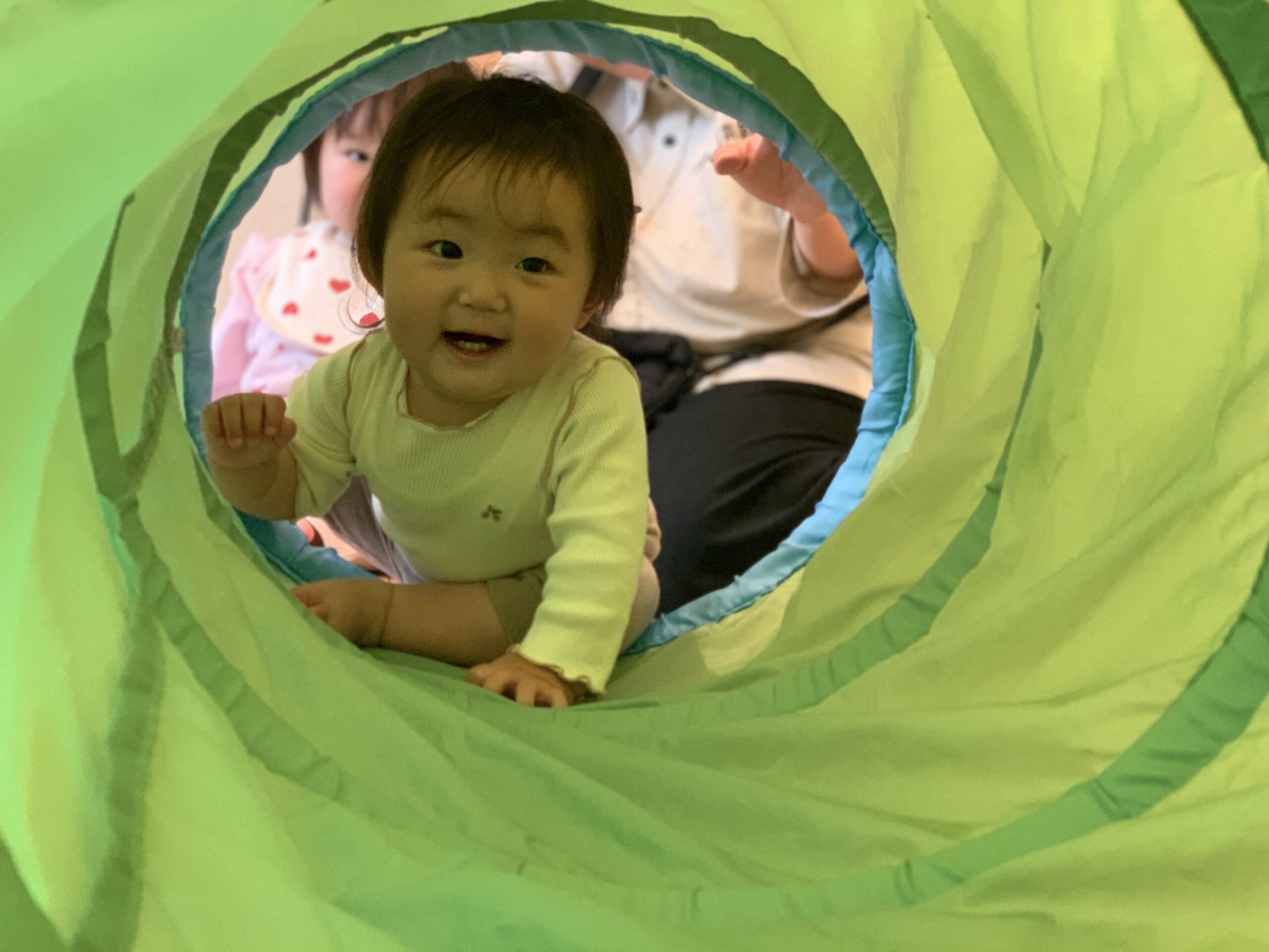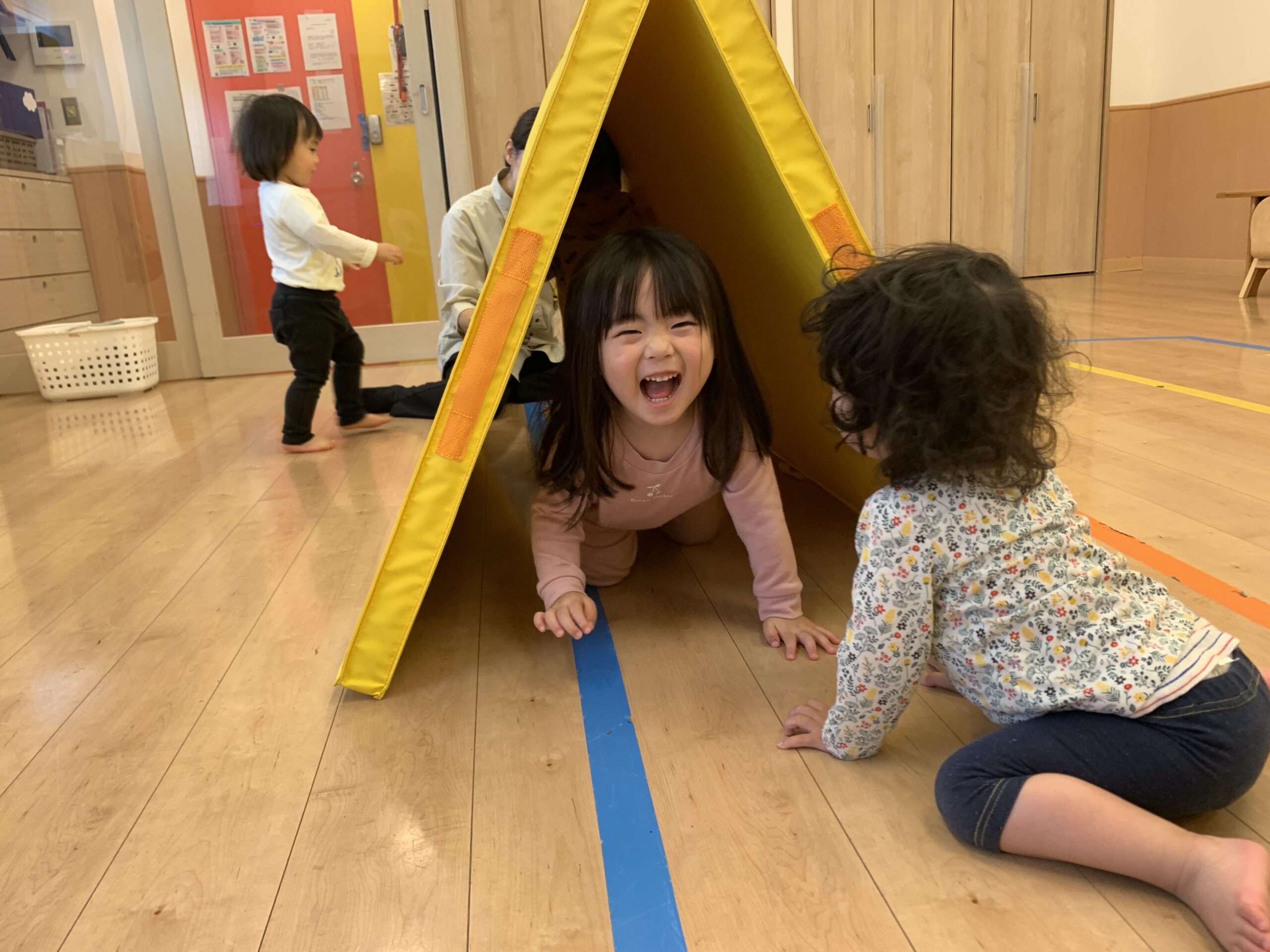 トンネル遊びでは、「こわくないよー」と声を掛け合いながら、交代でくぐったり出たり。探検ごっこの中でのやりとりからも、子どもたち同士の関わりが少しずつ育まれている様子が感じられました。