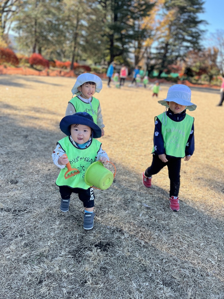 今日は晴れ。保育室ではクリスマスの雰囲気がぐんと高まり、公園では体を使った遊びと発見がたくさんありました。