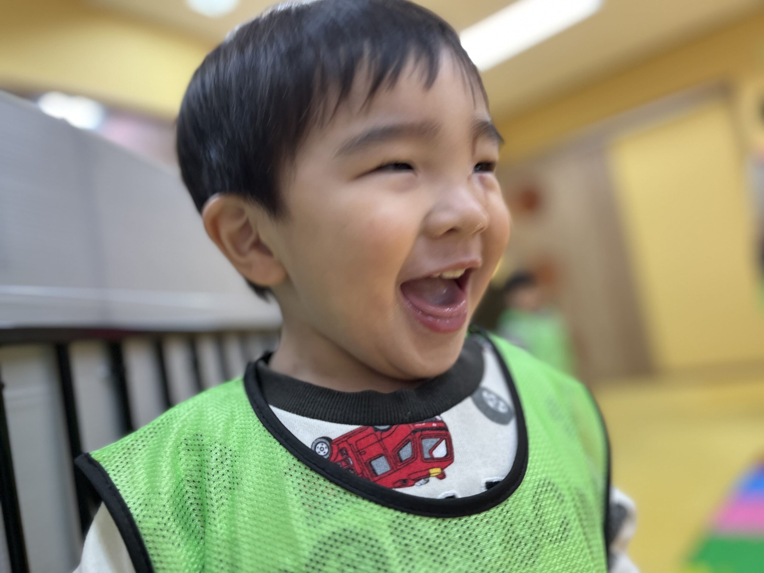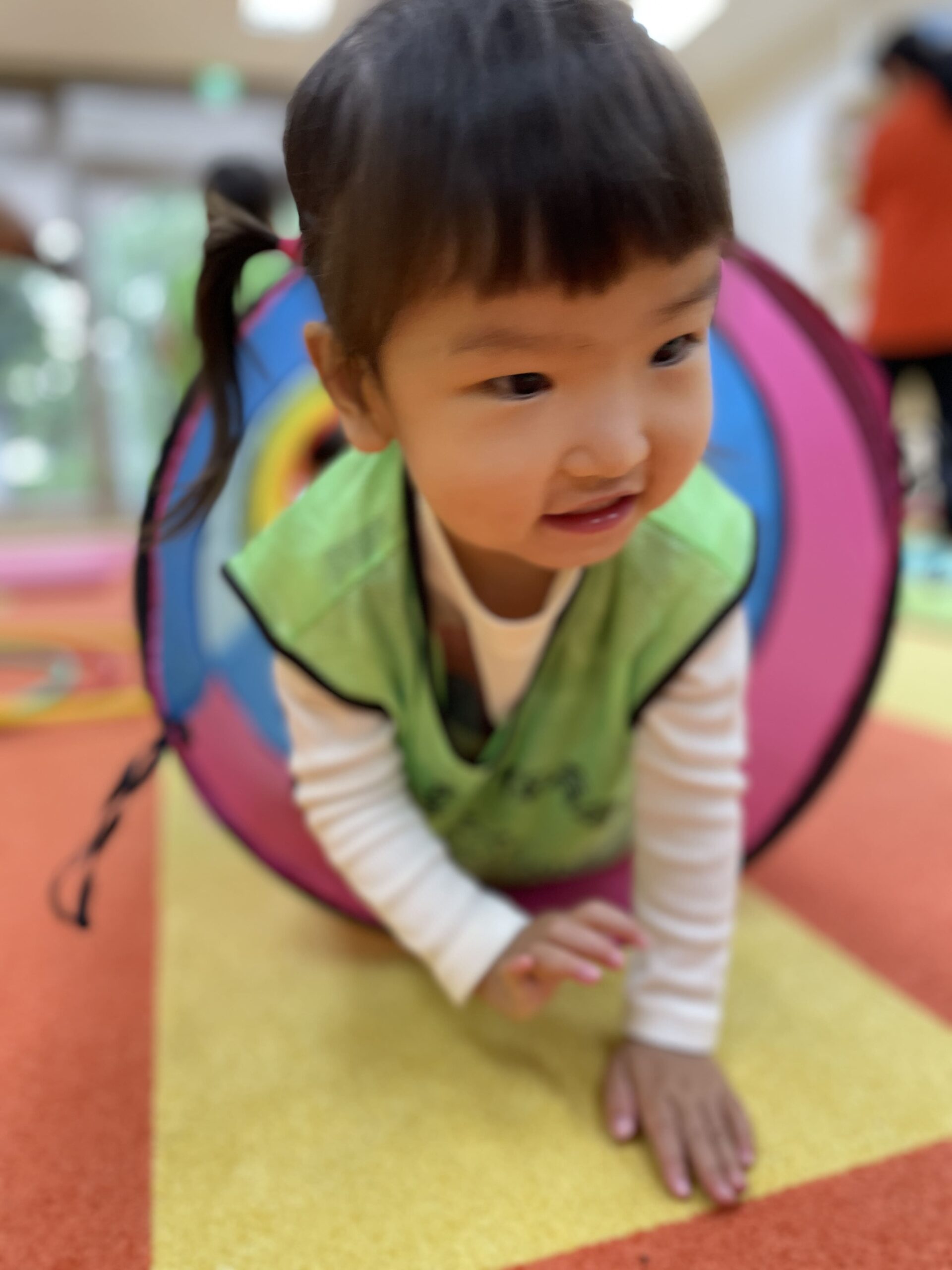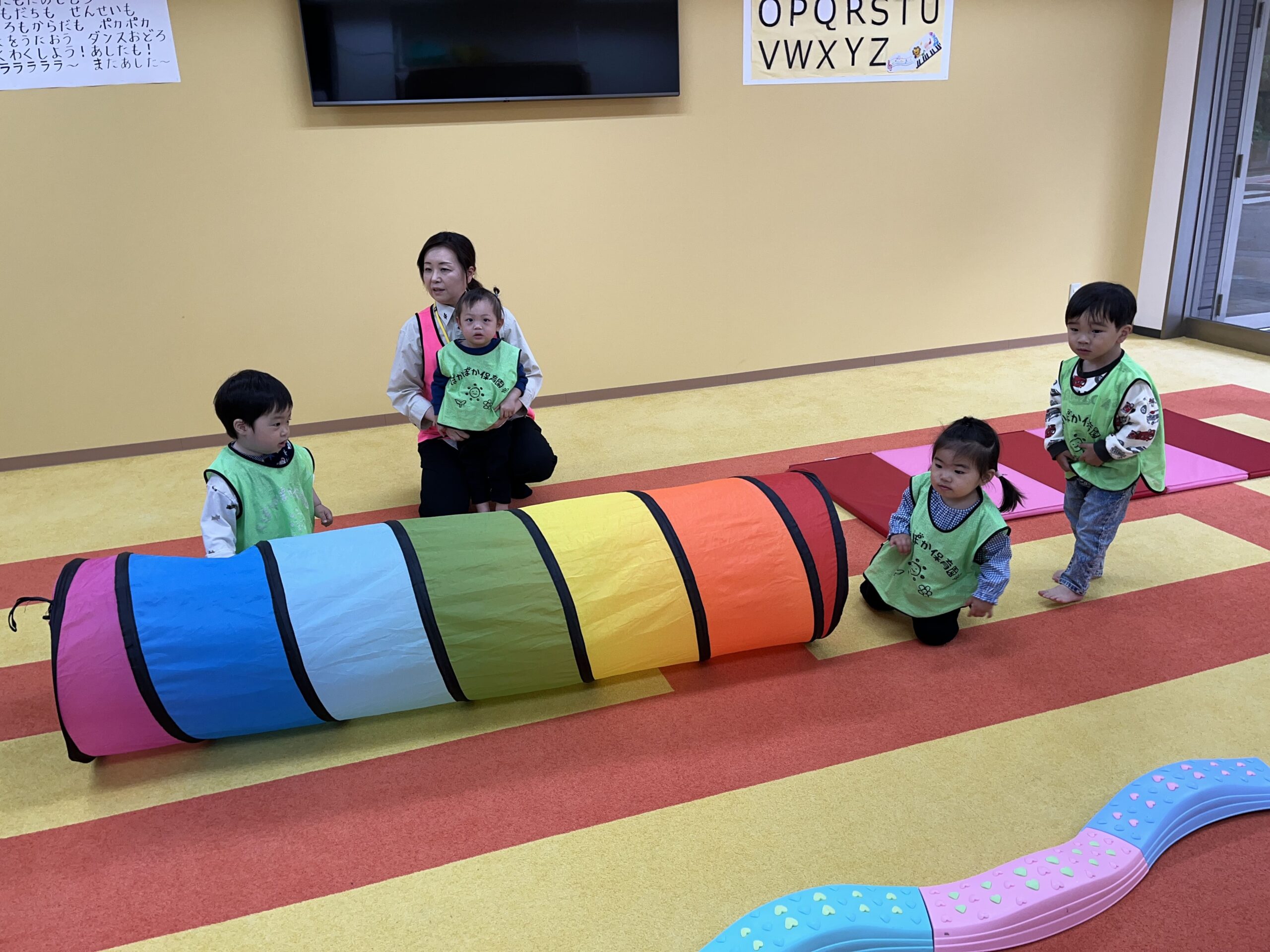 最初は少し場所見知りしていたお友だちも、お友だちや先生が楽しそうにしている姿に引き寄せられて、そっと真似してみると…あれ?なんだか楽しいかも!気がつけばお部屋の中を元気いっぱいに走り回って、ニコニコ笑顔で遊んでいました