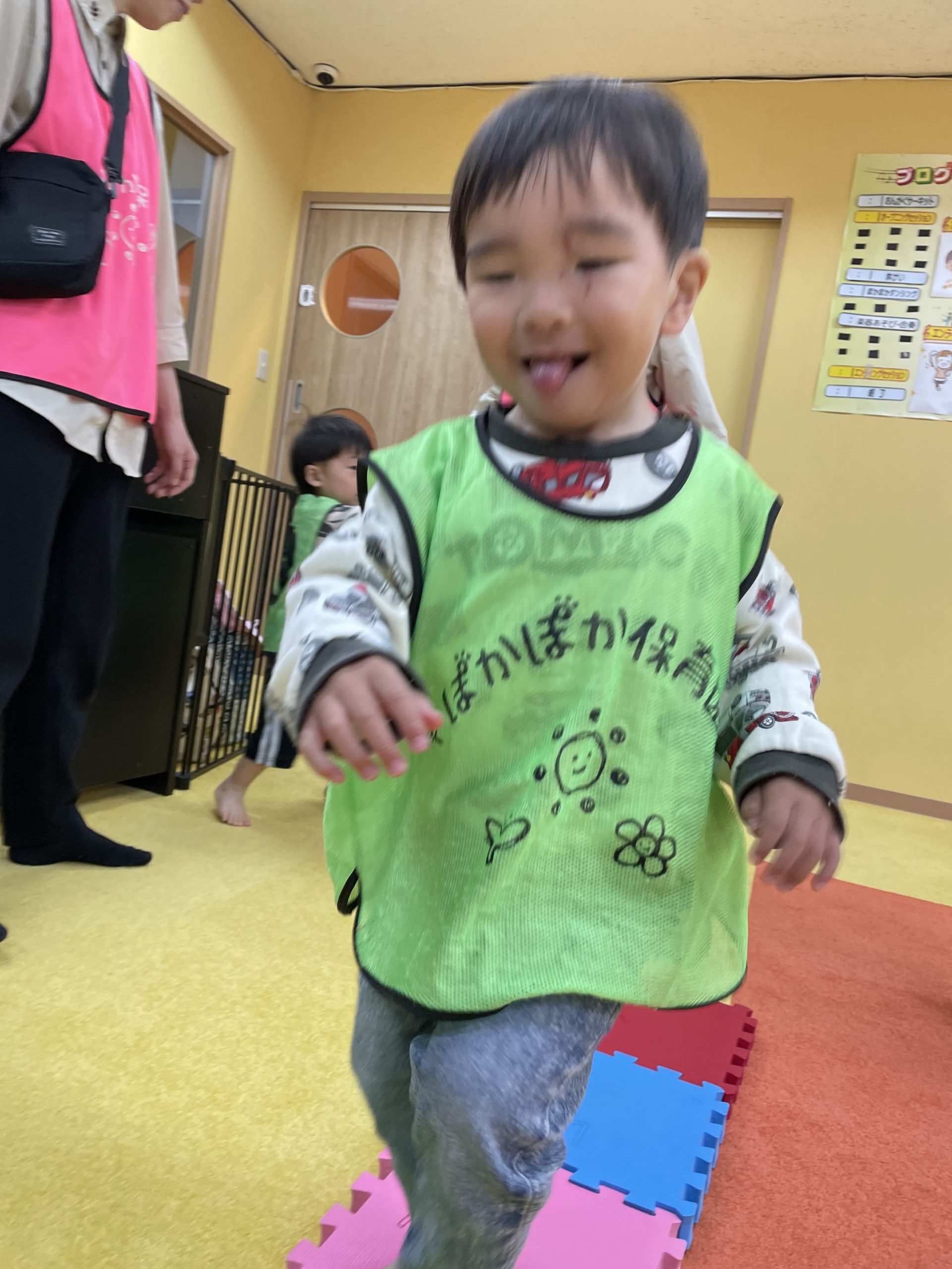 最初は少し場所見知りしていたお友だちも、お友だちや先生が楽しそうにしている姿に引き寄せられて、そっと真似してみると…あれ?なんだか楽しいかも!気がつけばお部屋の中を元気いっぱいに走り回って、ニコニコ笑顔で遊んでいました
