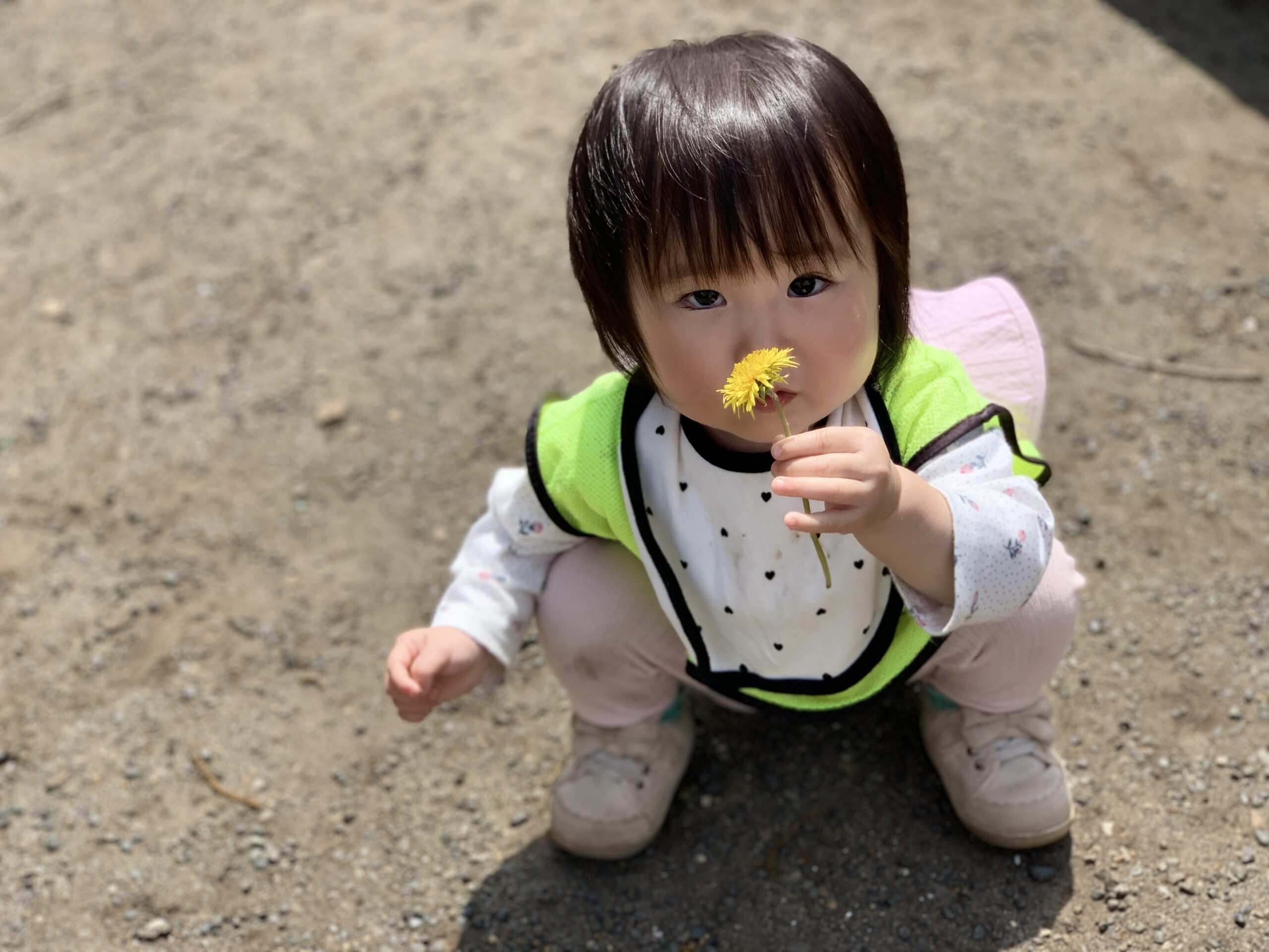 「先生、タンポポ見つけたよ!」と2歳児の子が教えてくれました。「本当にきれいだね!ありがとう!」と返すと、その子は満足そうに笑顔を見せてくれました。子どもたちの小さな発見が、日々の学びや成長につながっていることを実感しました。綿毛をふ~!っと飛ばして遊びました!