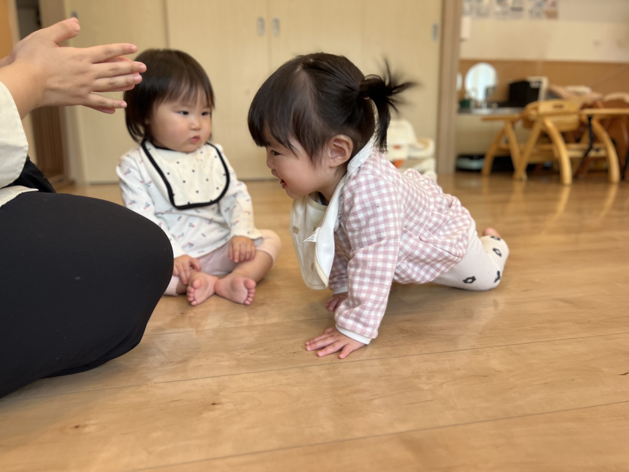 ハイハイ競争では、みんな一生懸命に前に進んで、どの子も最後まで頑張っていました。競争が終わると、みんなお疲れ様!とお互いにハイタッチをして、楽しい時間を共有していました。体を動かすことで、子どもたちはリズム感や運動能力を少しずつ身につけていきますね♪