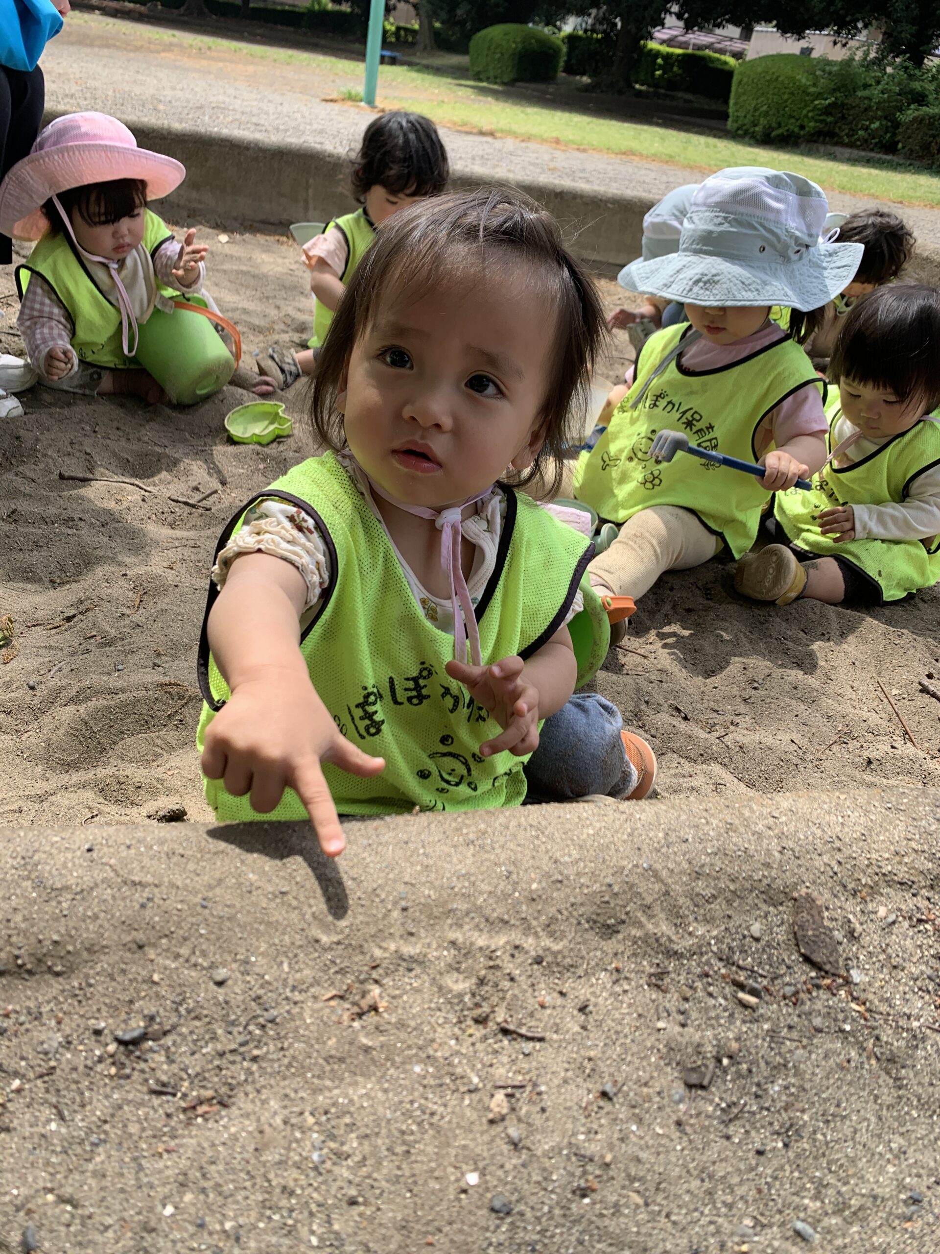 その後、全員で公園に遊びに行きました。公園では、滑り台を滑ったり、砂場で遊んだりして楽しんでいました。