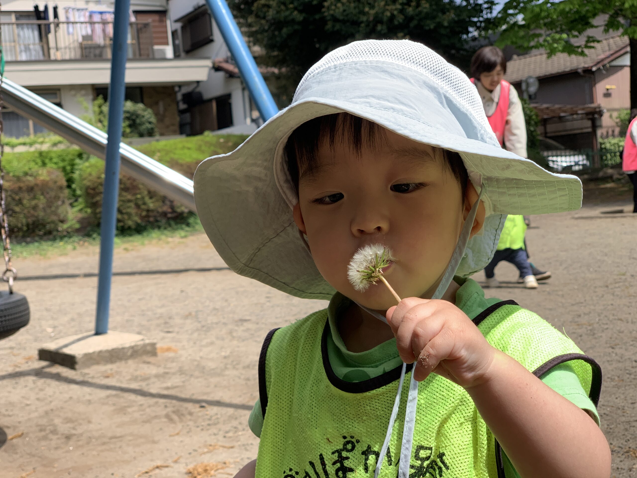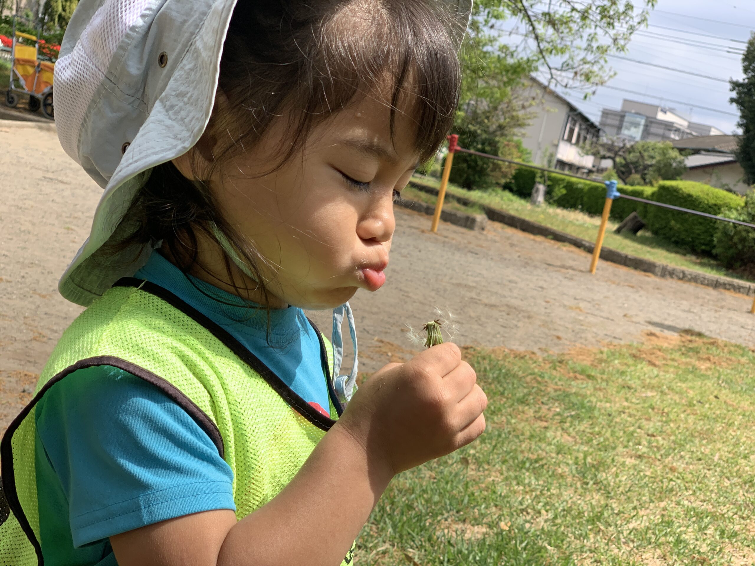 「先生、タンポポ見つけたよ!」と2歳児の子が教えてくれました。「本当にきれいだね!ありがとう!」と返すと、その子は満足そうに笑顔を見せてくれました。子どもたちの小さな発見が、日々の学びや成長につながっていることを実感しました。綿毛をふ~!っと飛ばして遊びました!