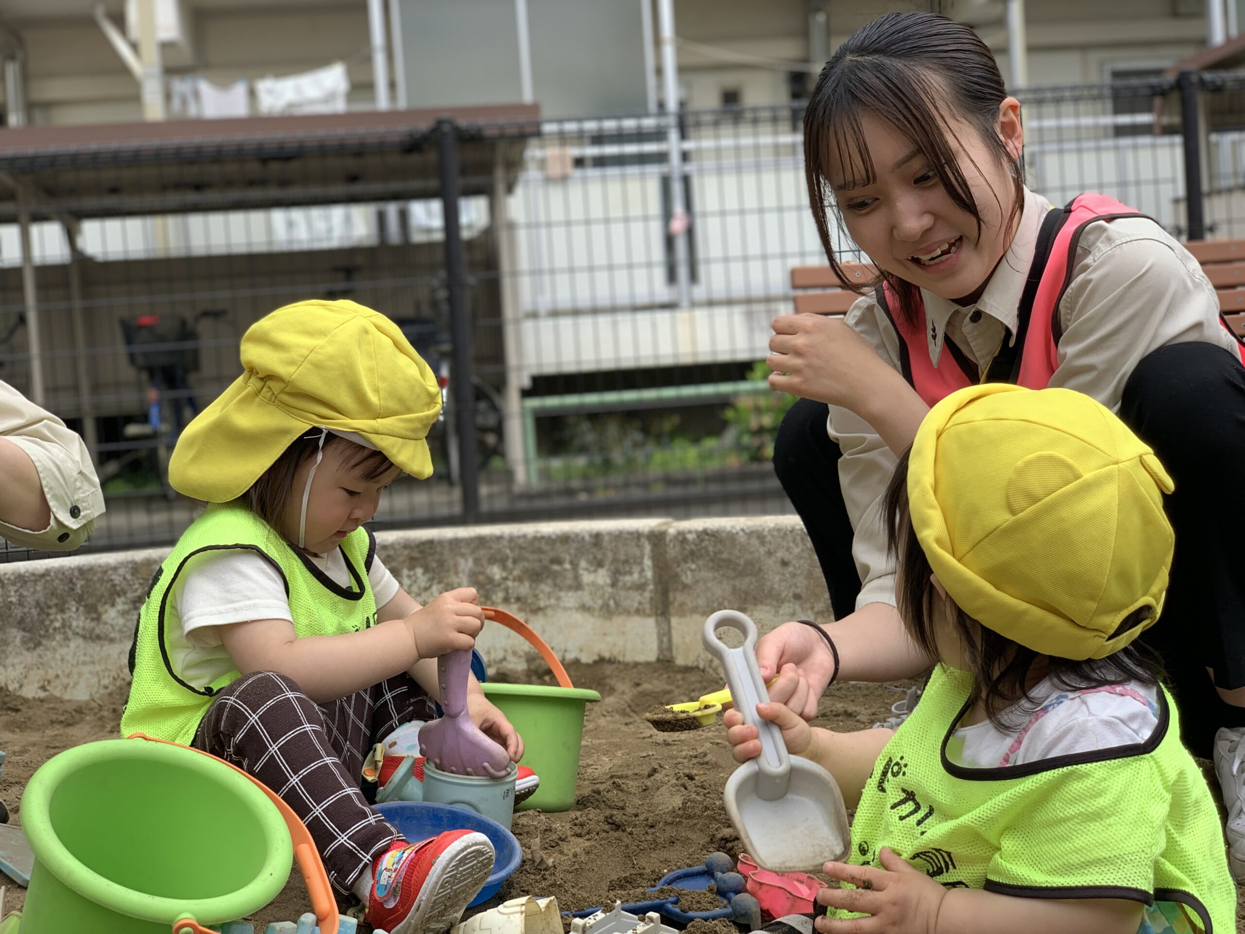 先生が「お山つくってるの?」と声をかけると、「そうだよ!ここはおうちにするの!」と誇らしげに教えてくれる子も。