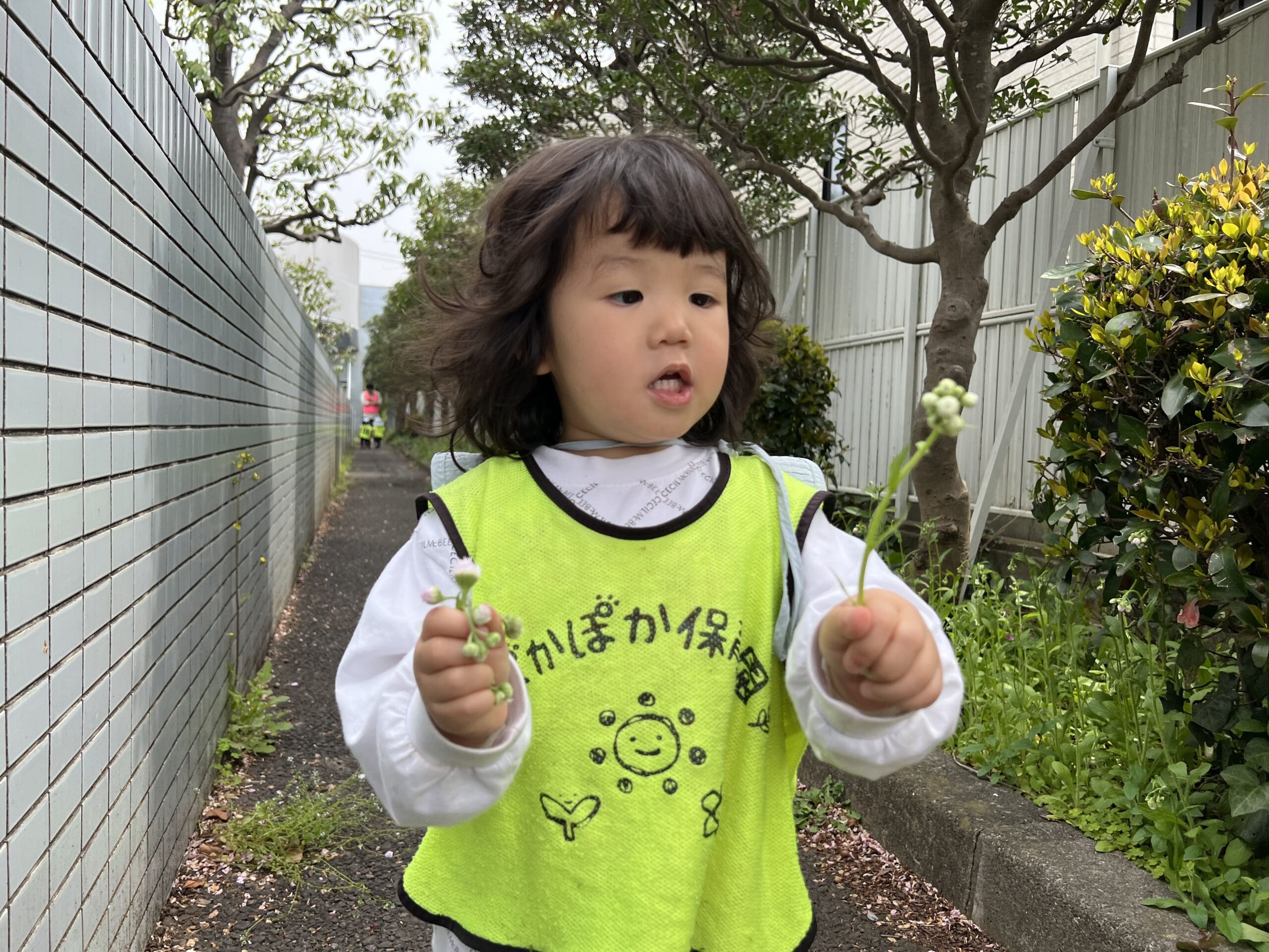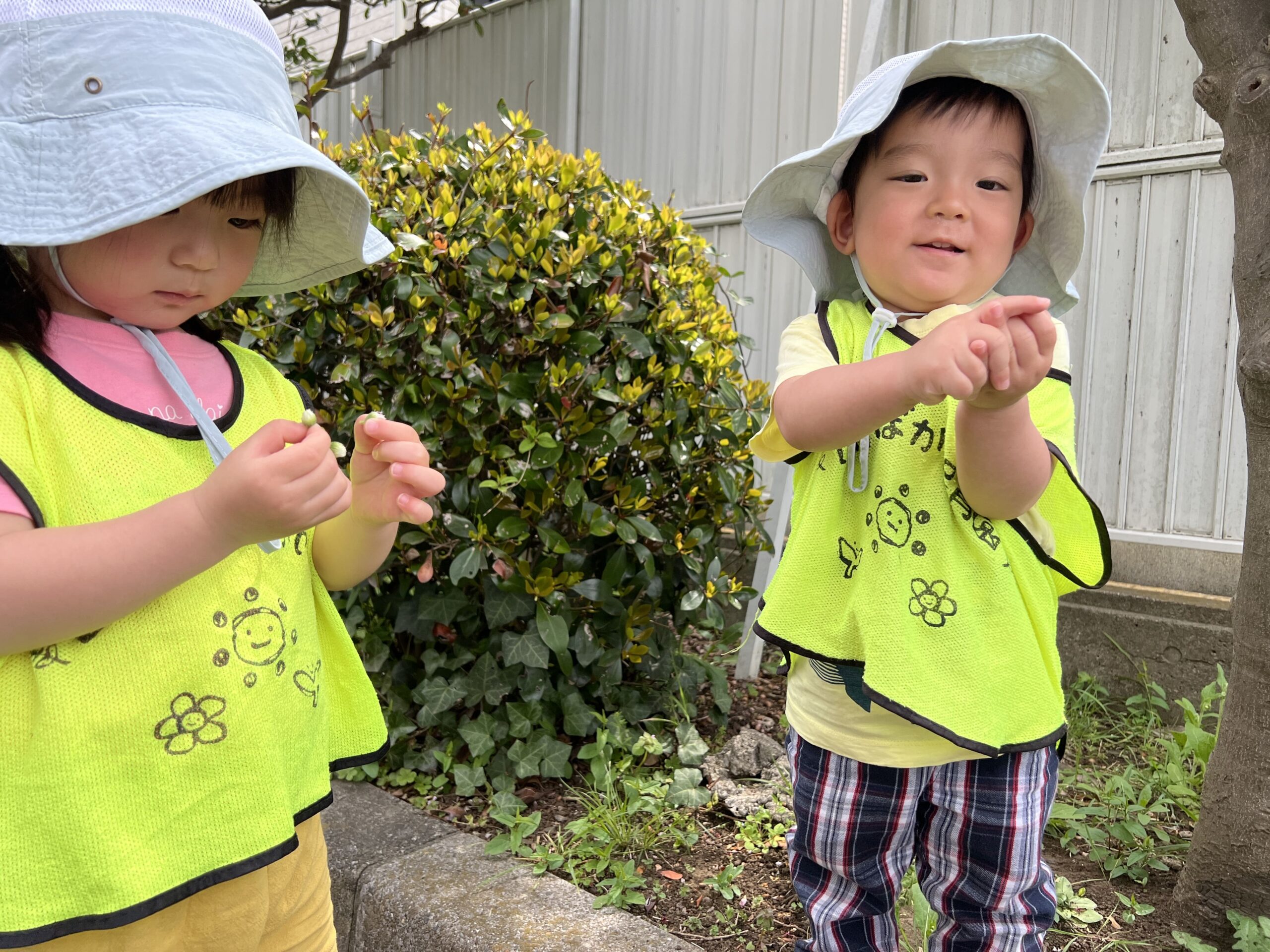「先生、これ見て!」と1歳児の子が小さな虫を見せてくれました。「わぁ、すごいね!よく見つけたね!」と先生が答えると、その子はとびきりの笑顔で嬉しそうにしていました。こうしたやりとりを通じて、子どもたちの自己表現がどんどん豊かになっていきますね♪