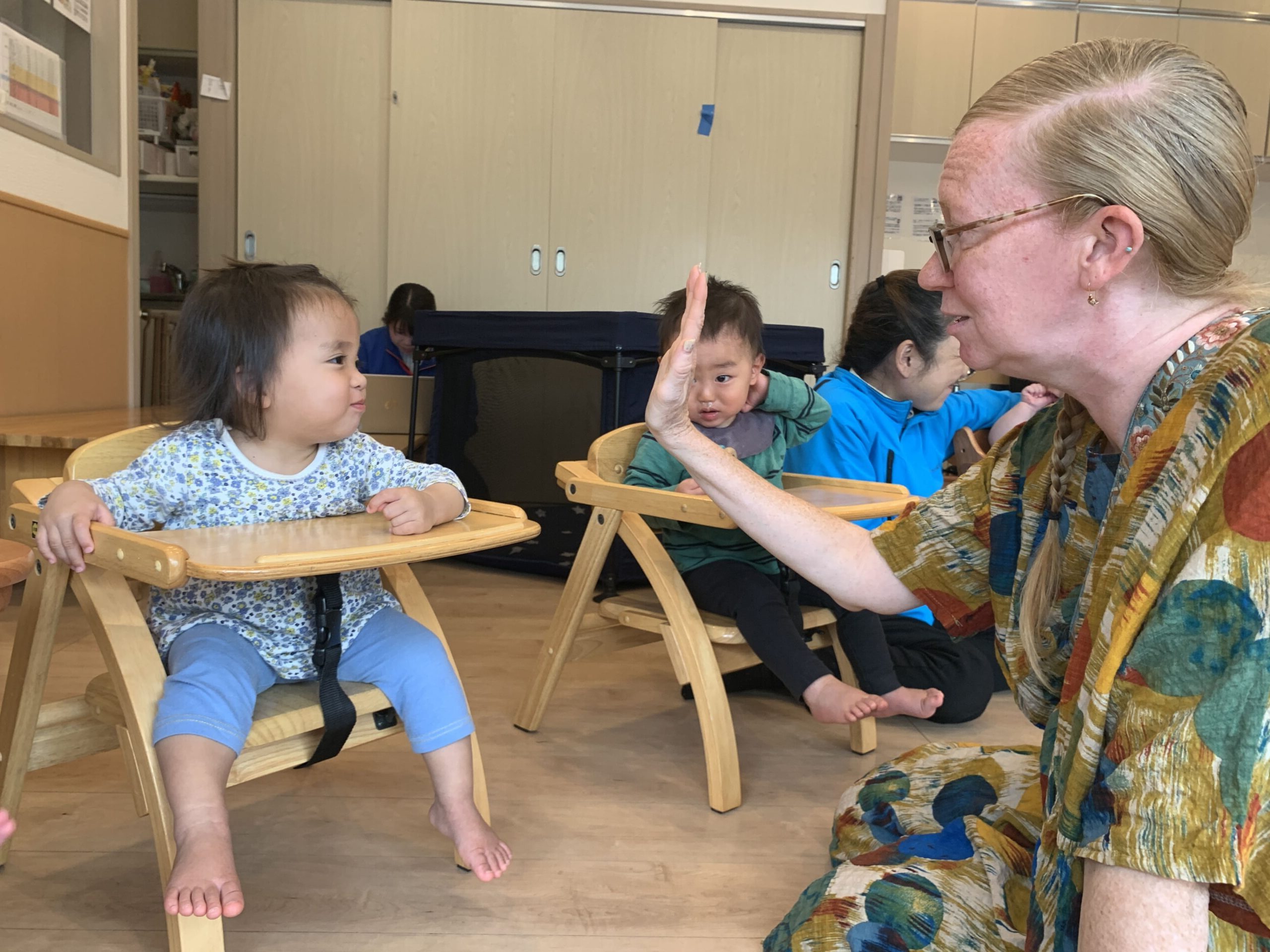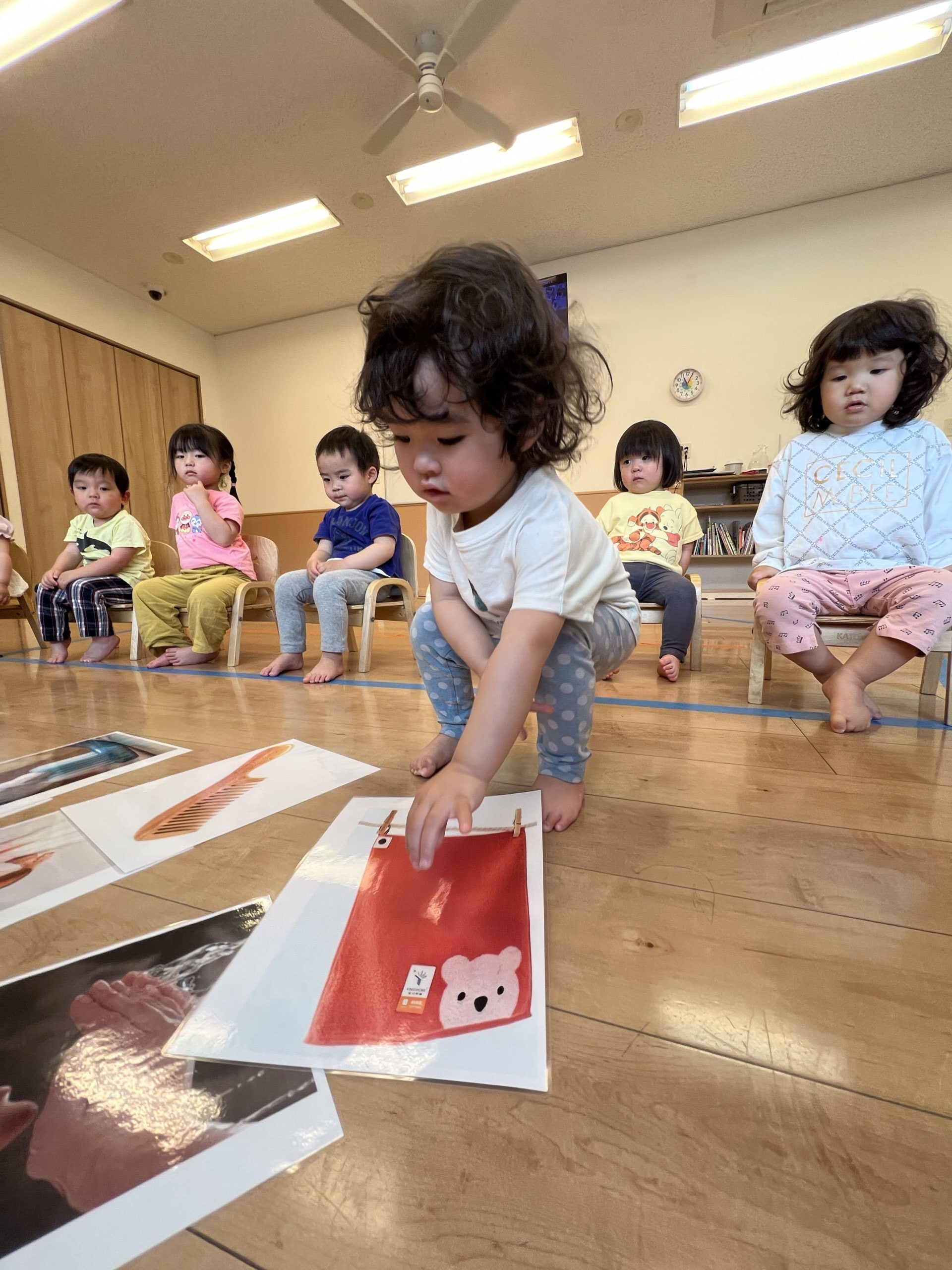 先生とのハイタッチや、絵カードをタッチして遊ぶ時間。子どもたちは、カードを見つけて「これ!」と指をさしながら笑顔で答えたり、元気よく「ハイタッチ!」と手をあげて楽しんでいました。1歳児の子は、先生の真似をして自分から「ハイタッチ!」と手を出してくれたときには、みんな大笑い!その姿がとっても可愛らしかったです♡