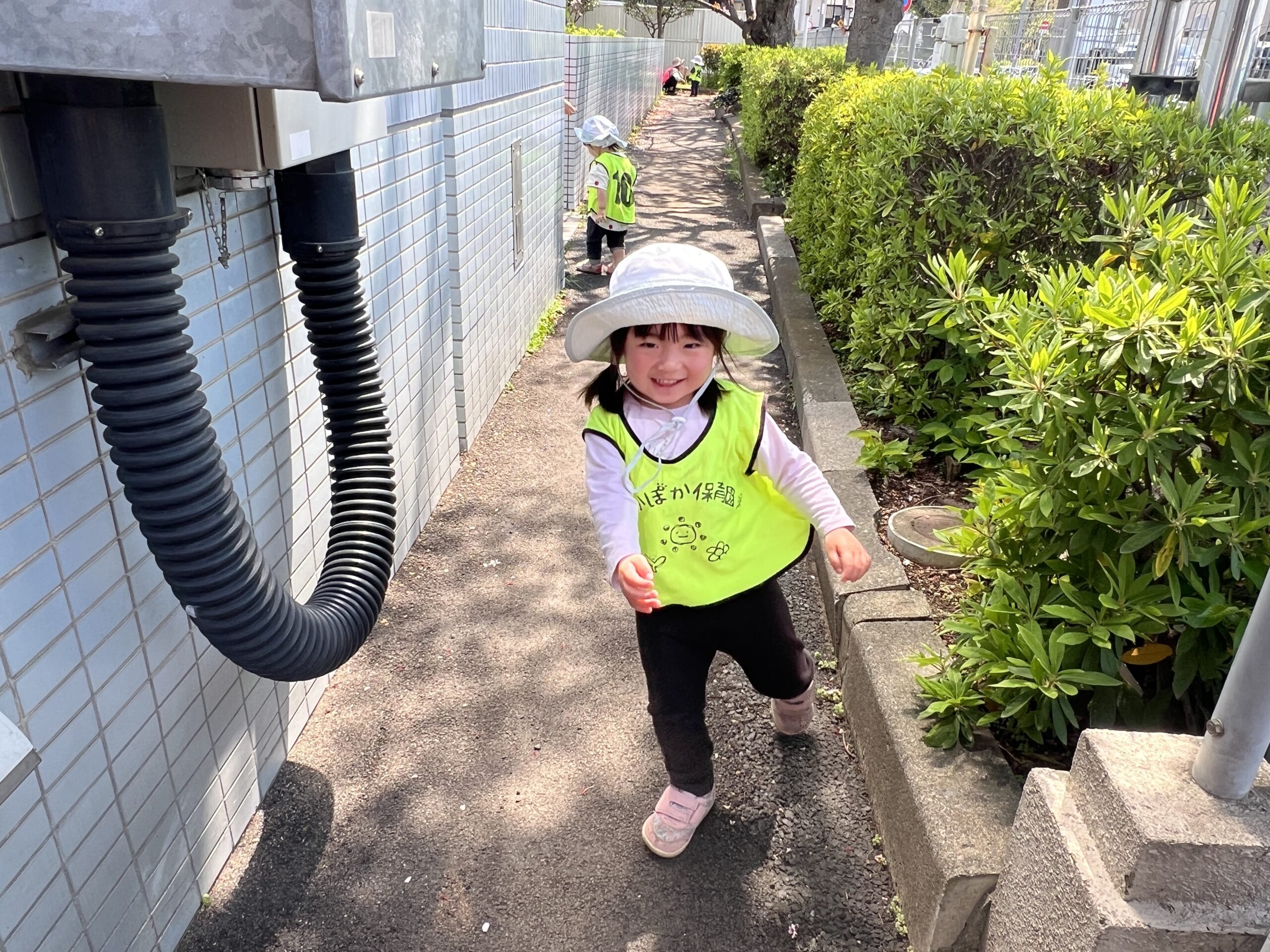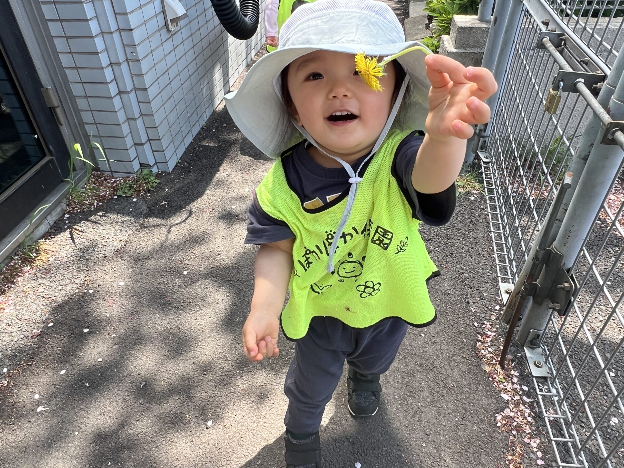 午後はテラスに出て、春の自然にふれる時間を過ごしました。「せんせい、これなに?」と指さした先には小さな黄色い花。「これはたんぽぽっていうんだよ」と話すと、「たんぽぽ、かわいいね」と笑顔で見つめていました。