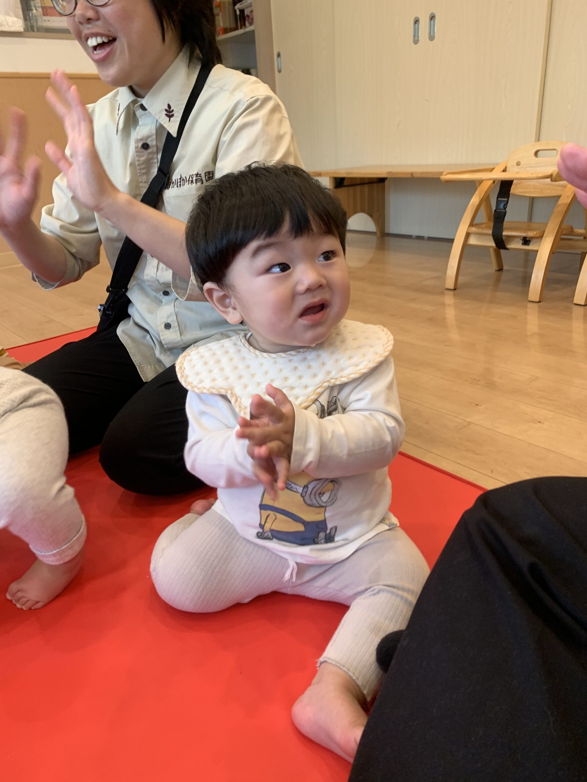 こんにちは!ぽかぽか保育園です。今日は0歳児、1歳児、2歳児の子どもたちが一緒に、音楽遊びや英語遊び、そしてテラスでの自然遊びを通して、たくさんの経験をしました。
