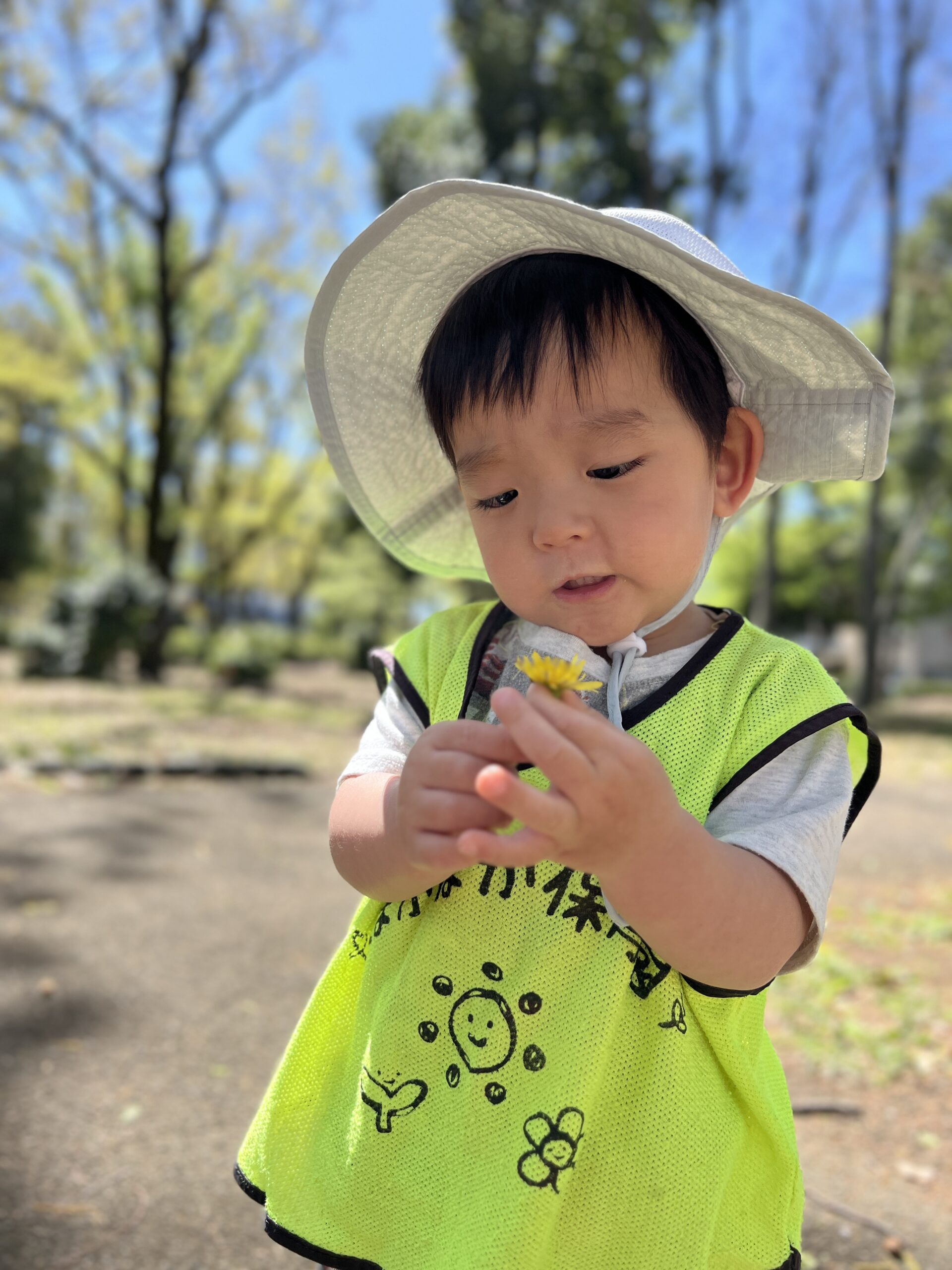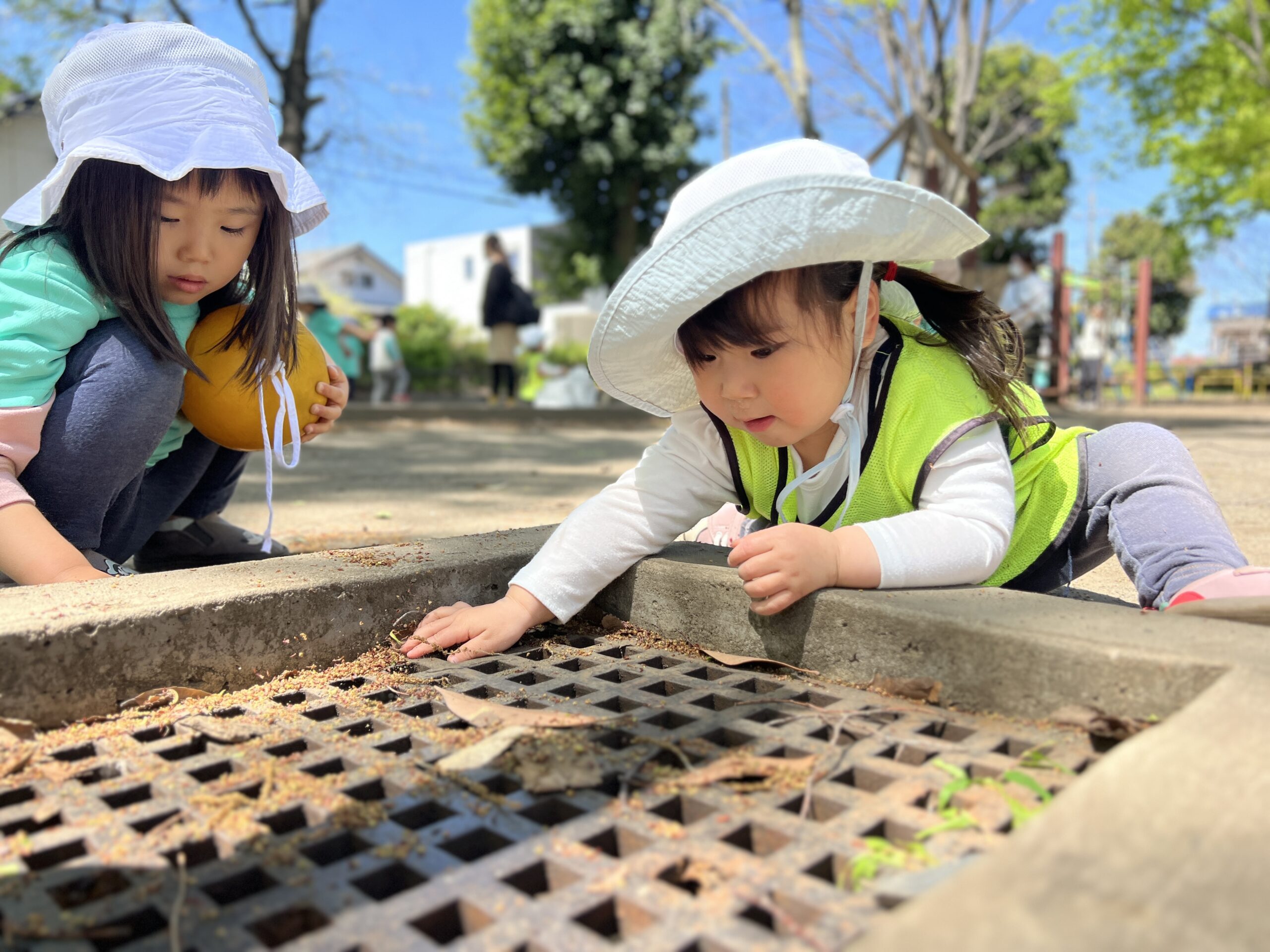 見つけた花をそっとのぞき込んで、「においするかな?」と鼻を近づけてみる子や、「ちょうちょいるかな〜?」と虫探しをする子もいて、小さな自然とのふれあいにワクワクしているのが伝わってきました。