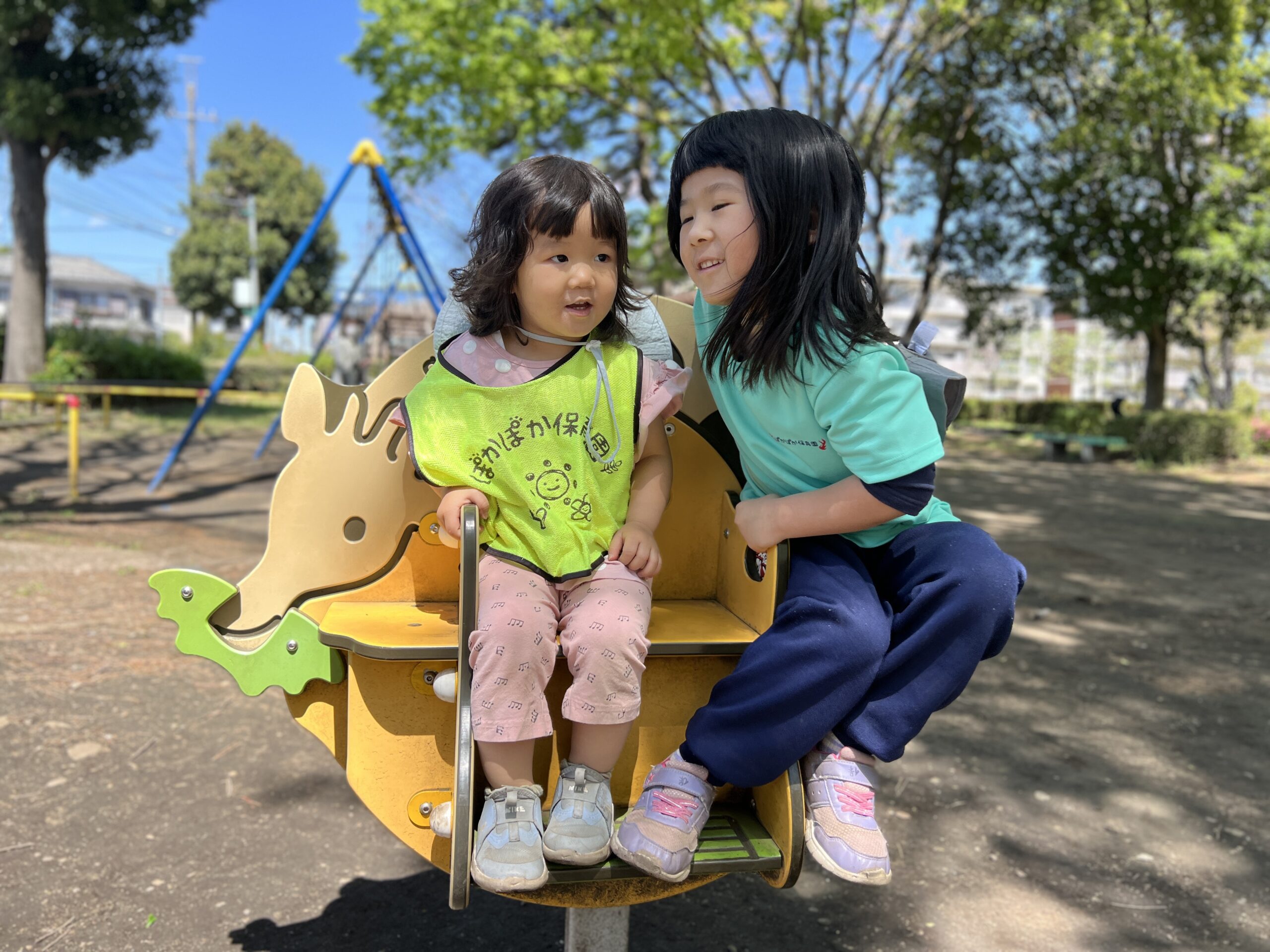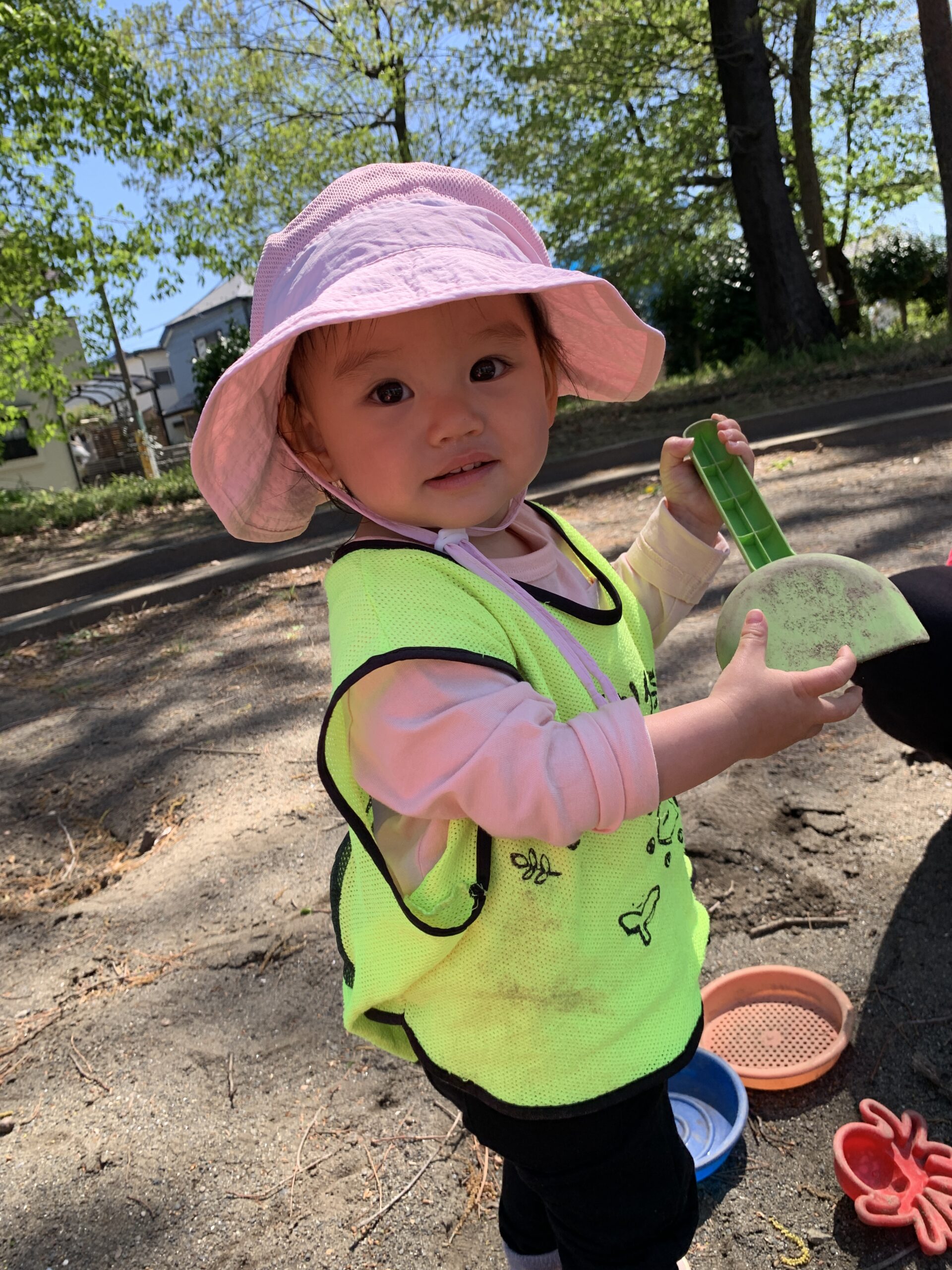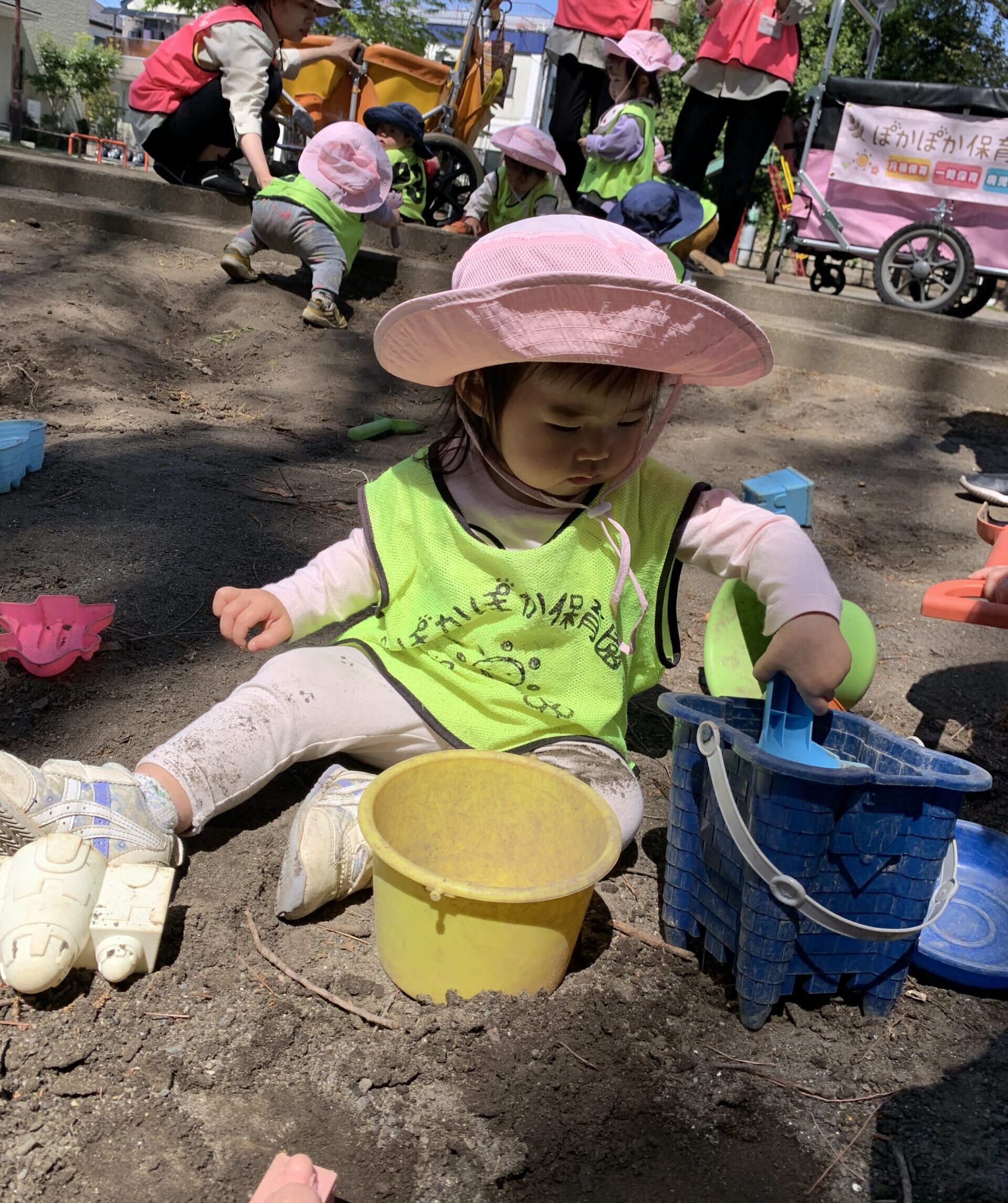 春のやわらかい風に包まれながら、砂場ではシャベルやバケツを手に、思い思いの遊びに夢中な様子でした。