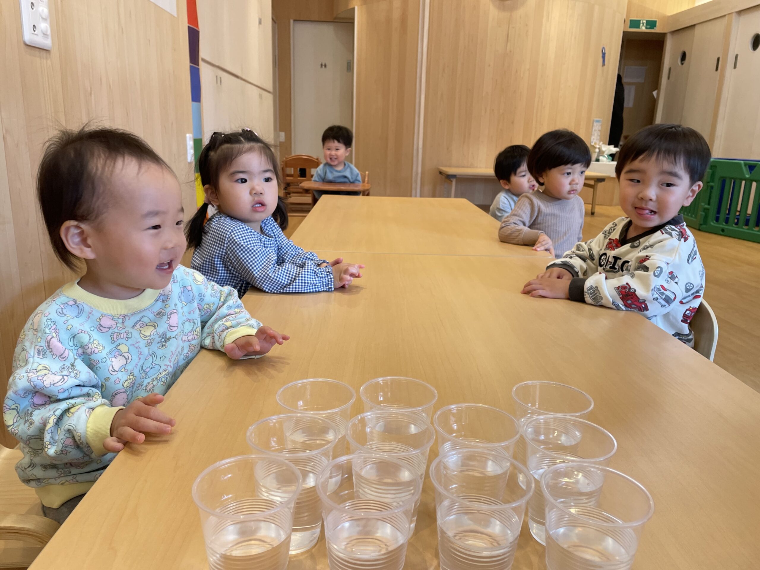 透明のカップにぬるめの白湯を用意して、ストローを使った実験を行いました。