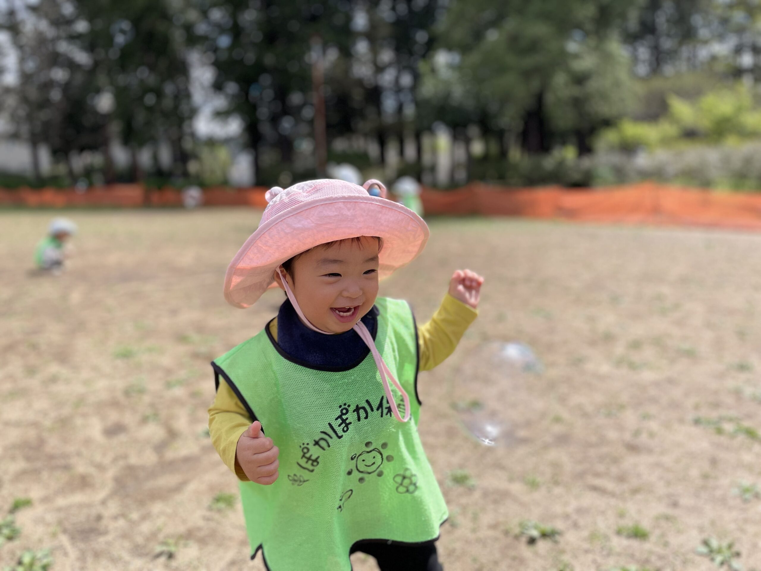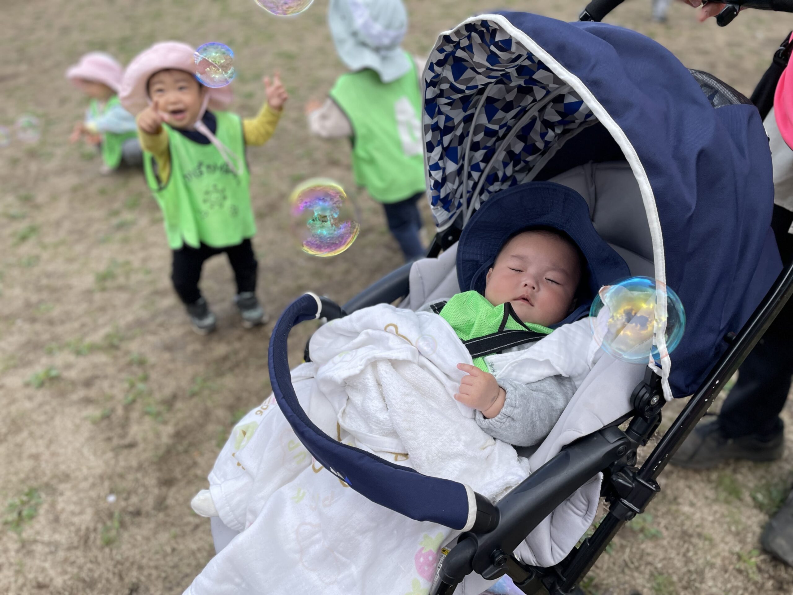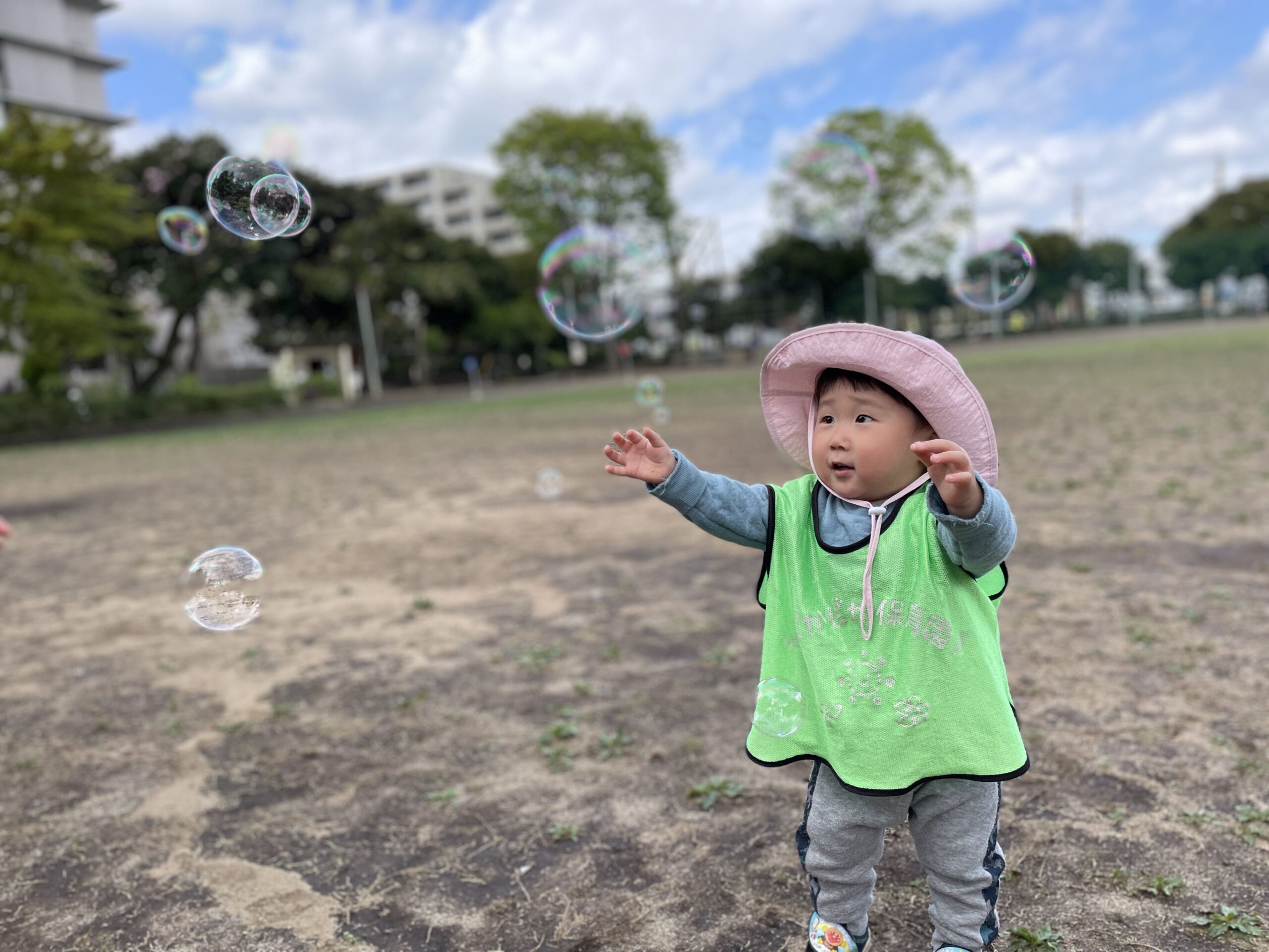 公園では、先生がシャボン玉を飛ばしました。