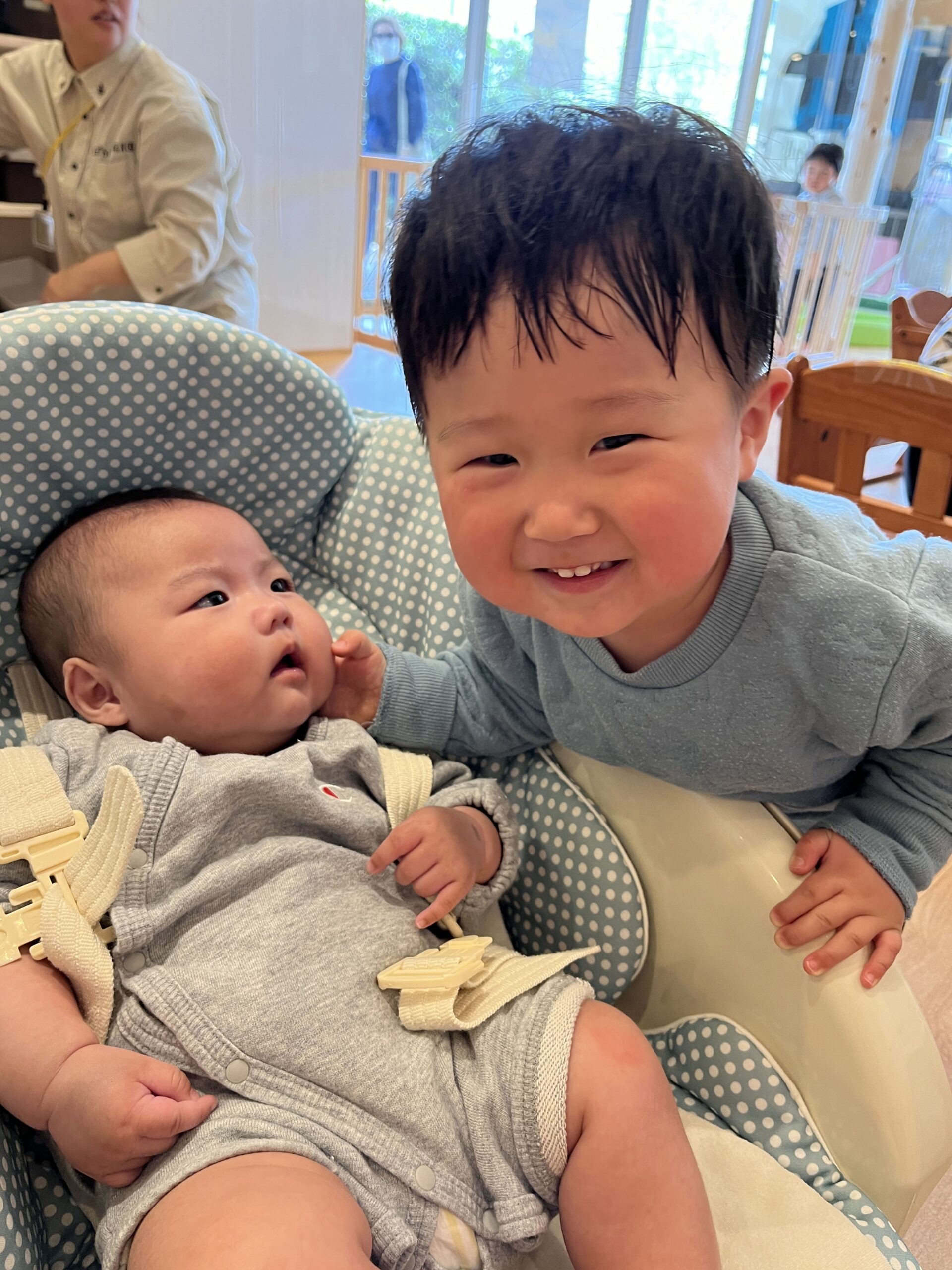 1歳児のお友だちも、先生が吹いて見せる様子をじっと見つめたり、