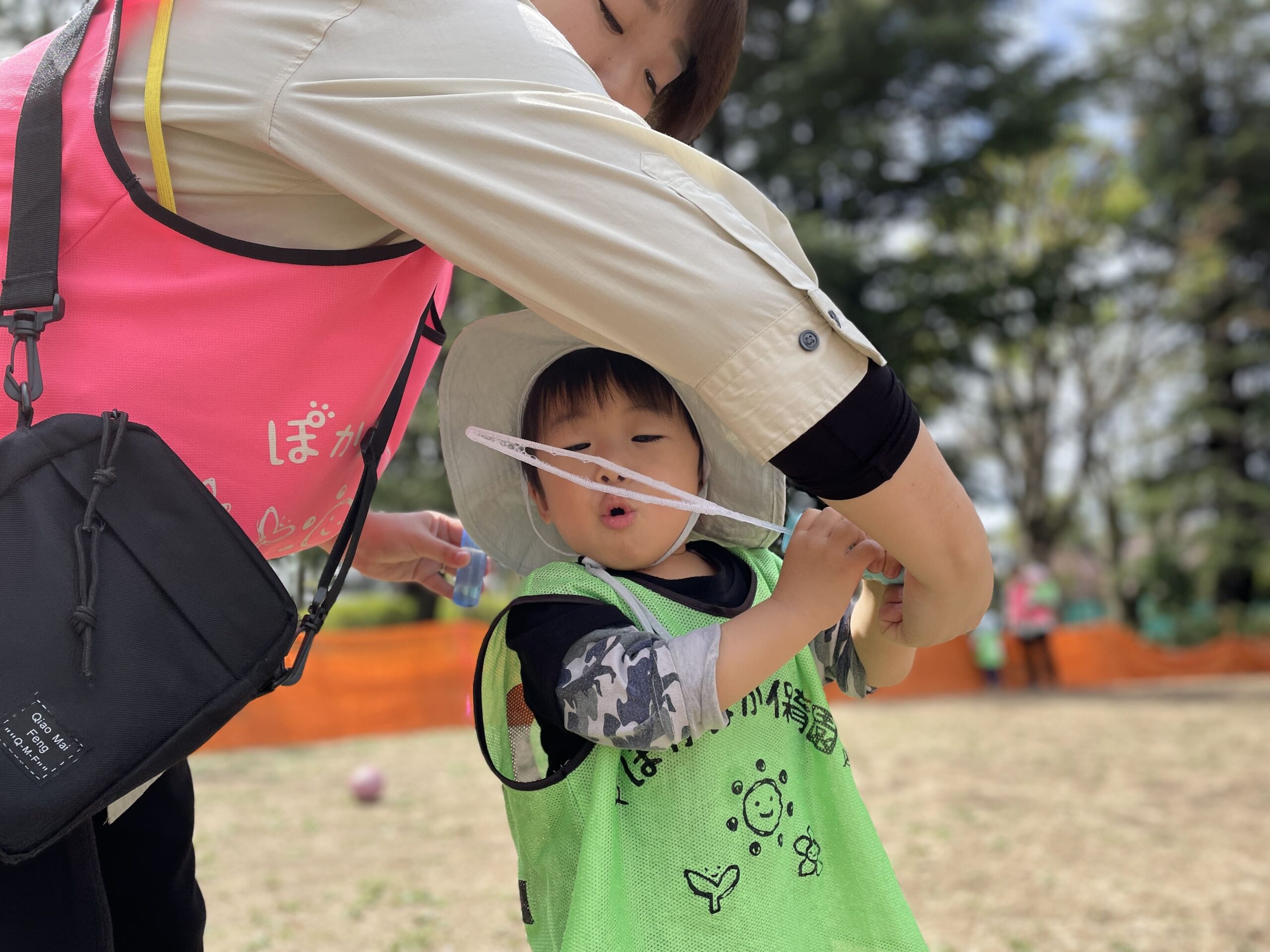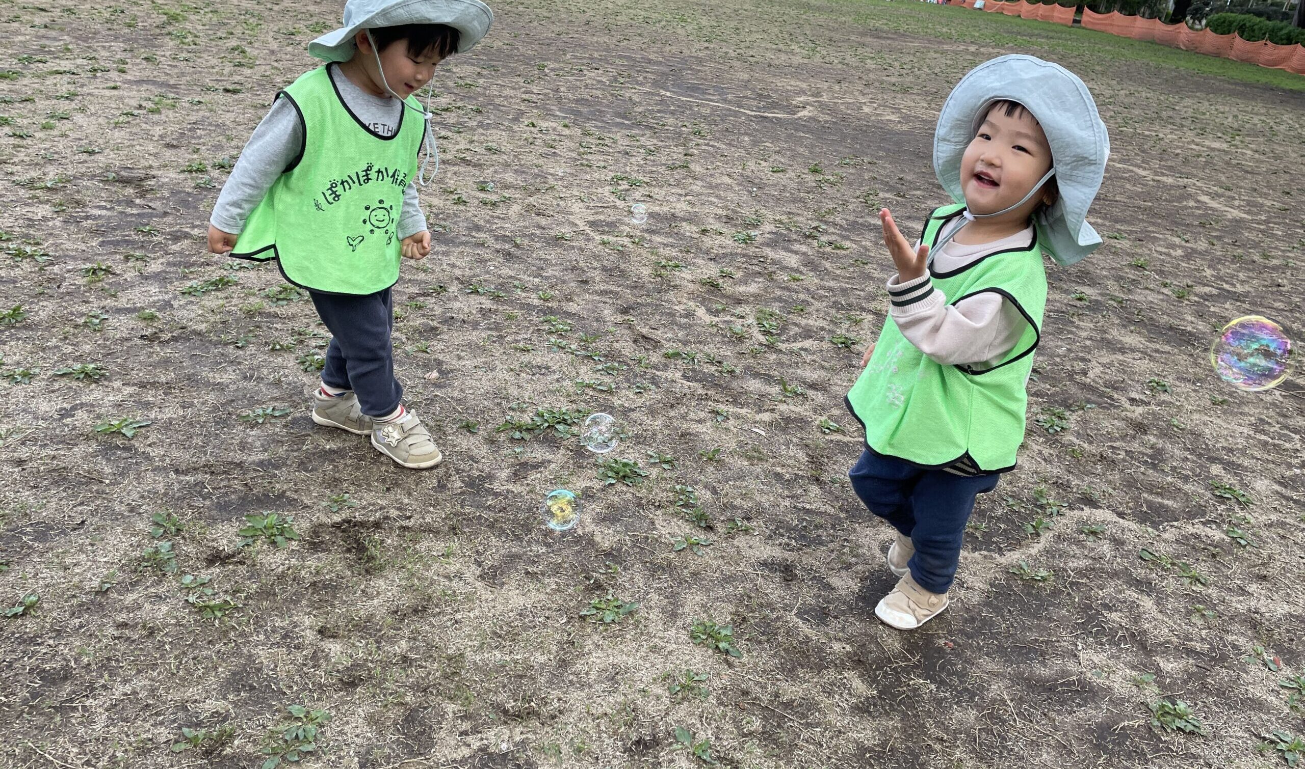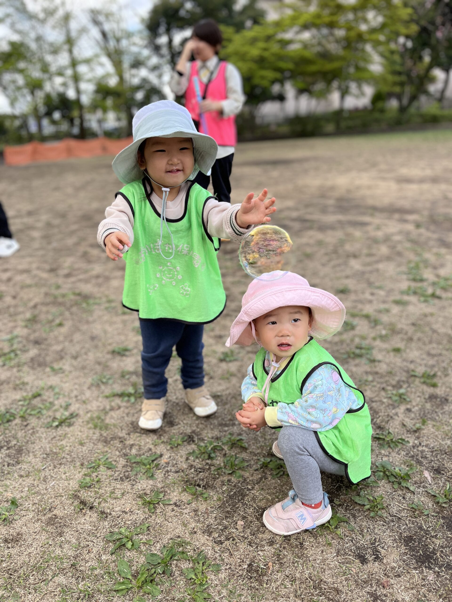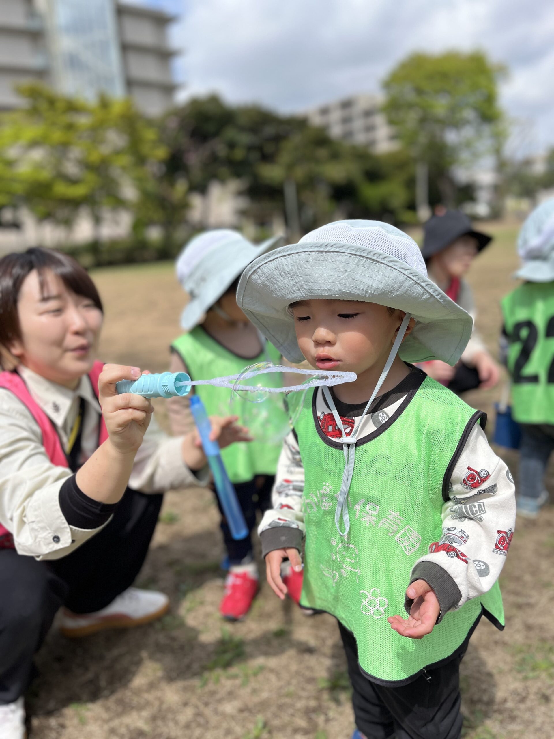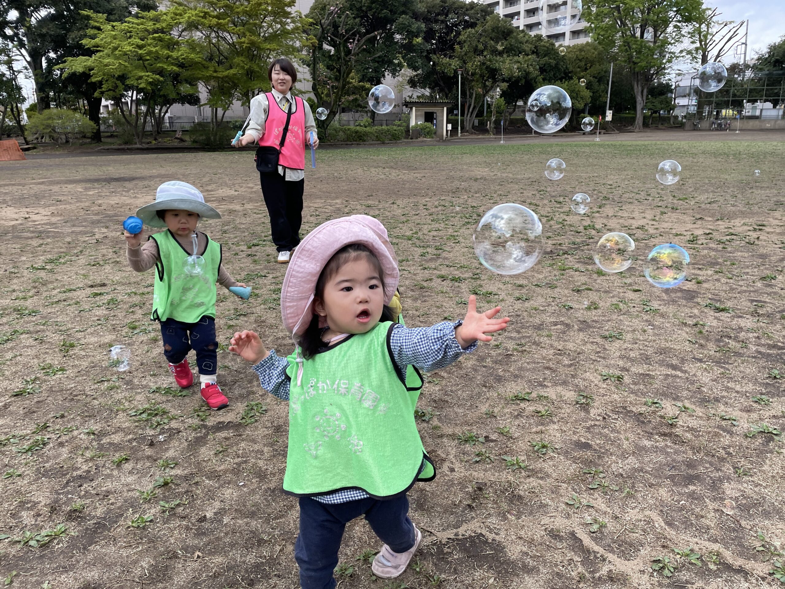 公園では、先生がシャボン玉を飛ばしました。
