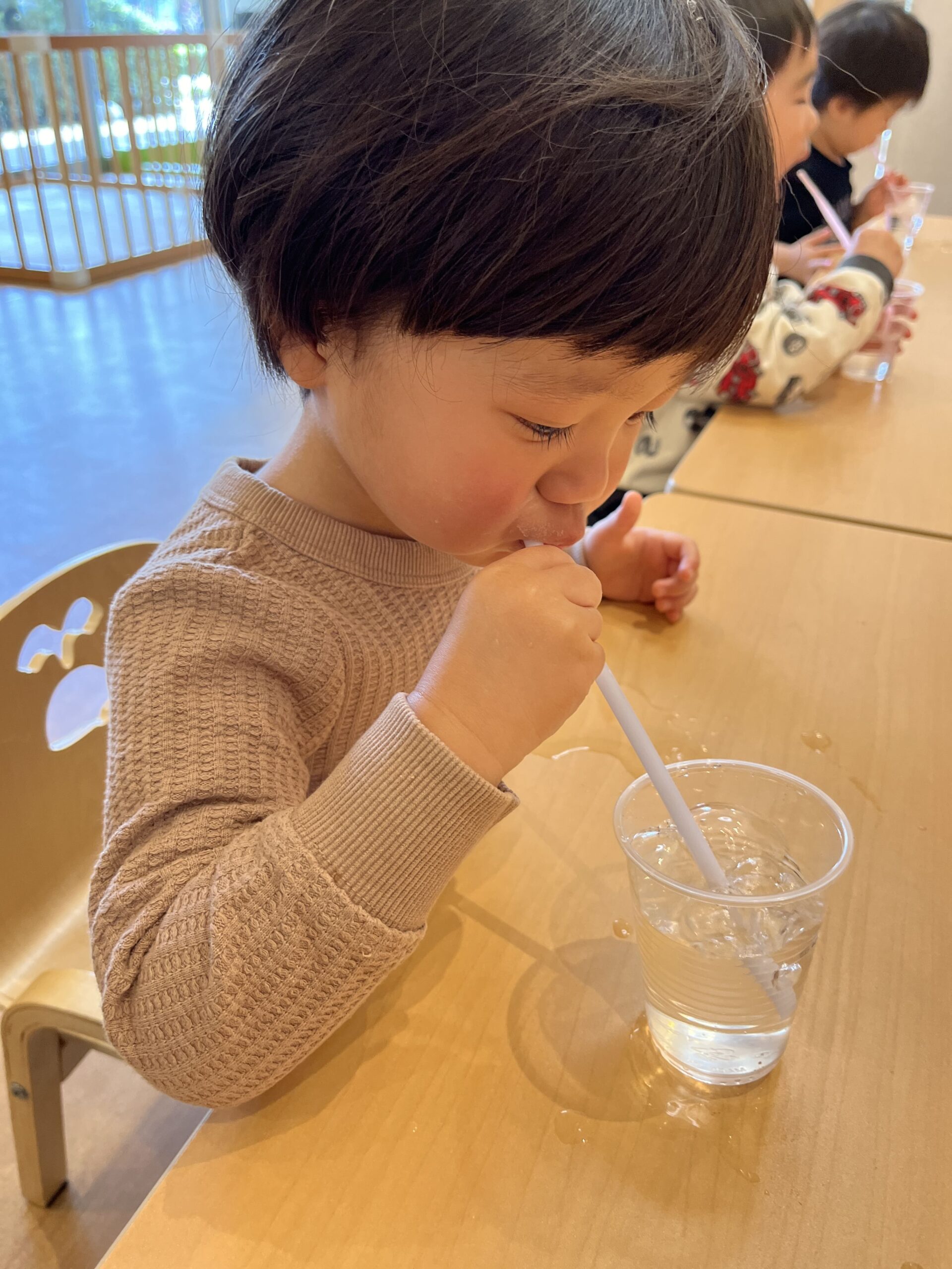 透明のカップにぬるめの白湯を用意して、ストローを使った実験を行いました。