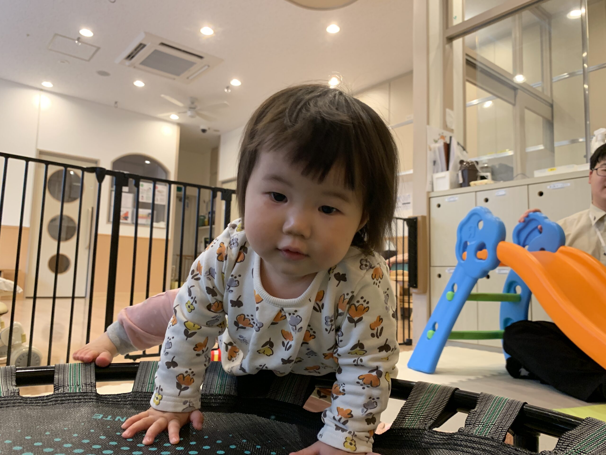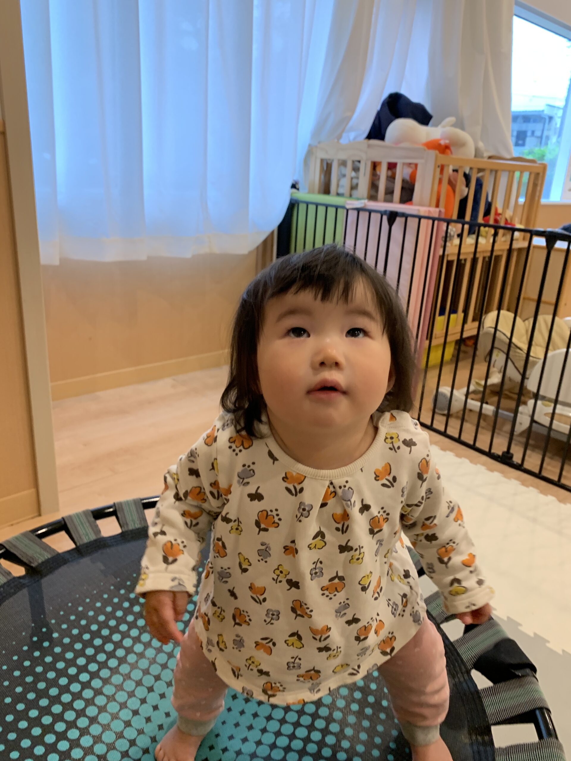 トランポリン遊びの後、2歳児のお友だちが「先生、楽しかったね!」と声をかけてくれました。