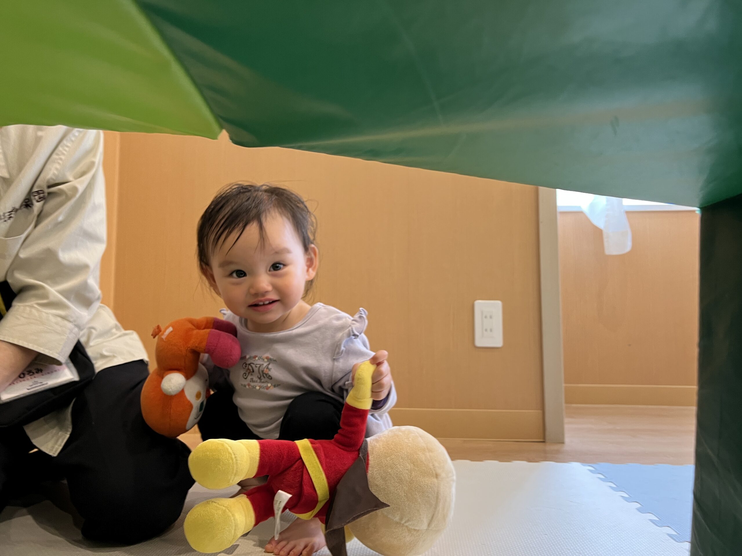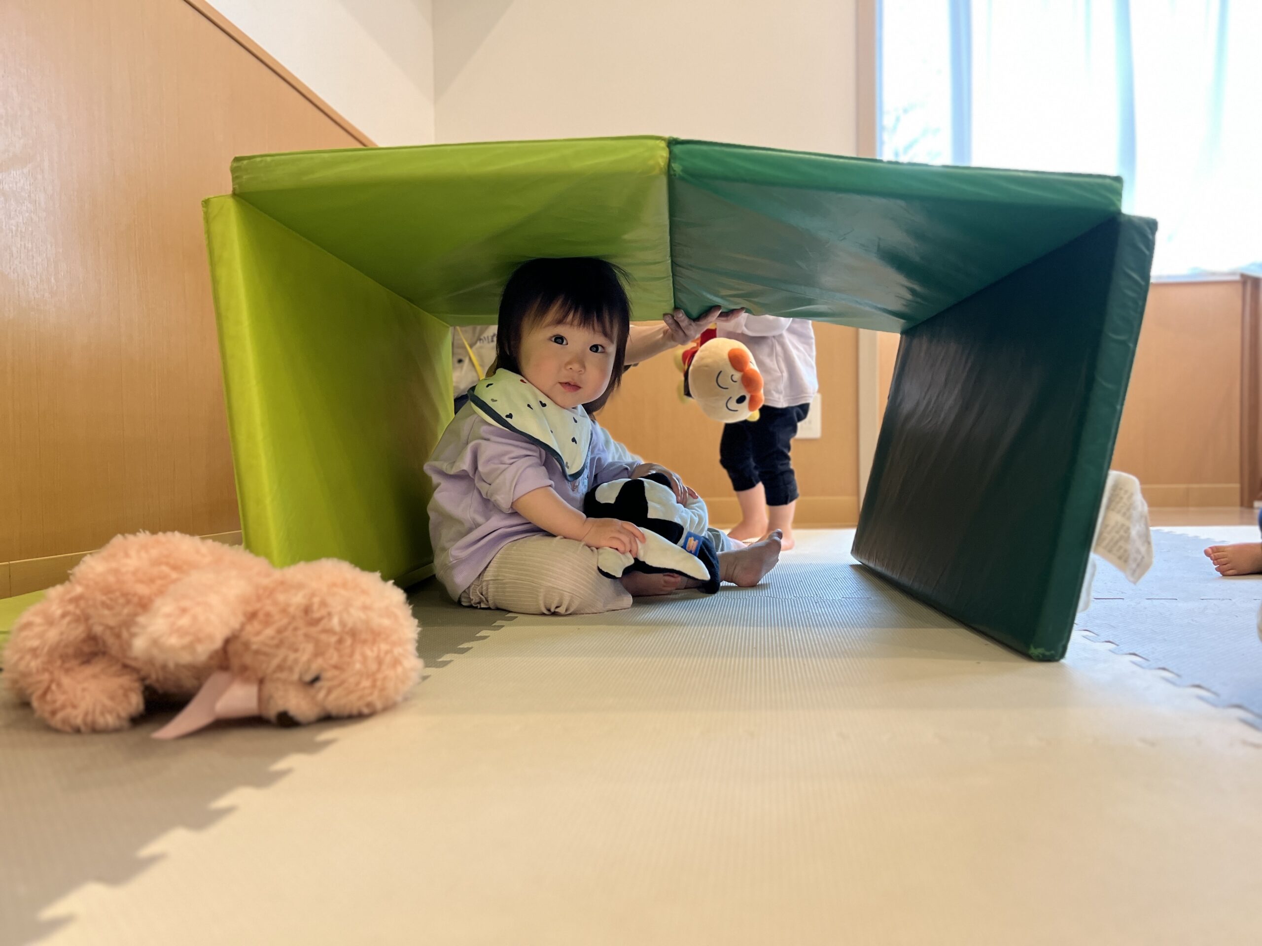その後は、マットでトンネルを作り、子どもたちはトンネルの向こう側にいる先生に向かって「ばぁ!」と顔を出しては大爆笑(笑)。