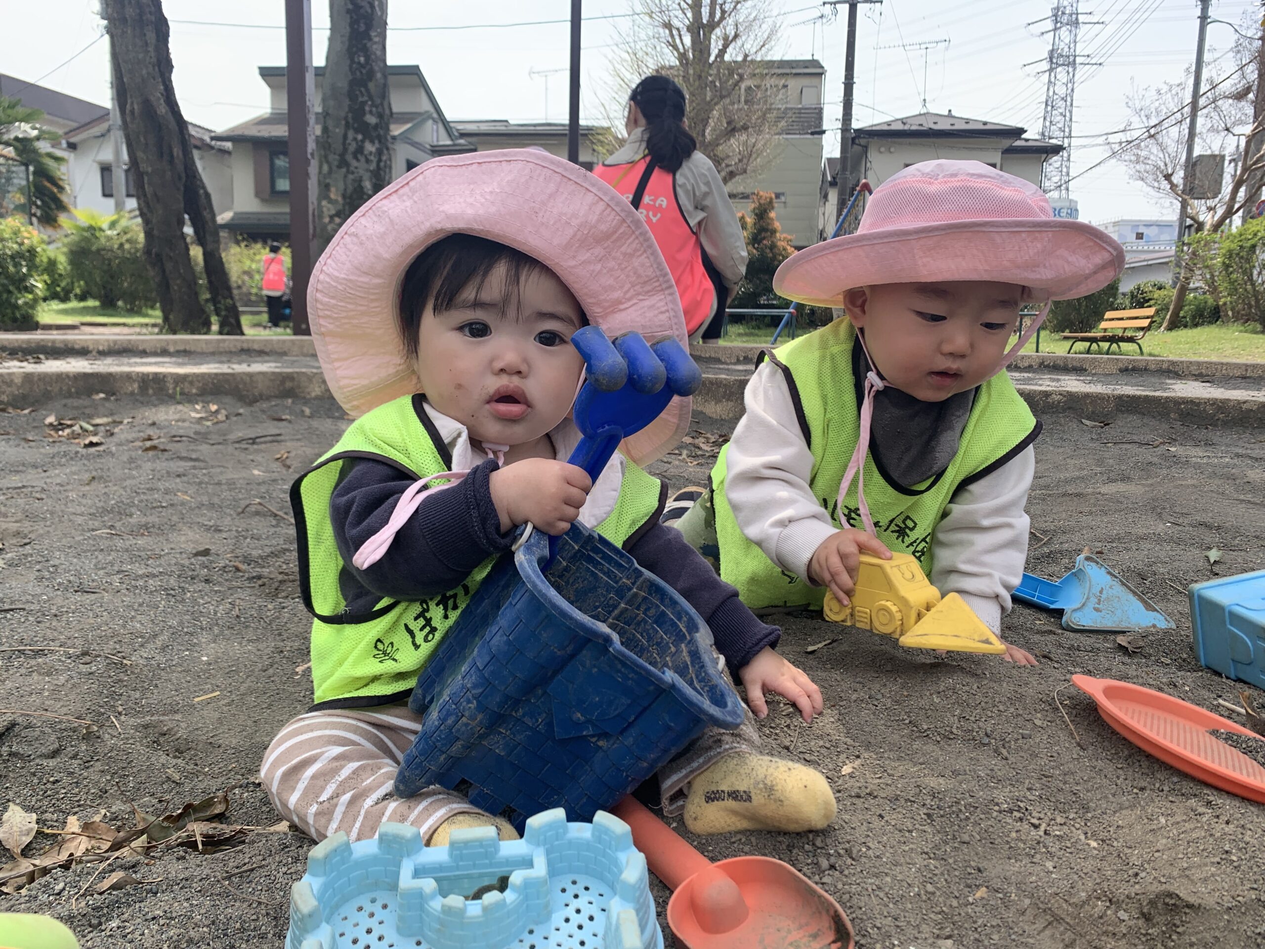 0歳児、1歳児のお友だちは、お砂場で砂の感触を楽しみながら遊びました🌟