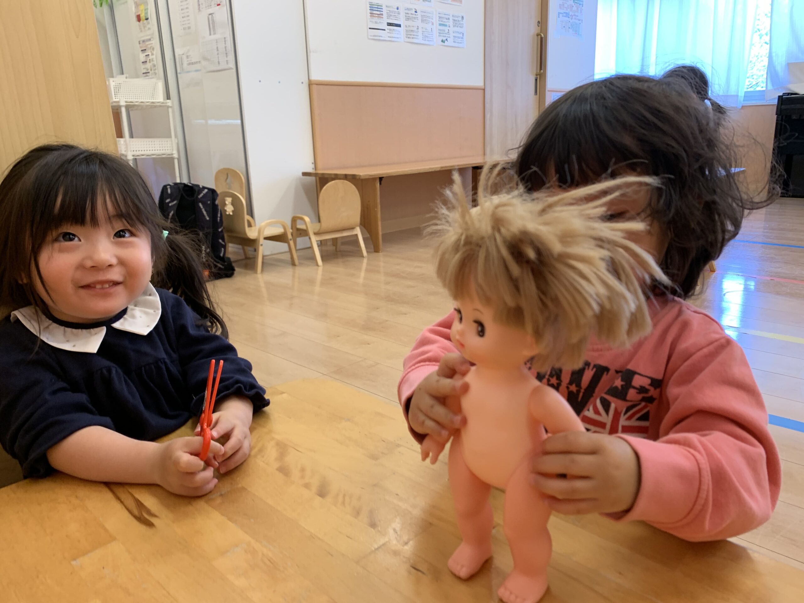 先生と一緒におままごとのお皿を手に取って、食べ物を並べる真似をしたり、お友だちと「お料理を作るよ~!」と楽しそうに声をかけ合っていた姿がとっても可愛かったです♡