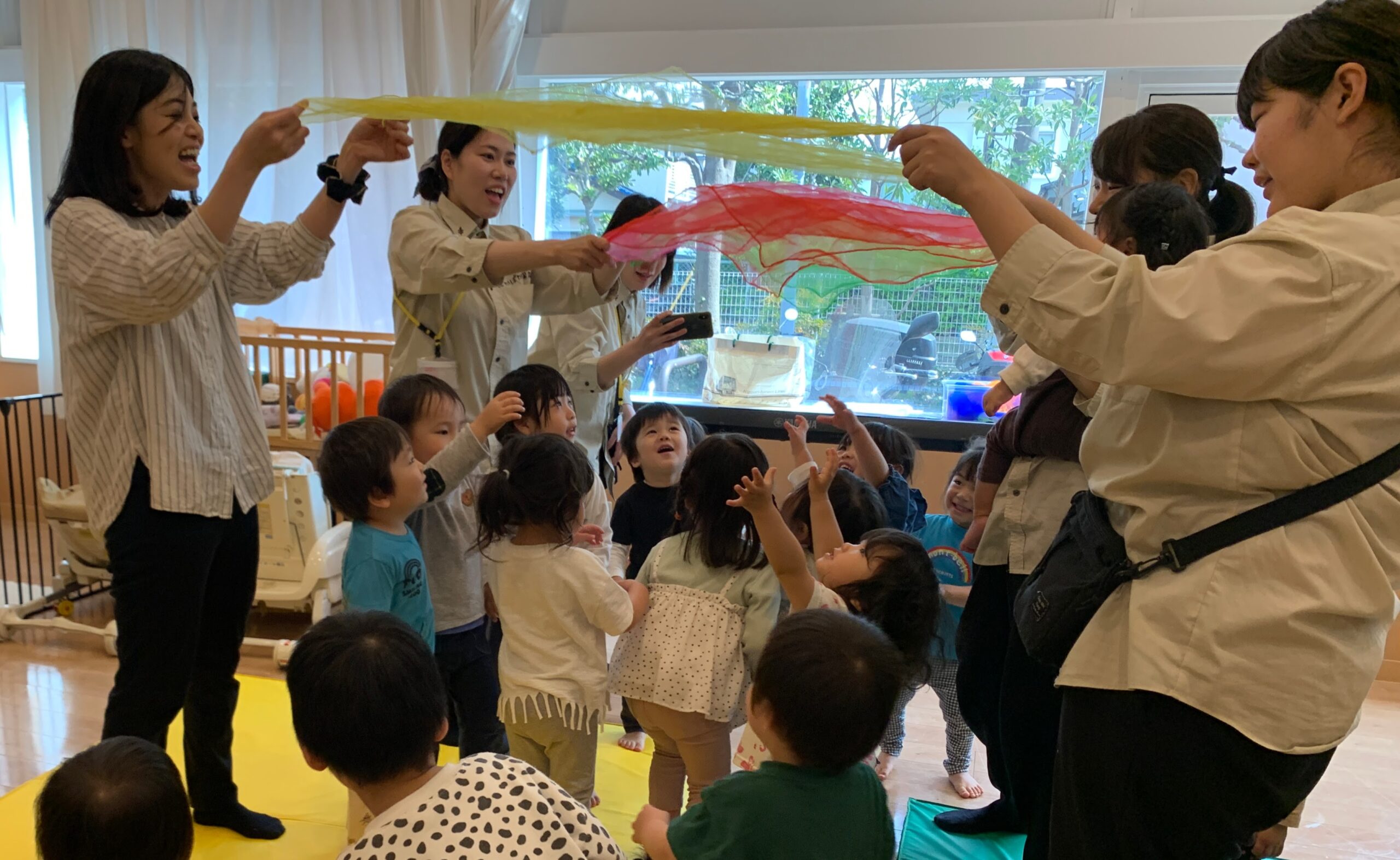 お歌『にじ』に合わせて、虹のトンネルをくぐる子どもたち🌈