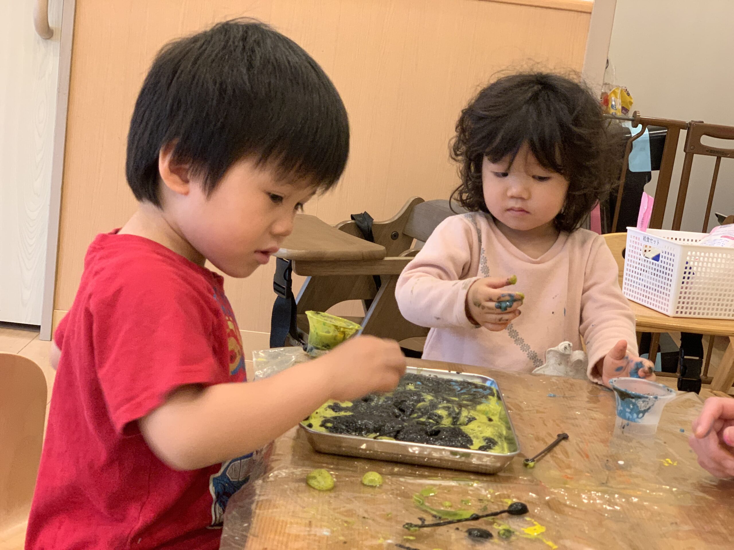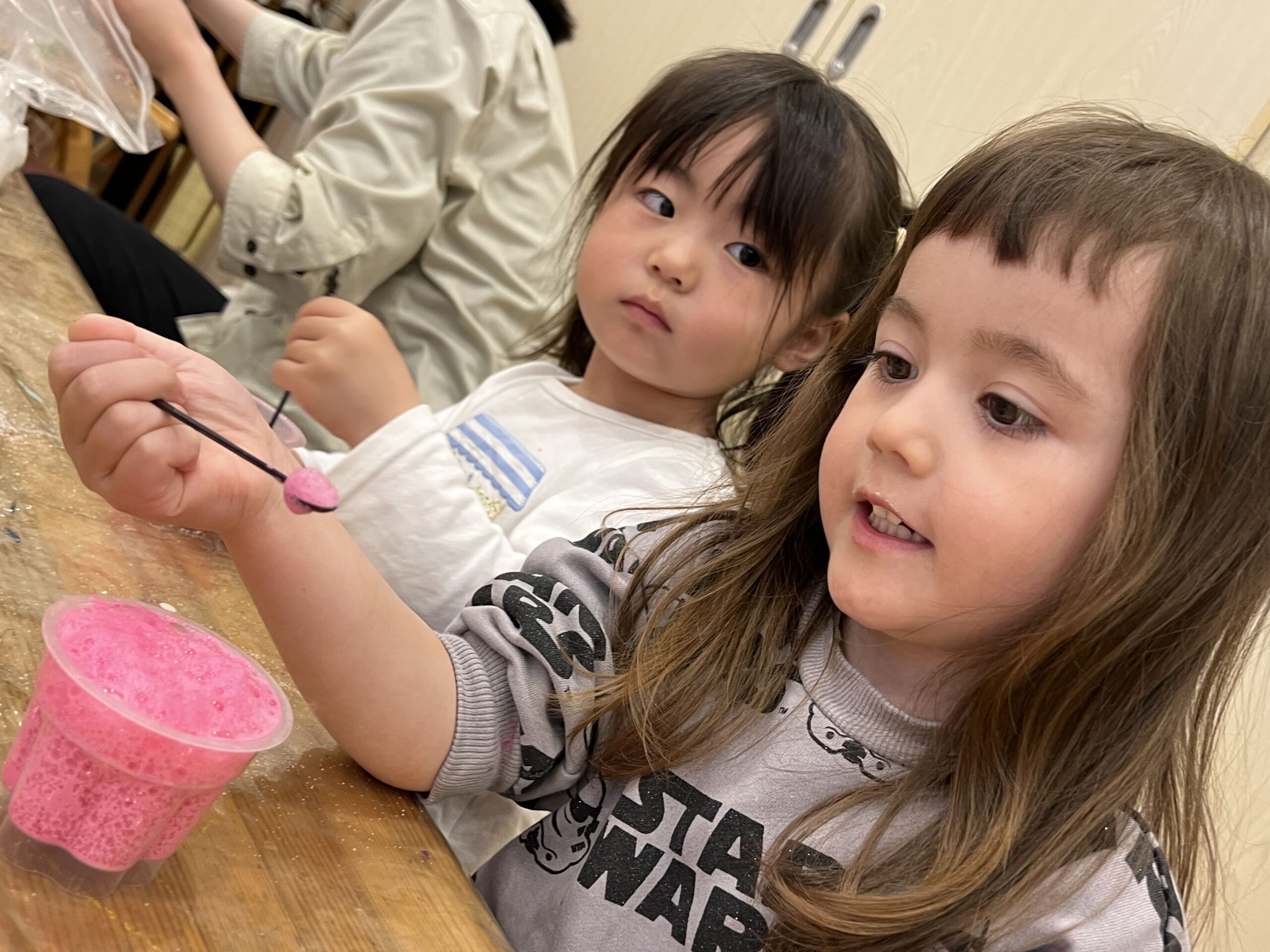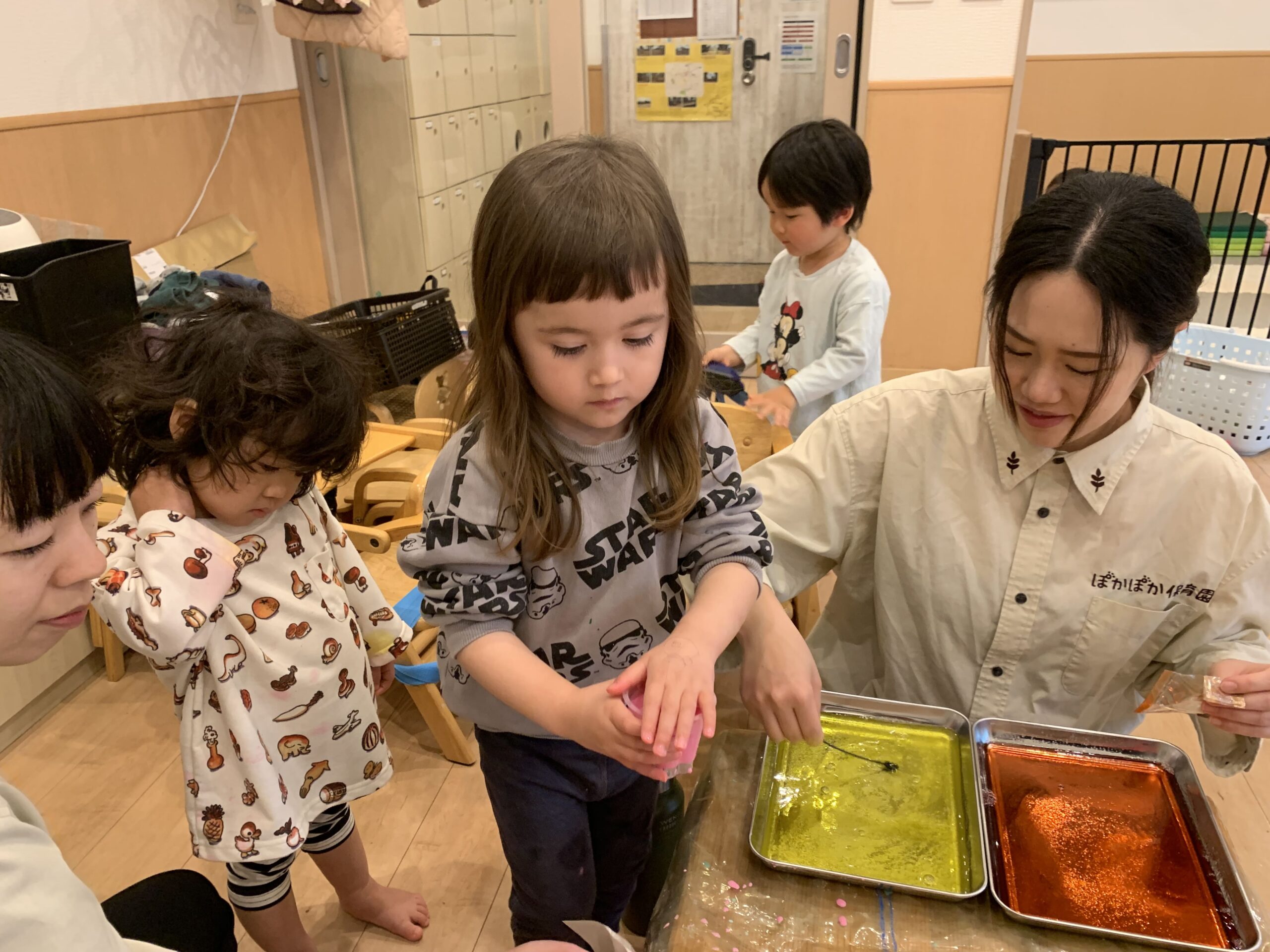 その後は、ぬるま湯に食紅とゼラチンを入れて冷蔵庫に入れる実験に挑戦しました!ゼラチンがどうなるのか、食紅がどんな色になるのか、みんなで楽しみに待っています♪ 「午後見に行こうね!」と、子どもたちも楽しみにしている様子がとても可愛らしかったです♡ こうした実験を通じて、子どもたちは科学に対する興味や探究心を育んでいきますね☆