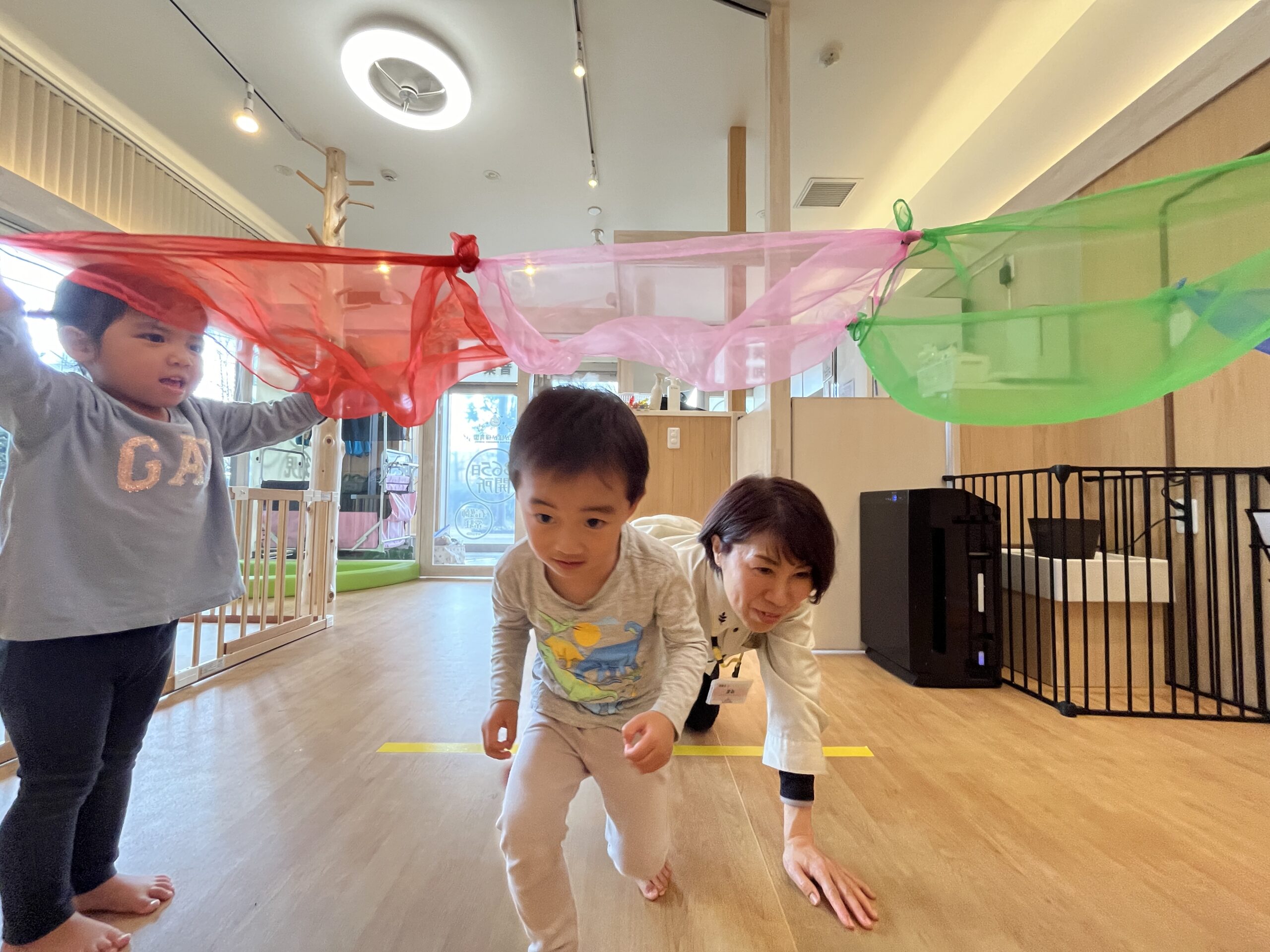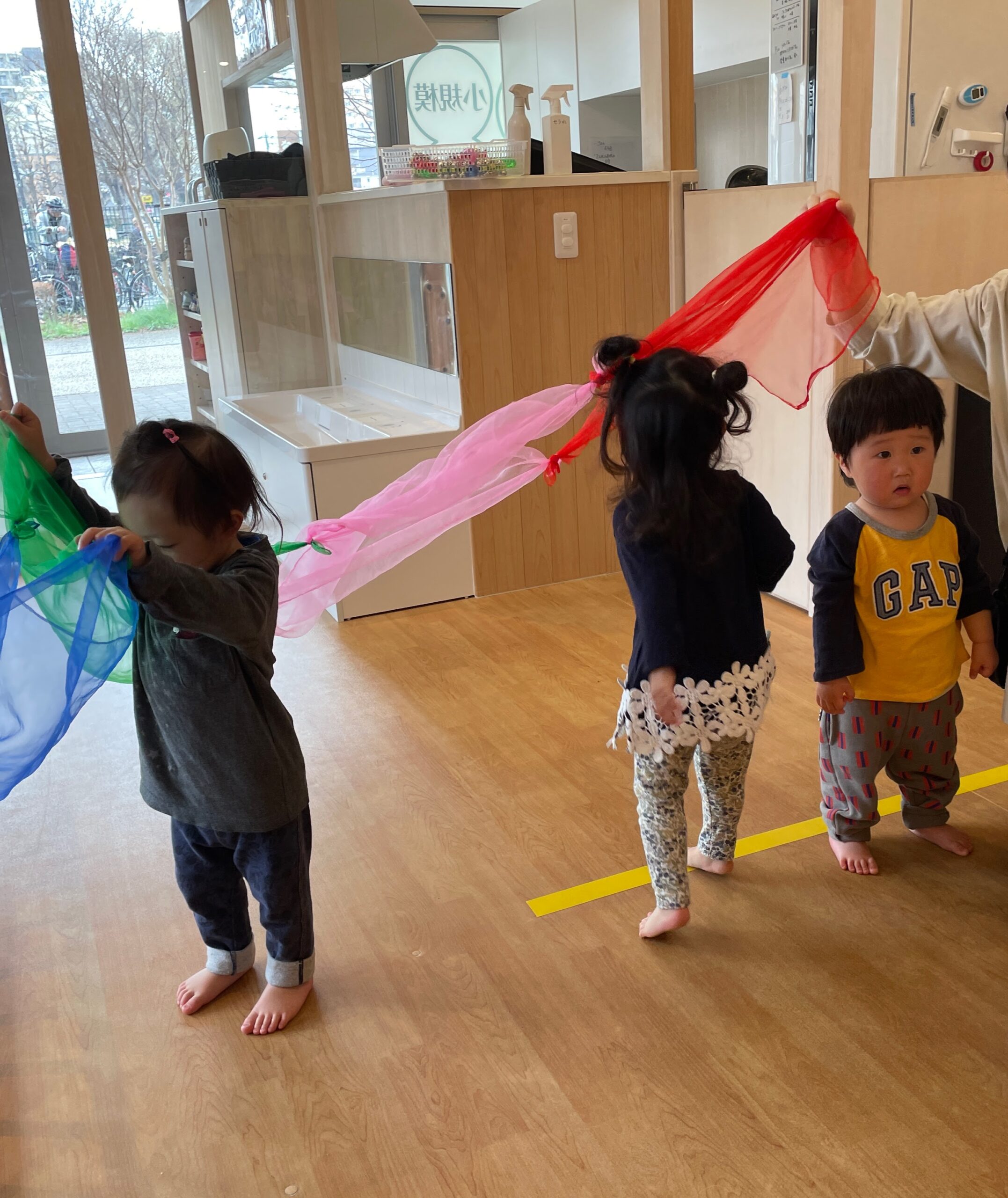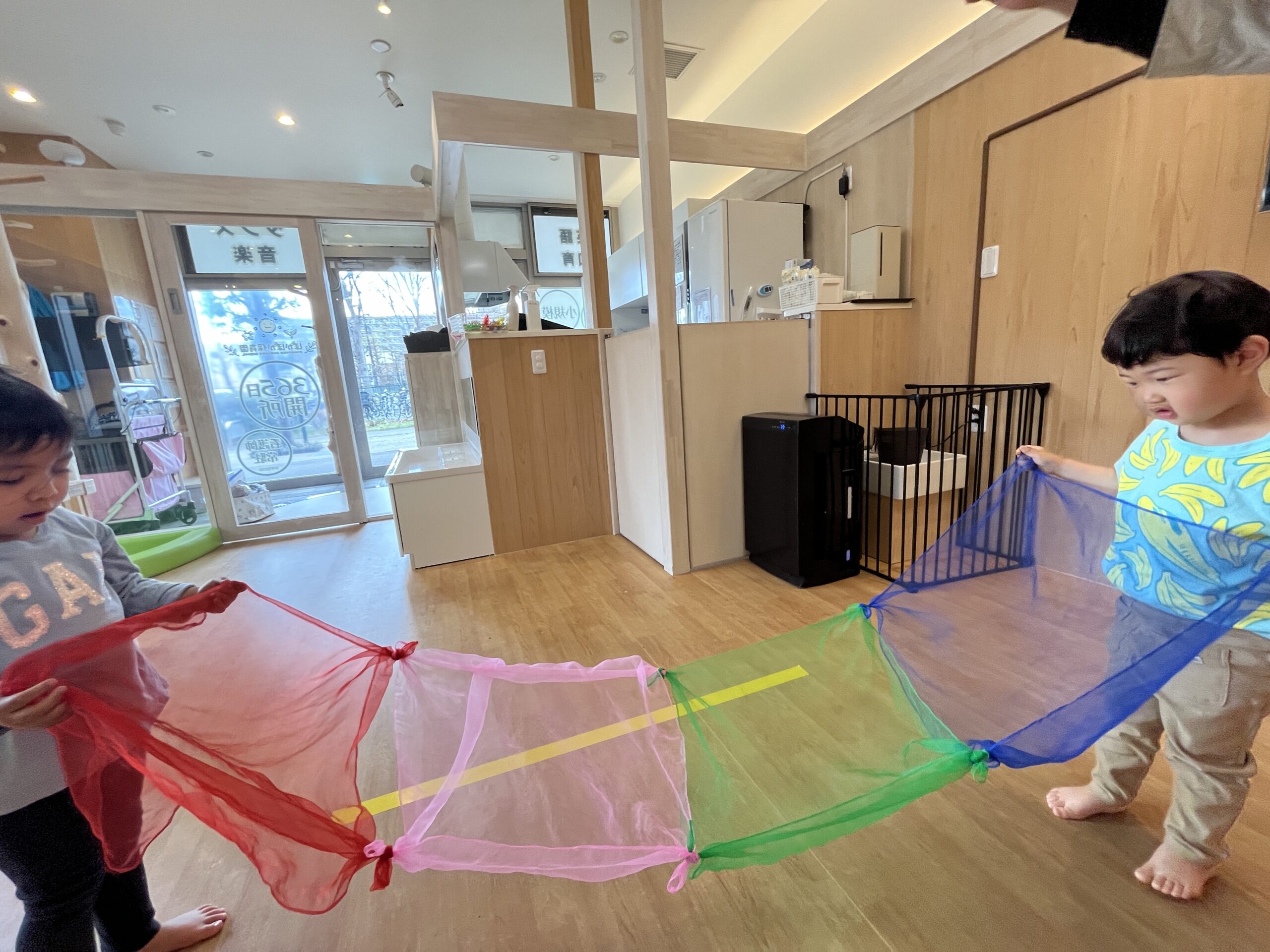 今月の歌の虹にちなんで、スカーフで虹のトンネルを作りました♪
