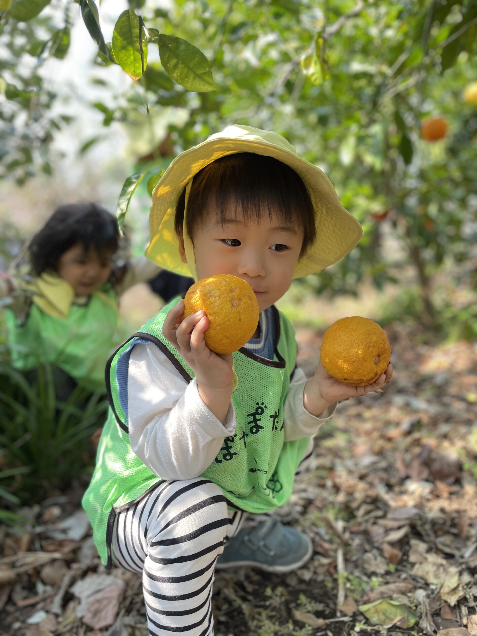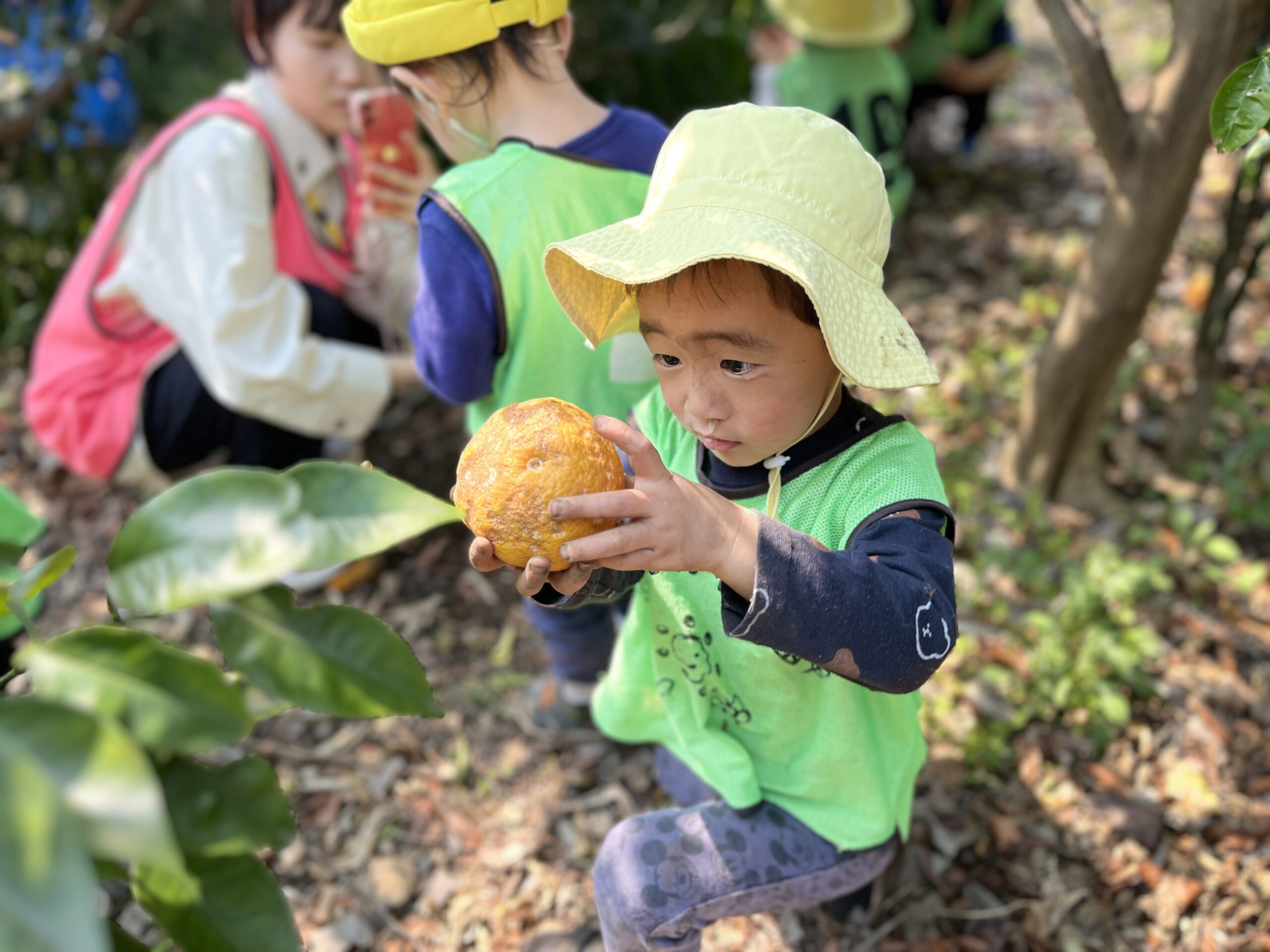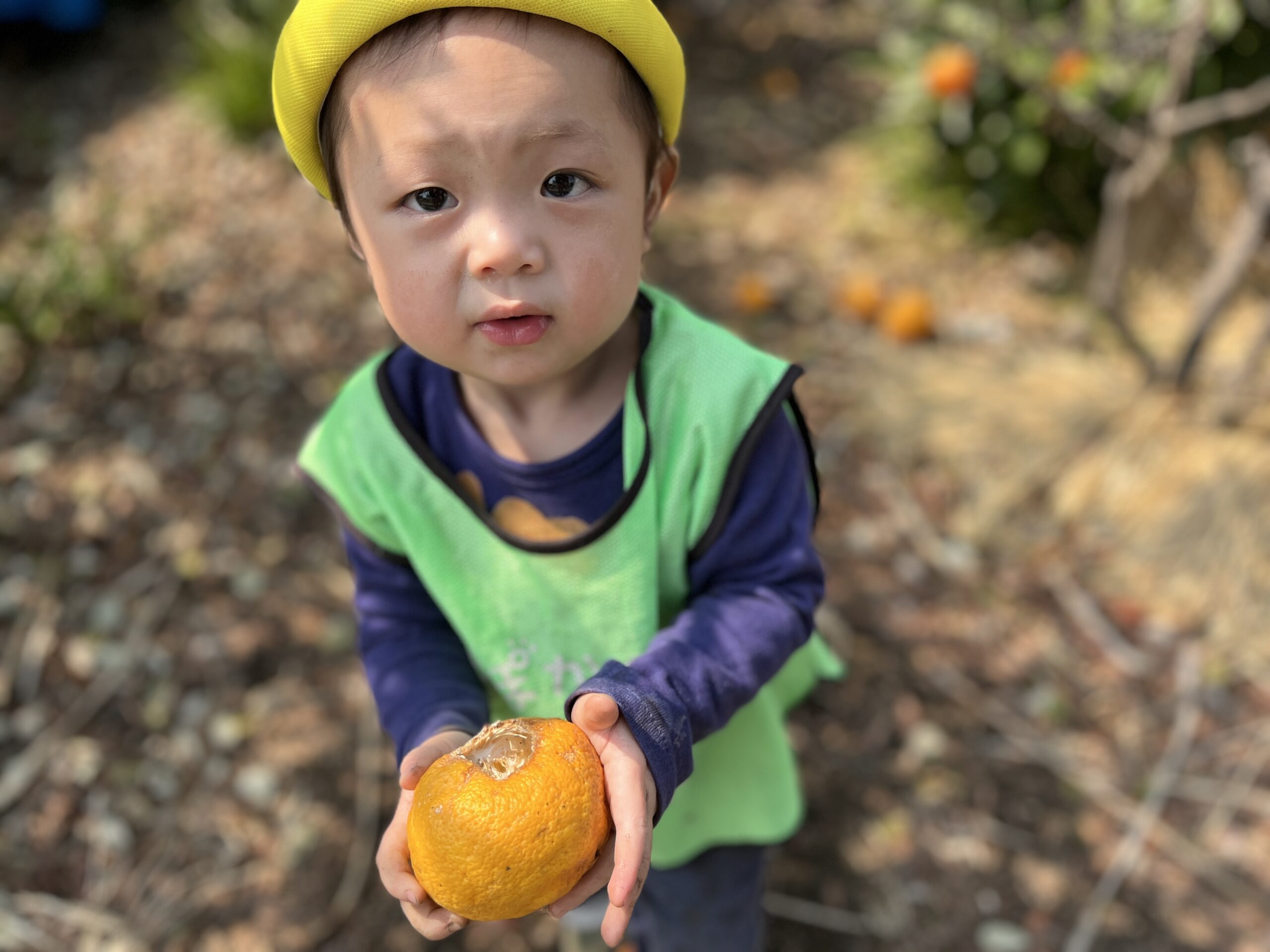 そして、畑の隅っこに何かを発見!「みかんが落ちてるよ!」と一人が声をあげると、他の子どもたちも興味津々。なんと、畑に落ちていたみかんを見つけました。みんなで「僕も!」、「私も!」と大喜びでそのみかんを見つけ、まるで宝物を見つけたかのように手に取っていました。自然の中での発見の喜びを、子どもたちは感じているようでした。