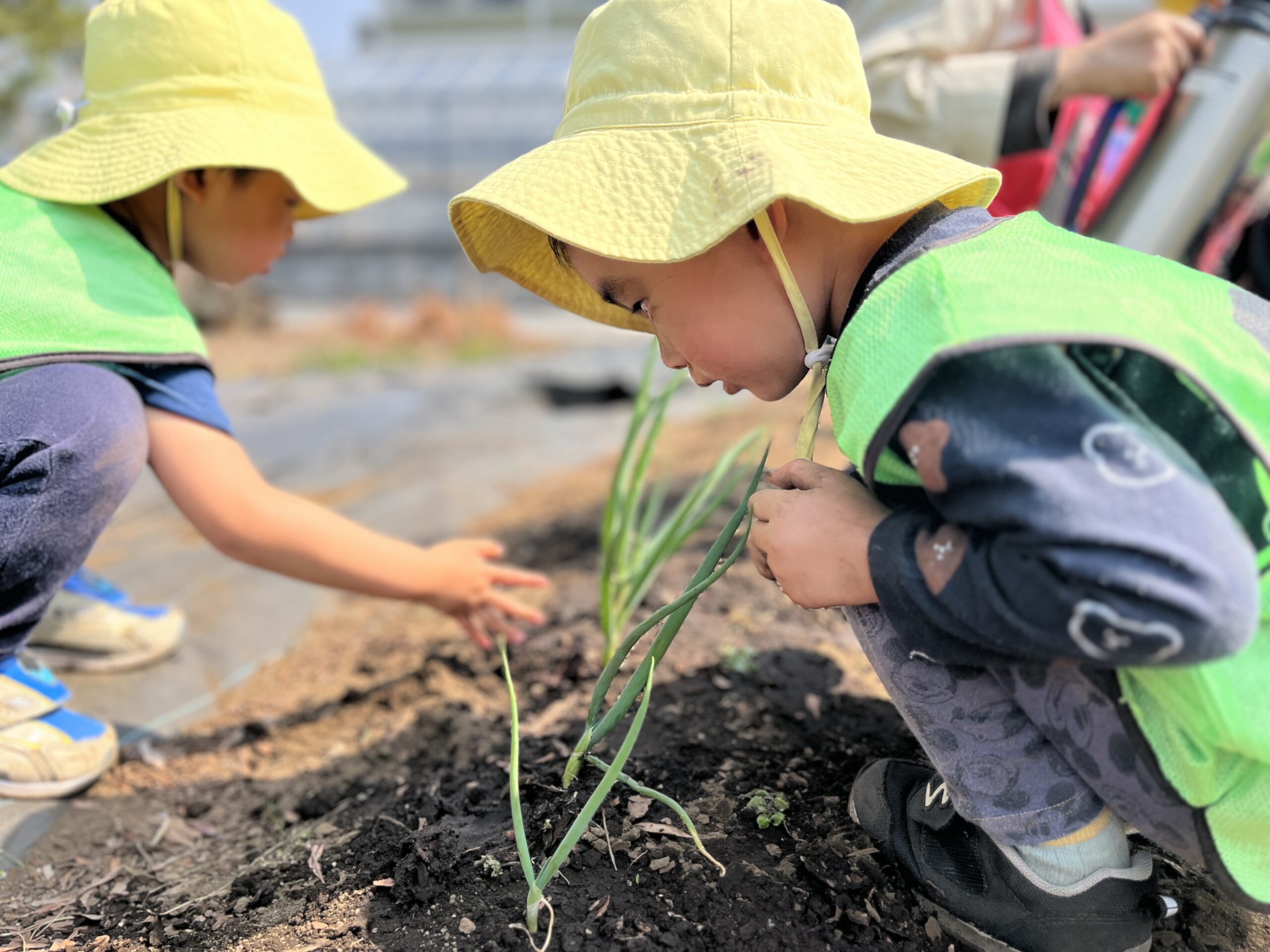 畑までの道のりは、ちょっと長かったけれど、みんなで一歩一歩歩いていきました。小さな足で、一生懸命歩く姿がとってもかわいかったです。畑に到着すると、みんなで手にジョウロを持って、優しくねぎに水をあげました。「ねぎ、もっと大きくなってね~!」と声をかけながら、子どもたちはとても楽しそうに水やりをしていました。
