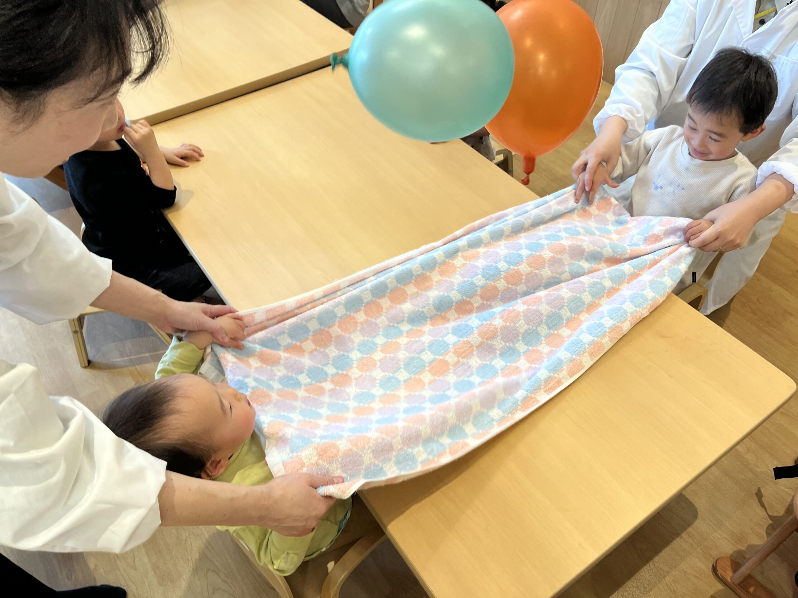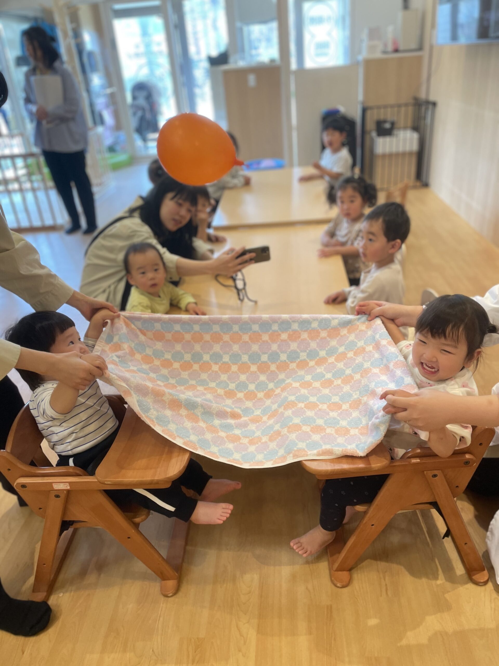 そして大きい布では、バスタオルを広げて風船遊び!両端をみんなで持って「せーの!」と上に持ち上げると、風船がふわ〜っと空高く飛び上がっていきました🎈それを見ていたおともだちも「わ~♡」「きゃ~♡」と笑顔満開!風船が舞うたびに歓声が響いて、保育室全体が春のように明るくなりました。