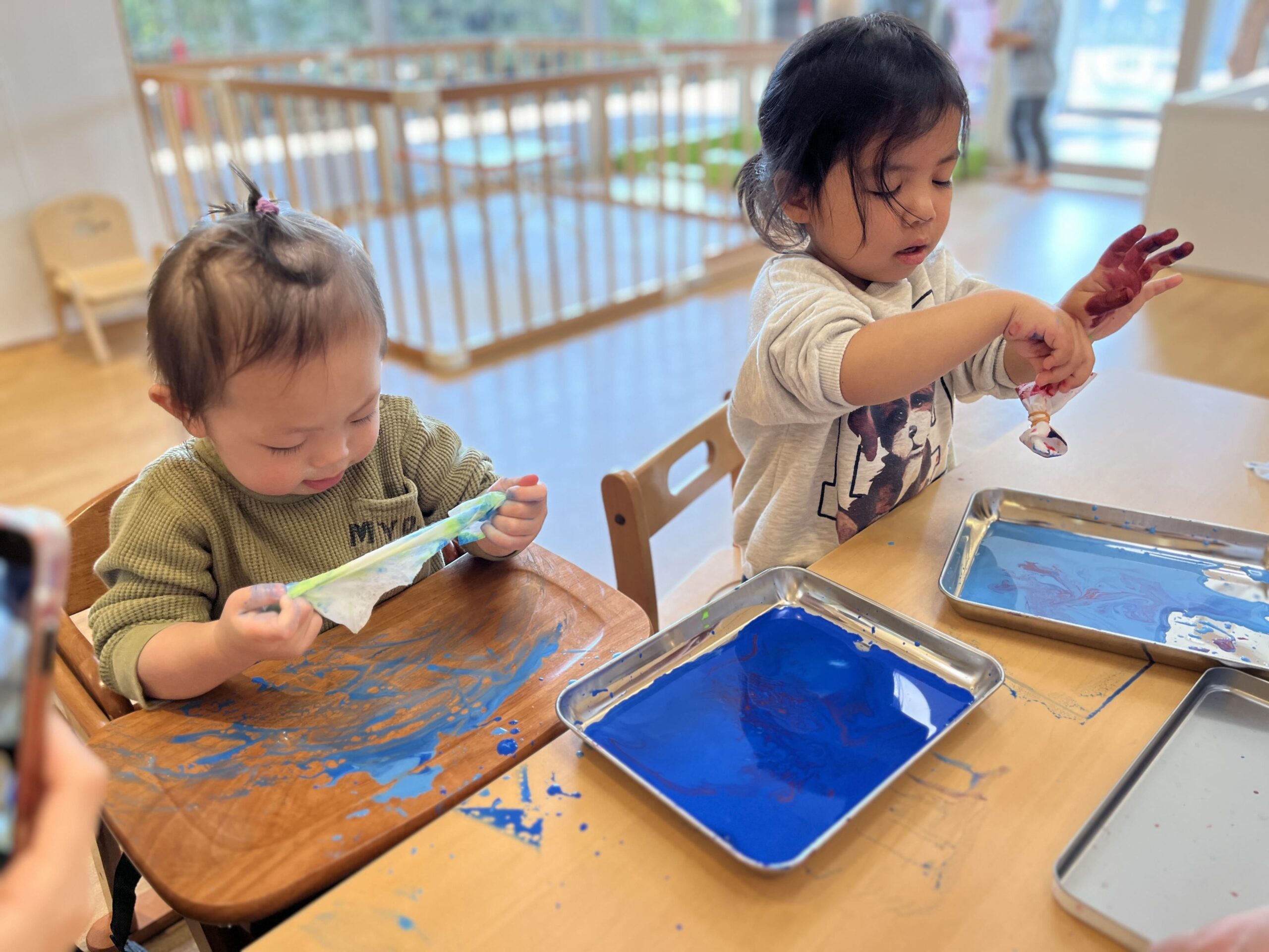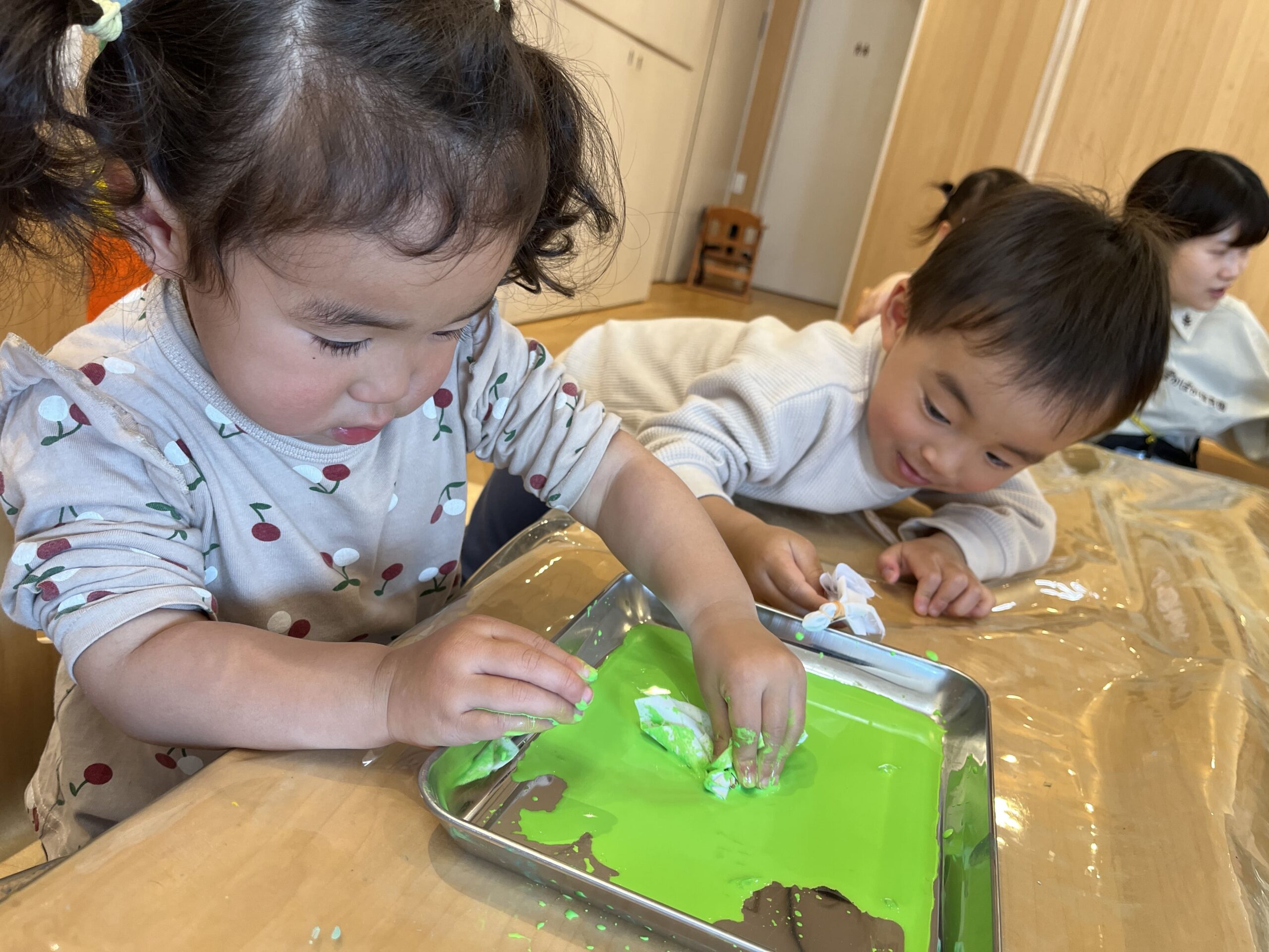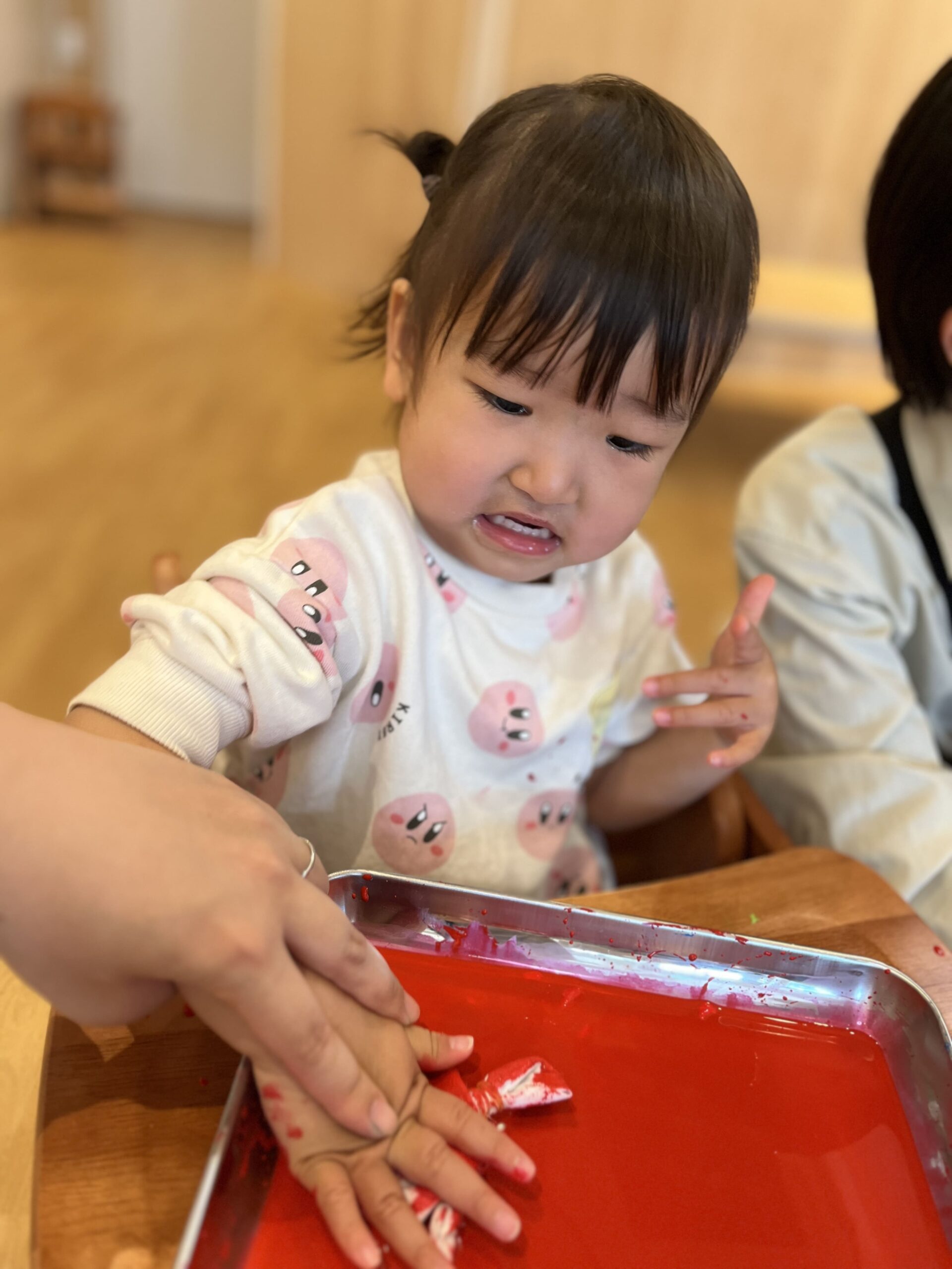 輪ゴムを巻くのはちょっと難しいので、先生と一緒に。「ここを持っててね」「うん!」というやりとりもあちこちから聞こえてきました。絵の具のついた布を広げると…「うわ~!」「きれーい!」と目をまんまるくする子も。中には、手も服も絵の具だらけになるほど夢中になっている子もいて、その姿には私たち大人が驚くほどの集中力でした✨