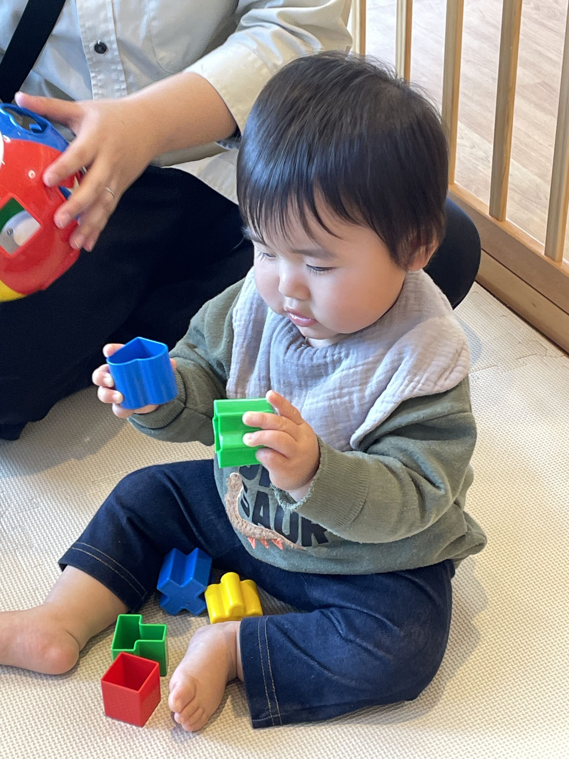 型はめおもちゃも様々な色や形で目にも感触にも面白いね。