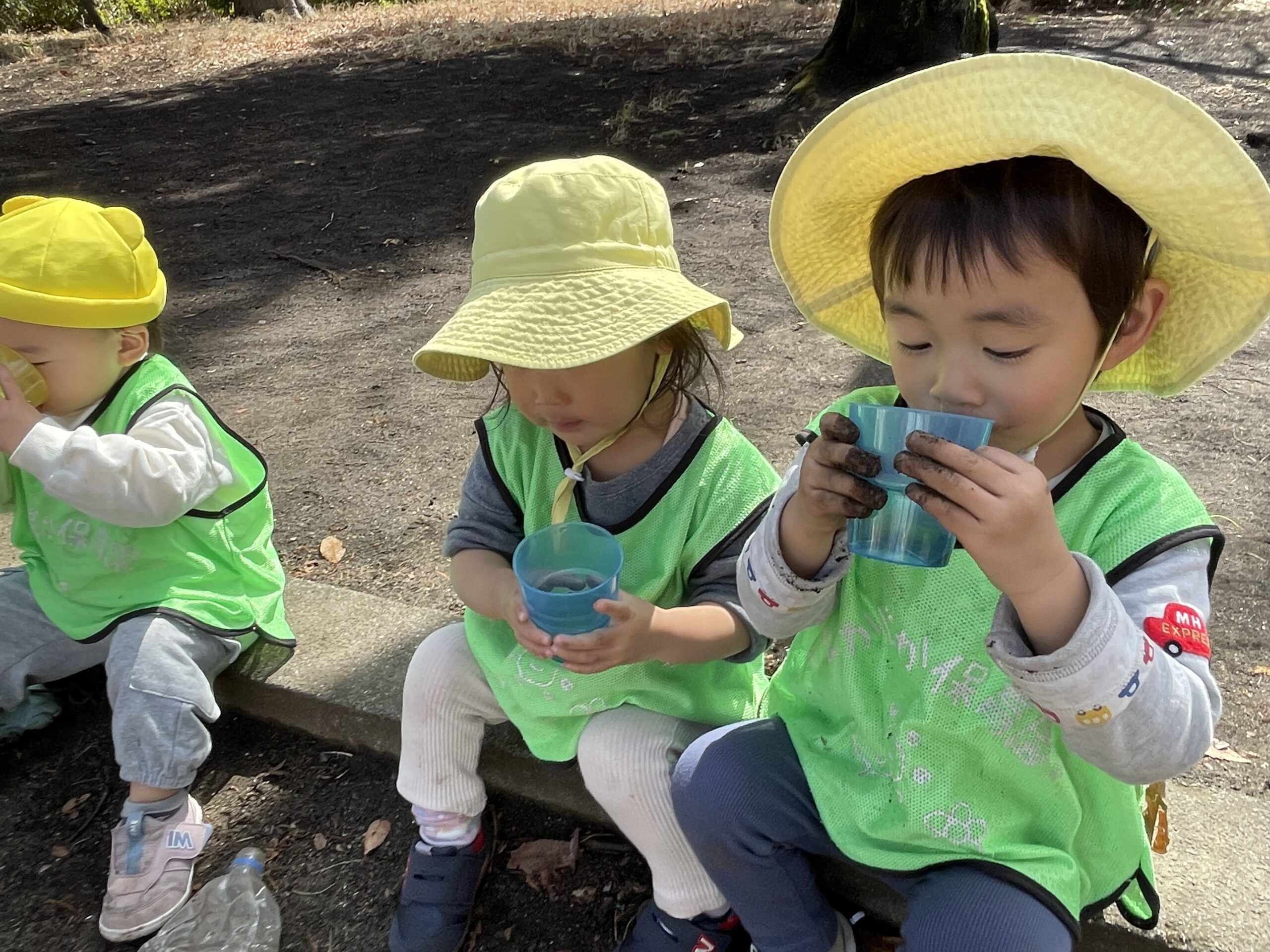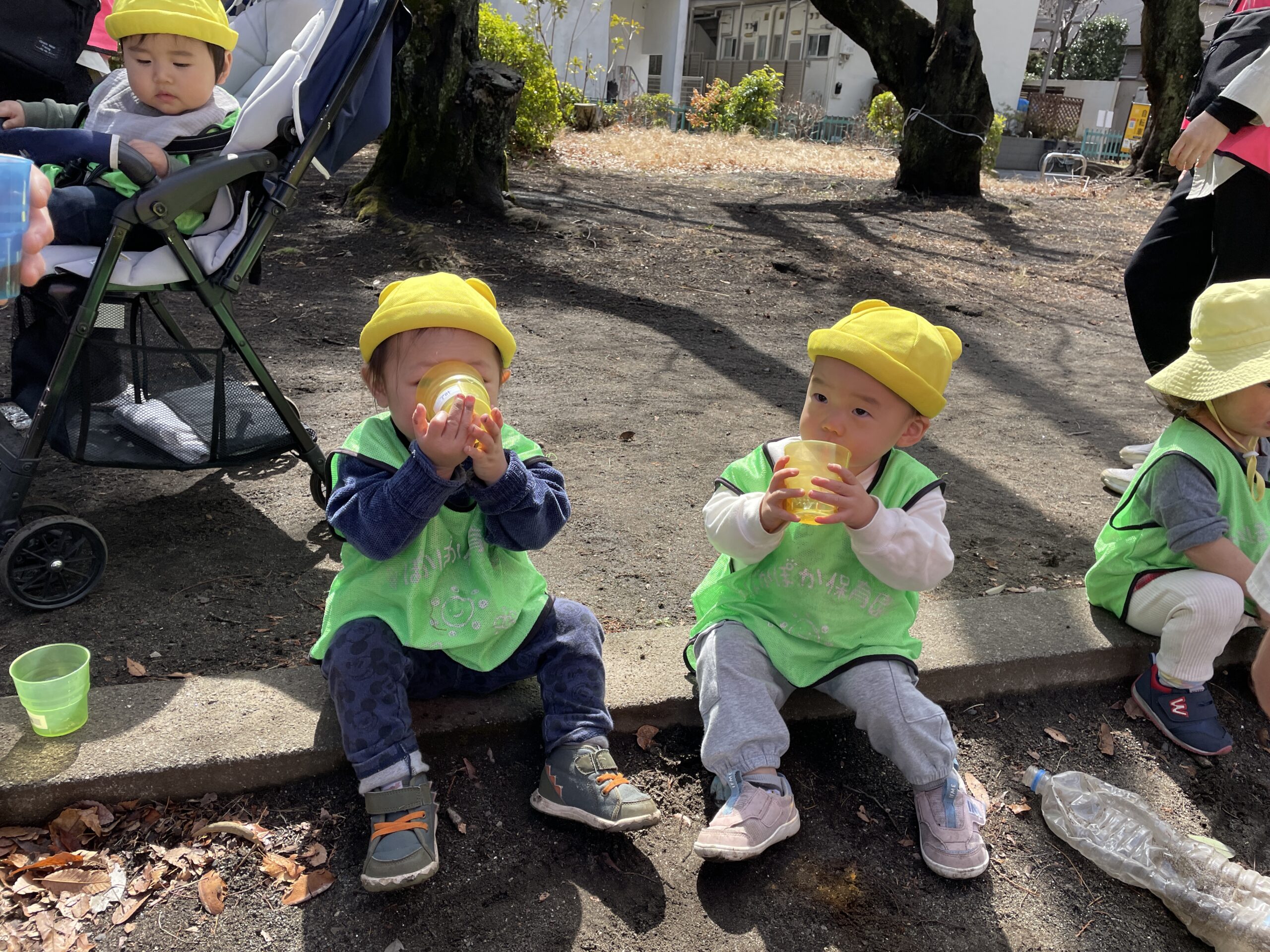 たくさん遊んでのどが渇いたよ。お日様の下、ティータイムをしました♬