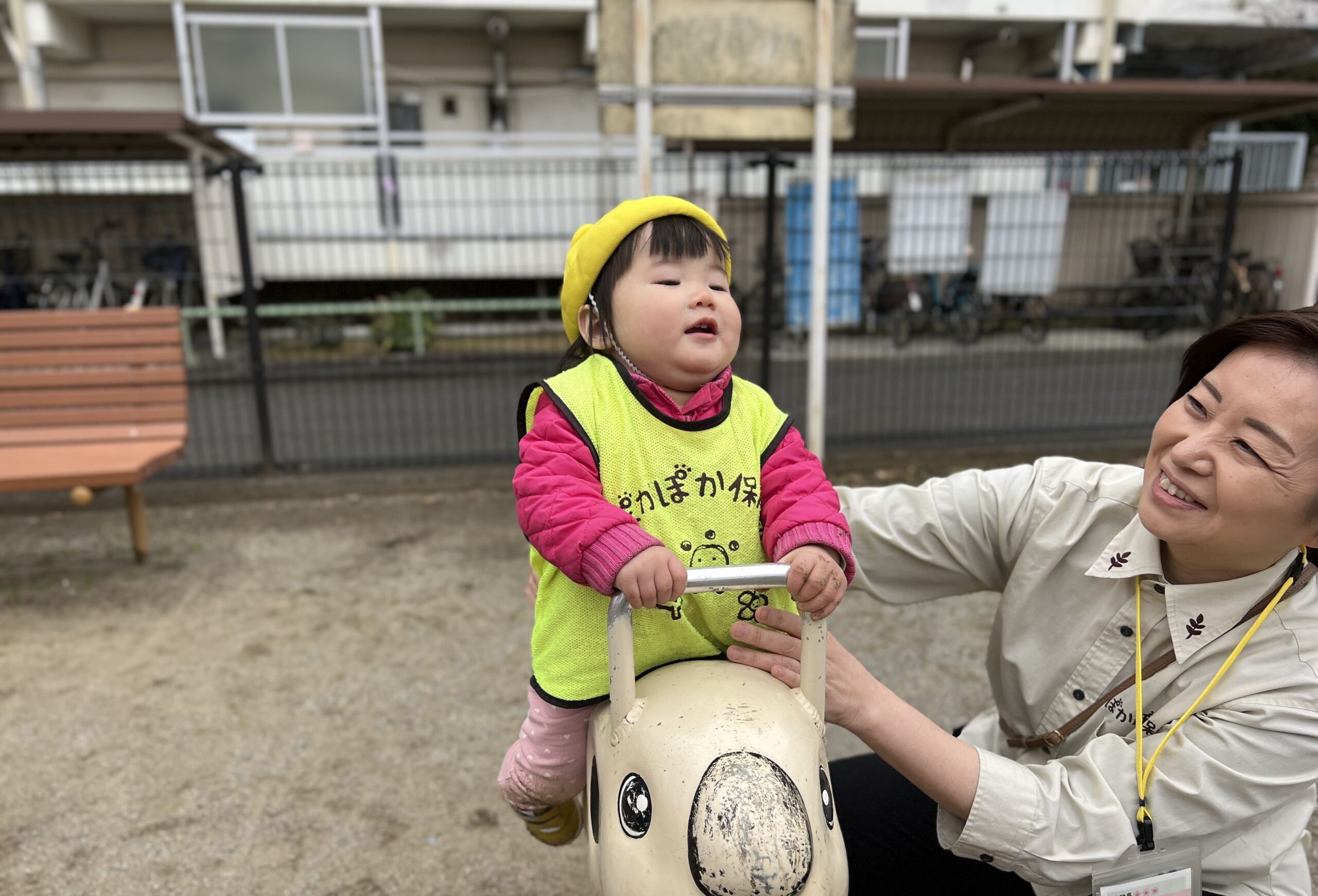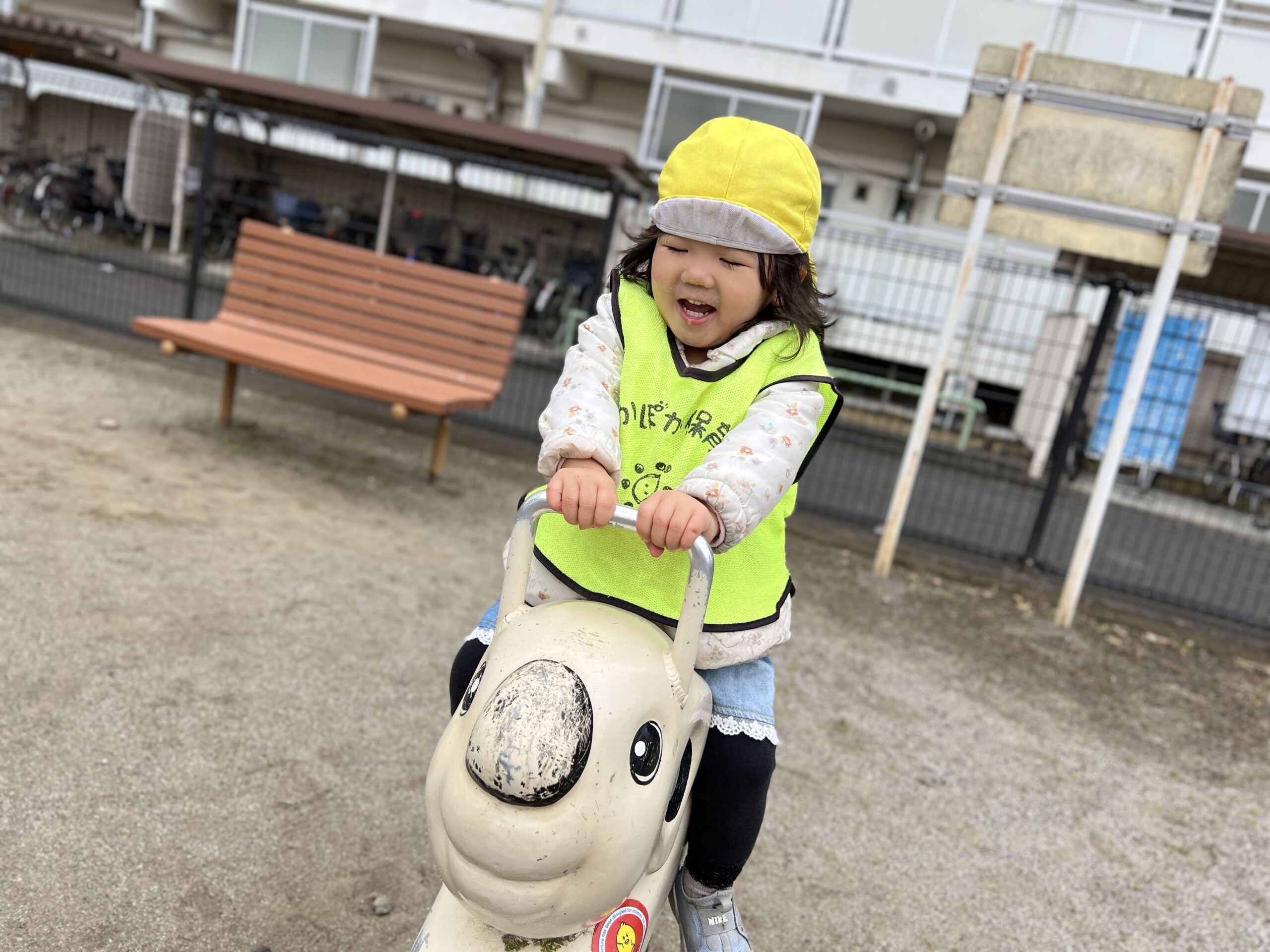 大きい子は自分で乗って楽しみ、小さい子は先生の補助付きで「ゆらゆら~♪」。