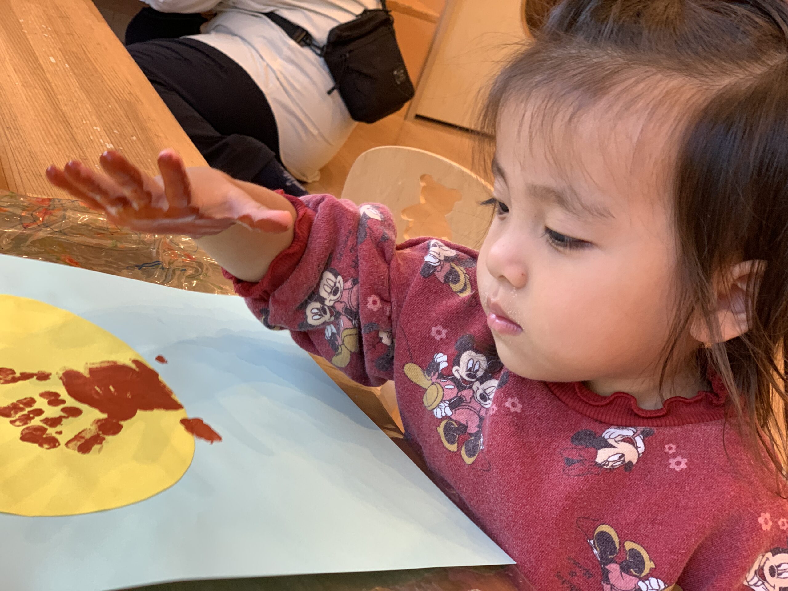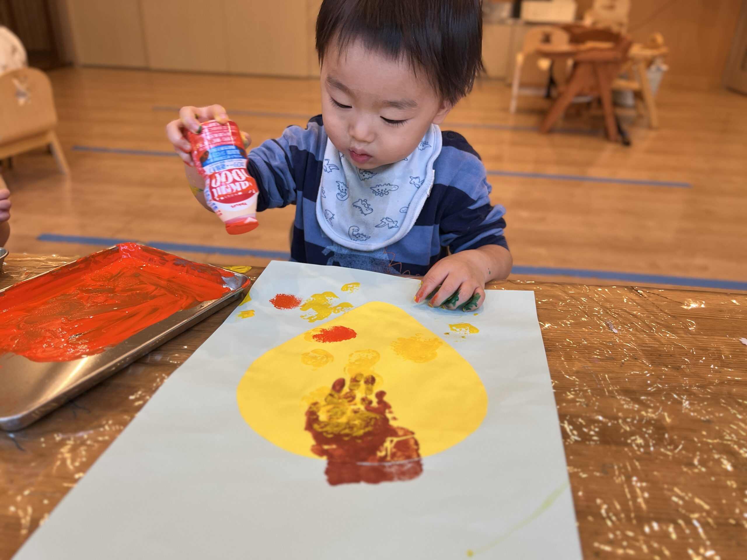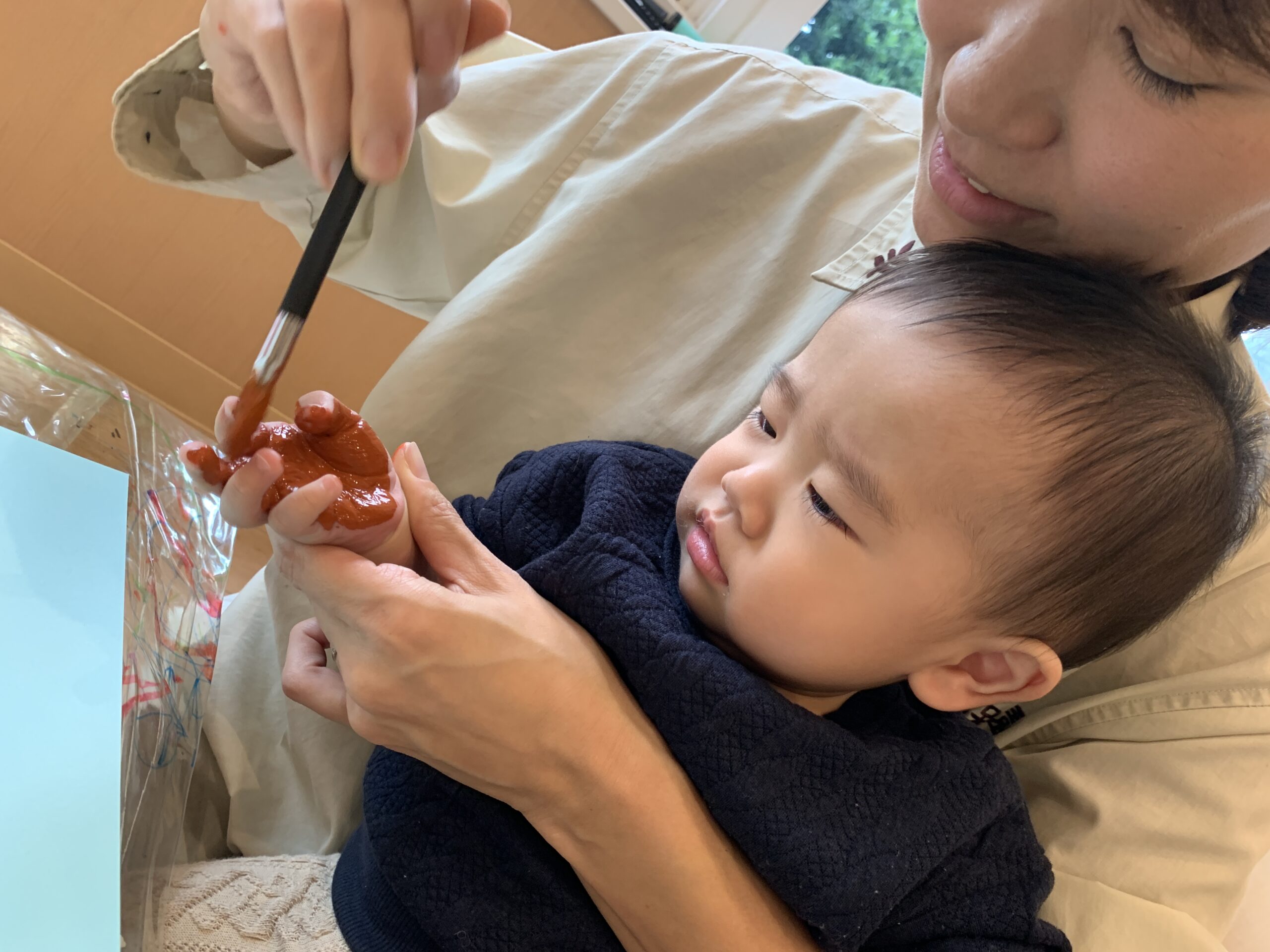 ひんやりとした絵の具の感触に、くすぐったそうに笑ったり、真剣な表情をしたりと、様々な反応が見られました。