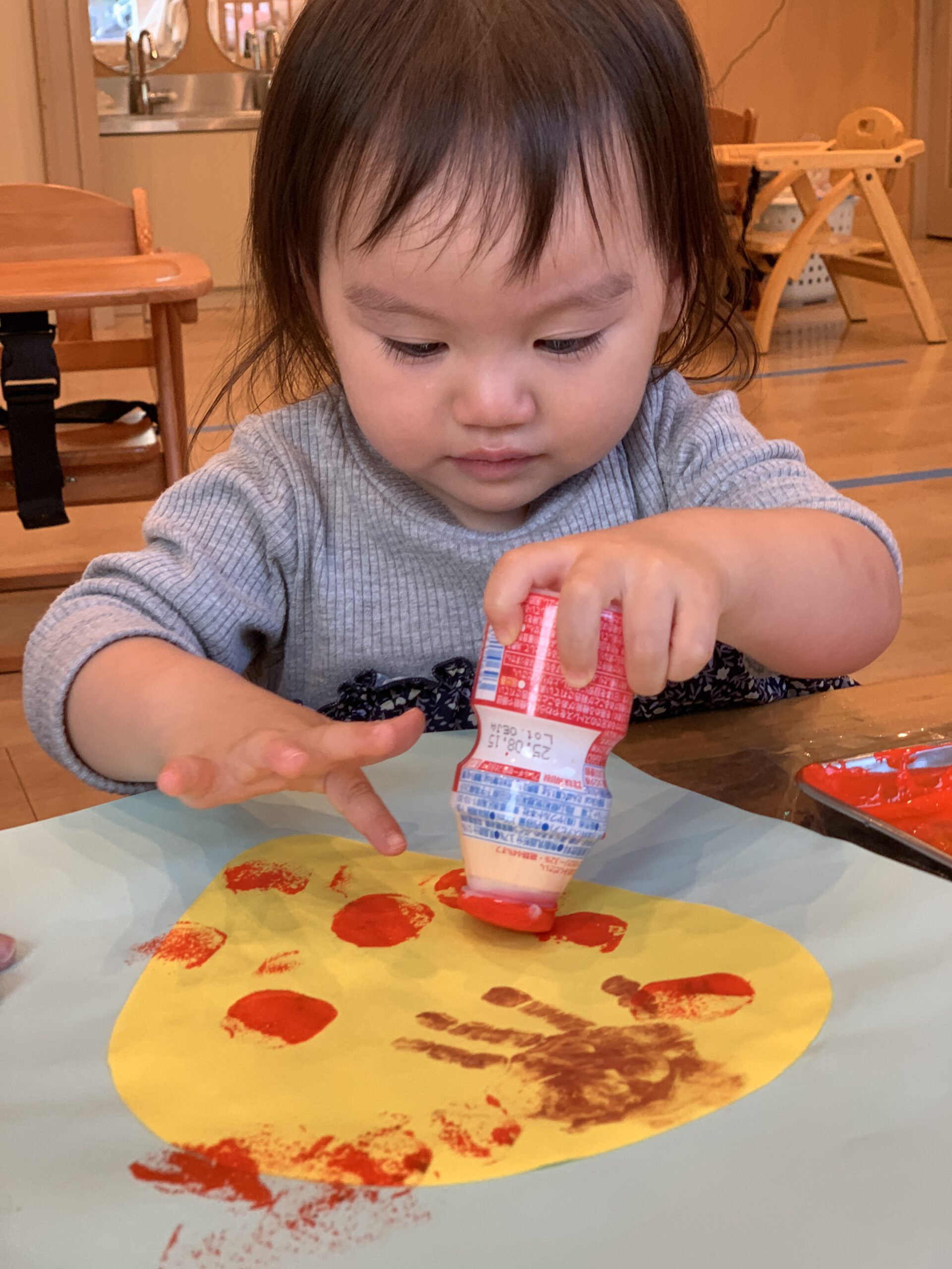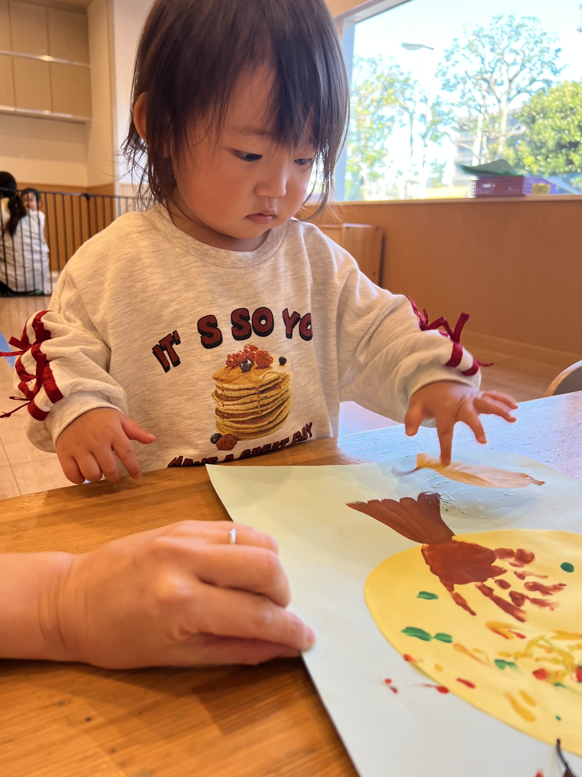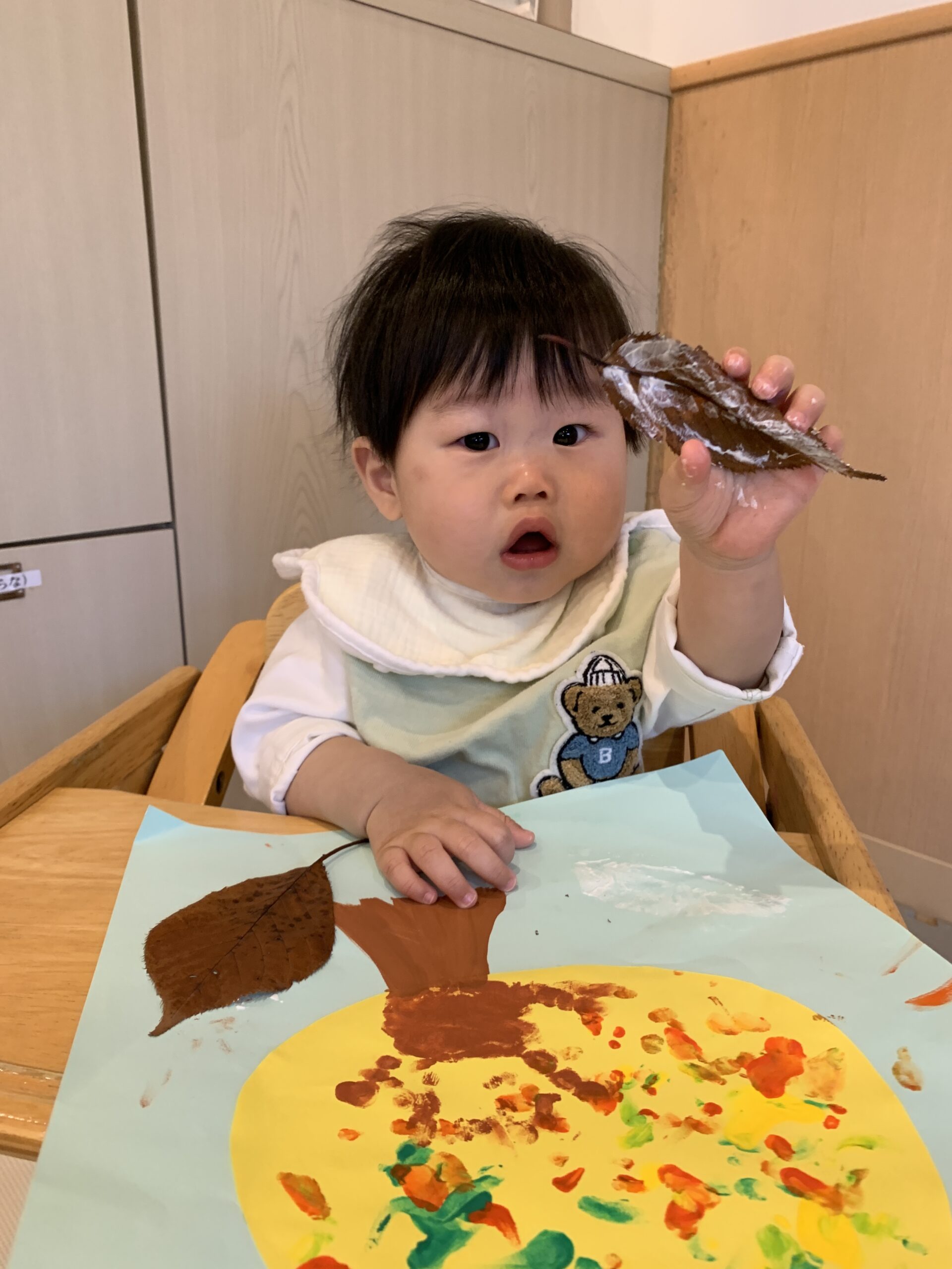 続いて、0歳児さんは紅葉の葉っぱを表現しました。