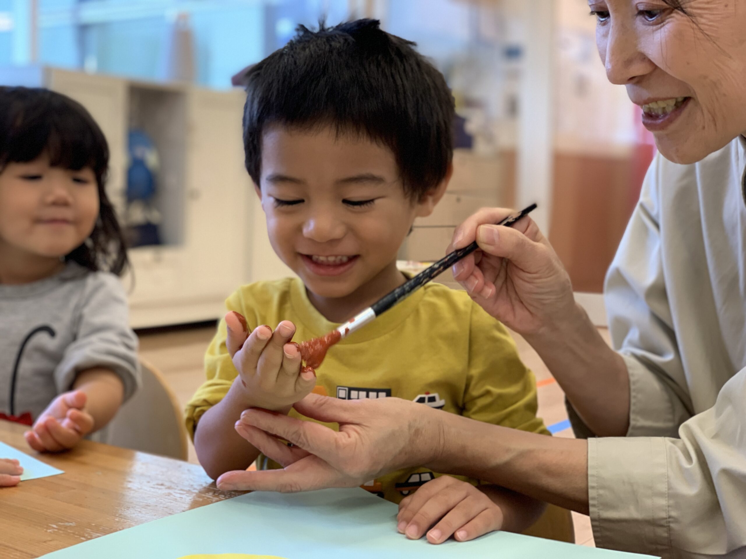 中には、絵の具が手に付くのが苦手な子もいましたが、保育士が隣にそっと寄り添い、一緒に筆を持って描いてみたり、指の代わりに筆を使ってみたりと、個別対応保育をしながら無理なく活動に参加できるよう工夫しました。