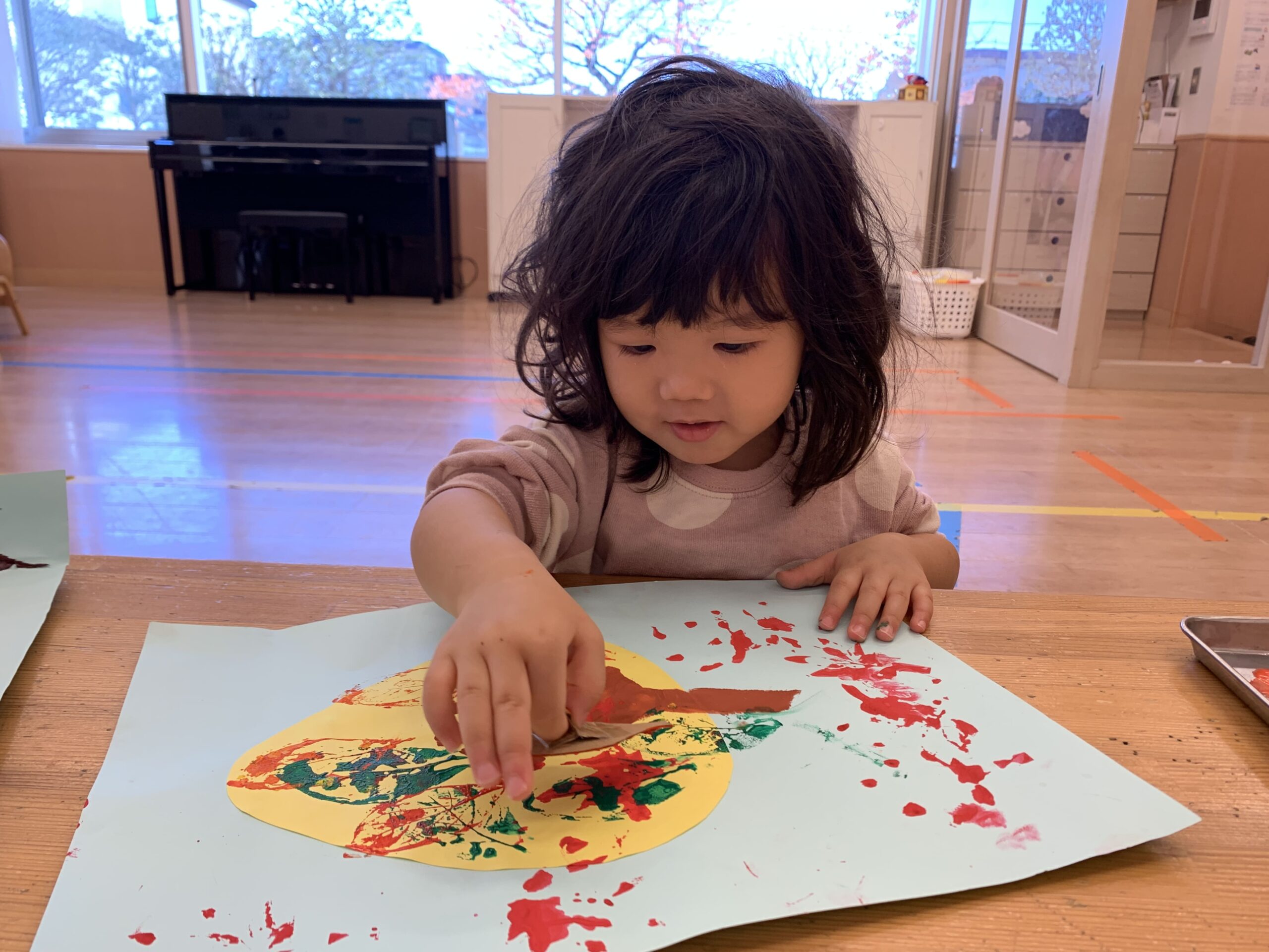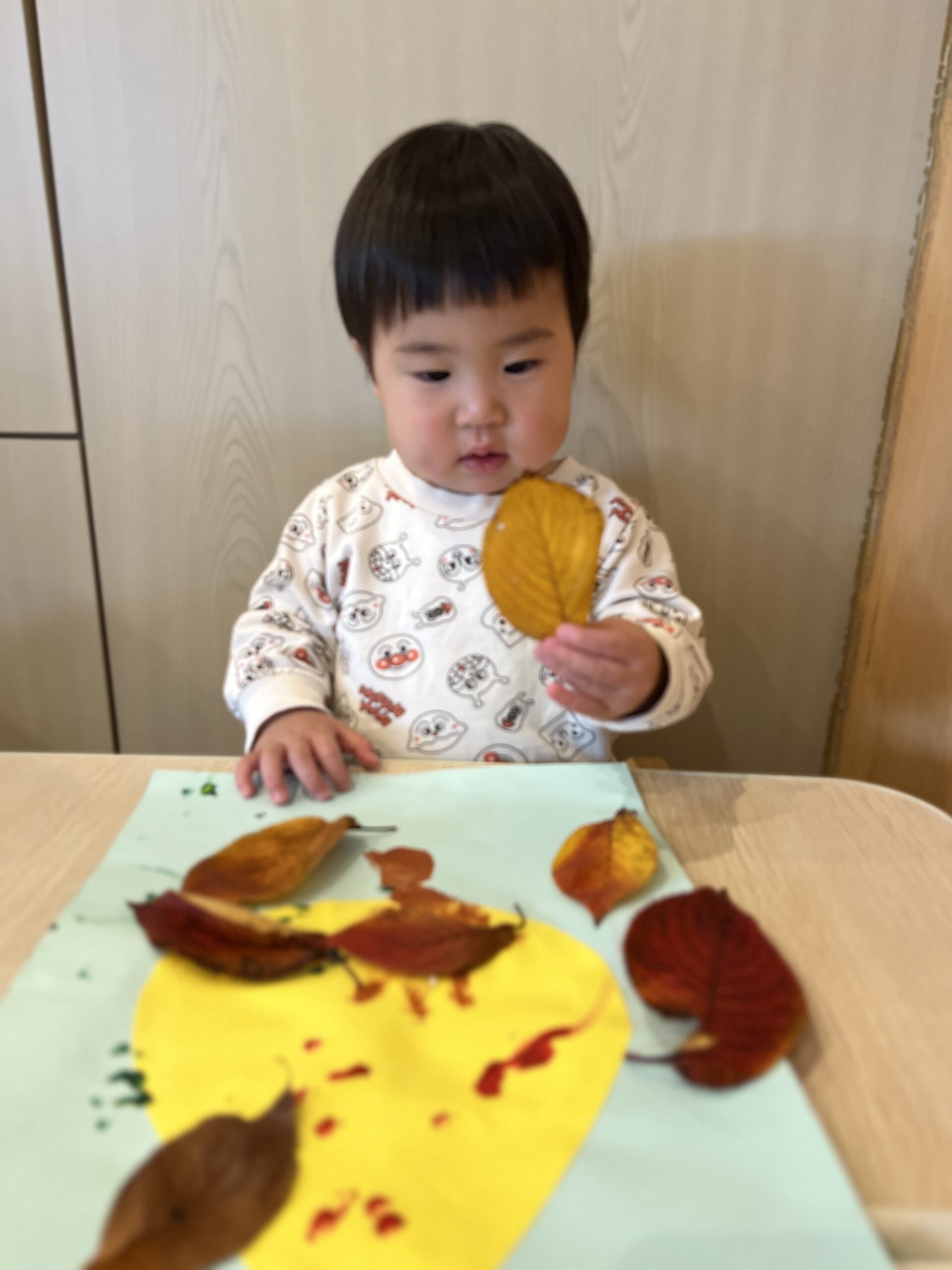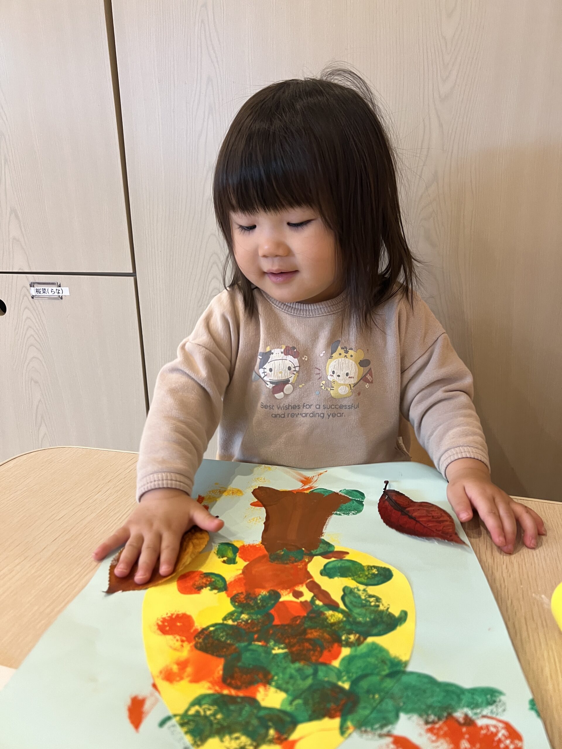2歳児さんのお友だちは、本物の葉っぱスタンプで色とりどりの紅葉を彩りました。
