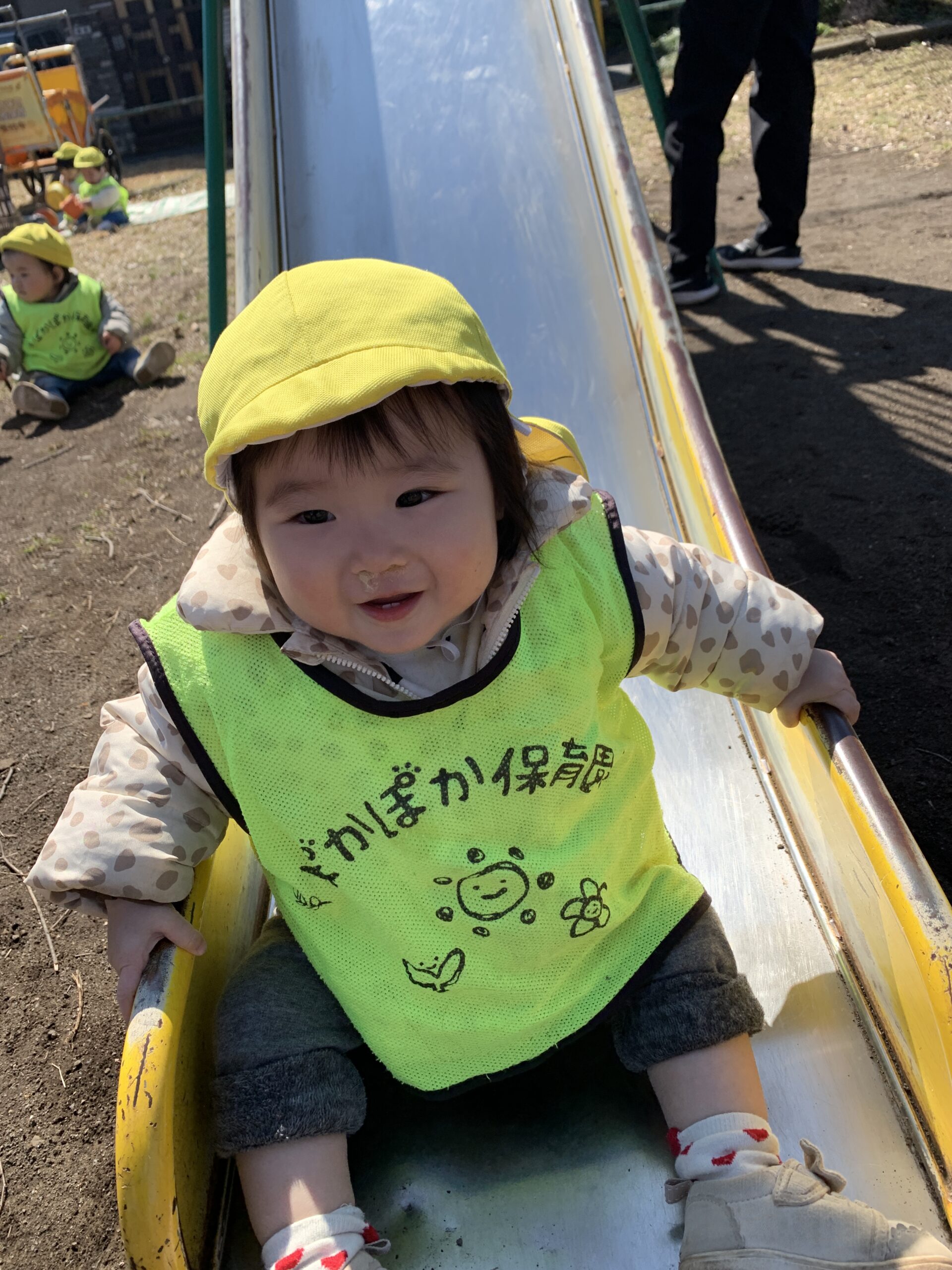 青空組さん(0歳・1歳児)は、公園に行って滑り台を楽しみました♪ 一段一段、一生懸命に登って、滑ると「わぁ!」と大きな声をあげて楽しんでました☆ 滑り台を上に降りたりすることで、体力やバランス感覚が育まれていきますね♪